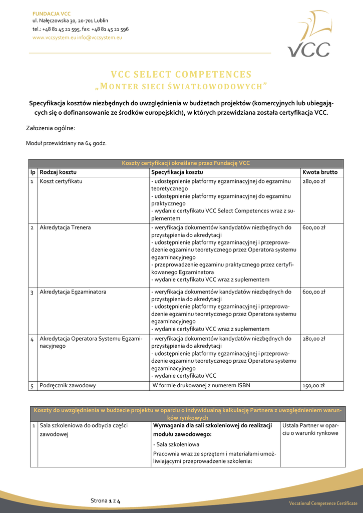 FUNDACJA VCC ul. Nałęczowska 30, 20-701 Lublin tel.: +48 81 45 21 595, fax: +48 81 45 21 596 www.vccsystem.eu [email protected] VCC SELECT COM PETENCES „MONTER SIECI ŚWIATŁOW ODOWYCH” Specyfikacja kosztów niezbędnych do uwzględnienia w budżetach projektów (komercyjnych lub ubiegających się o dofinansowanie ze środków europejskich), w których przewidziana została certyfikacja VCC. Założenia ogólne: Moduł przewidziany na 64 godz. Koszty certyfikacji określane przez Fundację VCC Specyfikacja kosztu - udostępnienie platformy egzaminacyjnej do egzaminu teoretycznego - udostępnienie platformy egzaminacyjnej do egzaminu praktycznego - wydanie certyfikatu VCC Select Competences wraz z suplementem lp Rodzaj kosztu 1 Koszt certyfikatu Kwota brutto 280,00 zł 2 Akredytacja Trenera - weryfikacja dokumentów kandydatów niezbędnych do przystąpienia do akredytacji - udostępnienie platformy egzaminacyjnej i przeprowadzenie egzaminu teoretycznego przez Operatora systemu egzaminacyjnego - przeprowadzenie egzaminu praktycznego przez certyfikowanego Egzaminatora - wydanie certyfikatu VCC wraz z suplementem 600,00 zł 3 Akredytacja Egzaminatora - weryfikacja dokumentów kandydatów niezbędnych do przystąpienia do akredytacji - udostępnienie platformy egzaminacyjnej i przeprowadzenie egzaminu teoretycznego przez Operatora systemu egzaminacyjnego - wydanie certyfikatu VCC wraz z suplementem 600,00 zł 4 Akredytacja Operatora Systemu Egzaminacyjnego - weryfikacja dokumentów kandydatów niezbędnych do przystąpienia do akredytacji - udostępnienie platformy egzaminacyjnej i przeprowadzenie egzaminu teoretycznego przez Operatora systemu egzaminacyjnego - wydanie certyfikatu VCC 280,00 zł 5 Podręcznik zawodowy W formie drukowanej z numerem ISBN 150,00 zł Koszty do uwzględnienia w budżecie projektu w oparciu o indywidualną kalkulację Partnera z uwzględnieniem warunków rynkowych 1 Sala szkoleniowa do odbycia części Wymagania dla sali szkoleniowej do realizacji Ustala Partner w oparciu o warunki rynkowe zawodowej modułu zawodowego: - Sala szkoleniowa Pracownia wraz ze sprzętem i materiałami umożliwiającymi przeprowadzenie szkolenia: Strona 1 z 4 FUNDACJA VCC ul. Nałęczowska 30, 20-701 Lublin tel.: +48 81 45 21 595, fax: +48 81 45 21 596 www.vccsystem.eu [email protected] Zestaw kabli światłowodowych jedno- i wielomodowych (Tabela 1), zestaw złączek (Tabela 2) oraz etykiety z opisem każdego rodzaju kabla i złączki. Striper. Obcinaczka włókien. Spawarka światłowodowa. Reflektometr. Kable rozbiegowe (Tabela 3)1. Mufa. Tacka. Włókno jedno- i wielomodowe o długości około 10 m (MATERIAŁ ZUŻYWALNY). Pigtaile jednomodowe i wielomodowe zakończone złączem SC o długości około 30 m (MATERIAŁ ZUŻYWALNY). Osłonki spawów o dowolnej długości (MATERIAŁ ZUŻYWALNY). Alkohol techniczny (MATERIAŁ ZUŻYWALNY). Chusteczki bezpyłowe (MATERIAŁ ZUŻYWALNY). Zespawane krótkie, kilkumetrowe odcinki kabla światłowodowego (10 szt.). - Pomieszczenie o odpowiedniej kubaturze w stosunku do liczby uczestników kursu, spełniająca wymogi obowiązujących przepisów BHP. 2 Wynagrodzenie trenera Wynagrodzenie trenera przeprowadzającego mo- Ustala Partner w oparduł zawodowy ciu o warunki rynkowe 3 Catering Zapewnienie cateringu podczas szkoleń 4 Sala egzaminacyjna do odbycia egzaminu zawodowego - zapewnienie sali wyposażonej w stanowiska komputerowe do przeprowadzenia części teoretycznej egzaminu zawodowego - zapewnienie sali egzaminacyjnej, wyposażonej w sposób umożliwiający przeprowadzenie praktycznej części egzaminu zawodowego Wymagania dla sali egzaminacyjnej: Zestaw kabli światłowodowych jedno- i wielomodowych (Tabela 1), zestaw złączek (Tabela 2) oraz etykiety z opisem każdego rodzaju kabla i złączki. 1 2 Tabele w zał.1 do dokumentu Tabele w zał.1 do dokumentu Strona 2 z 4 Striper. Obcinaczka włókien. Spawarka światłowodowa. Reflektometr. Kable rozbiegowe (Tabela 3)2. Ustala Partner w oparciu o warunki rynkowe Ustala Partner w oparciu o warunki rynkowe FUNDACJA VCC ul. Nałęczowska 30, 20-701 Lublin tel.: +48 81 45 21 595, fax: +48 81 45 21 596 www.vccsystem.eu [email protected] Mufa. Tacka. Włókno jedno- i wielomodowe o długości około 10 m (MATERIAŁ ZUŻYWALNY). Pigtaile jednomodowe i wielomodowe zakończone złączem SC o długości około 30 m (MATERIAŁ ZUŻYWALNY). Osłonki spawów o dowolnej długości (MATERIAŁ ZUŻYWALNY). Alkohol techniczny (MATERIAŁ ZUŻYWALNY). Chusteczki bezpyłowe (MATERIAŁ ZUŻYWALNY). Zespawane krótkie, kilkumetrowe odcinki kabla światłowodowego (10 szt.). 5 Wynagrodzenie Operatora Systemu Egzaminacyjnego - zapewnienie certyfikowanego Operatora SysUstala Partner w opartemu Egzaminacyjnego do przeprowadzenia czę- ciu o warunki rynkowe ści teoretycznej egzaminu zawodowego 6 Wynagrodzenie Egzaminatora - zapewnienie certyfikowanego Egzaminatora do przeprowadzenia części praktycznej egzaminu zawodowego Ustala Partner w oparciu o warunki rynkowe Specyfikacja materiałów niezbędnych do przeprowadzenia szkolenia i egzaminu: Tabela 1. Zestaw kabli światłowodowych L.p. Liczba modów Typ 1 Jednomodowy OS1 2 Jednomodowy OS1 3 Jednomodowy OS2 4 5 6 7 8 9 10 13 14 15 Jednomodowy Wielomodowy Wielomodowy Wielomodowy Wielomodowy Wielomodowy Wielomodowy Jednomodowy Wielomodowy Jednomodowy OS2 OM1 OM1 OM2 OM2 OM3 OM4 Stacyjny Stacyjny FTTH 16 Jedno- lub wielomodowy FTTD Strona 3 z 4 Rodzaj Grupa Uniwersalny zewn.wewn. Kanałowy Uniwersalny zewn.wewn. Kanałowy Rdzeń 62,5 µm Rdzeń 50 µm Rdzeń 62,5 µm Rdzeń 50 µm Rdzeń 50 µm Rdzeń 50 µm Rdzeń 9 µm Rdzeń 50 µm Rdzeń 9 µm Rdzeń 9 µm, 50 µm lub 62,5 µm I I II II III III IV IV V VI VII VII VIII IX FUNDACJA VCC ul. Nałęczowska 30, 20-701 Lublin tel.: +48 81 45 21 595, fax: +48 81 45 21 596 www.vccsystem.eu [email protected] Tabela 2. Zestaw złączek światłowodowych L.p. Typ Rodzaj Grupa 1 2 3 4 5 6 7 8 9 10 11 ST ST FC FC SC SC L