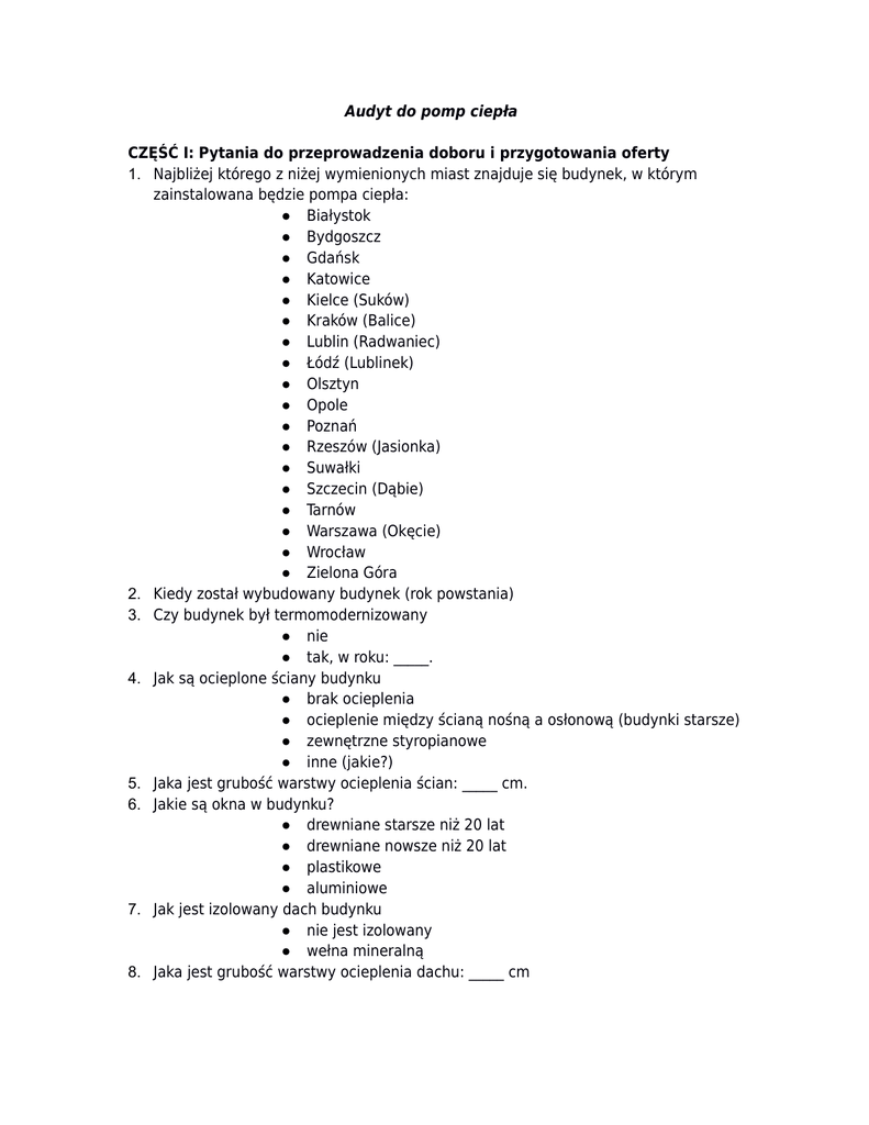 Audyt do pomp ciepła CZĘŚĆ I: Pytania do przeprowadzenia doboru i przygotowania oferty 1. Najbliżej którego z niżej wymienionych miast znajduje się budynek, w którym zainstalowana będzie pompa ciepła: ● Białystok ● Bydgoszcz ● Gdańsk ● Katowice ● Kielce (Suków) ● Kraków (Balice) ● Lublin (Radwaniec) ● Łódź (Lublinek) ● Olsztyn ● Opole ● Poznań ● Rzeszów (Jasionka) ● Suwałki ● Szczecin (Dąbie) ● Tarnów ● Warszawa (Okęcie) ● Wrocław ● Zielona Góra 2. Kiedy został wybudowany budynek (rok powstania) 3. Czy budynek był termomodernizowany ● nie ● tak, w roku: _____. 4. Jak są ocieplone ściany budynku ● brak ocieplenia ● ocieplenie między ścianą nośną a osłonową (budynki starsze) ● zewnętrzne styropianowe ● inne (jakie?) 5. Jaka jest grubość warstwy ocieplenia ścian: _____ cm. 6. Jakie są okna w budynku? ● drewniane starsze niż 20 lat ● drewniane nowsze niż 20 lat ● plastikowe ● aluminiowe 7. Jak jest izolowany dach budynku ● nie jest izolowany ● wełna mineralną 8. Jaka jest grubość warstwy ocieplenia dachu: _____ cm 9. Jakie są łączne powierzchnie pomieszczeń ogrzewanych poszczególnymi typami ogrzewania: ● pomieszczenia ogrzewane kaloryferami żeliwnymi, żeberkowymi (parametrem >55 ºC): _____ m2, ● pomieszczenia ogrzewane kaloryferami płytowymi (parametrem ~50 ºC): _____ m2, ● pomieszczenia ogrzewane podłogowo (parametrem ~35 ºC): _____ m2. 10. Jaka jest średnia wysokość ogrzewanych pomieszczeń: _____ m. 11. Jaki jest aktualnie używany system/urządzenie grzewcze: ● Kocioł węglowy sprzed 1980 roku ● Kocioł węglowy z lat 1980-2000 ● Kocioł węglowy po 2000 roku ● Kocioł na eko-groszek z podajnikiem automatycznym ● Kocioł na miał ● Kocioł na koks ● Kocioł wrzutowy na słomę z obsługą ręczną ● Kotły wrzutowy na biomasę z obsługą ręczną ● Kocioł na pellet z automatycznym podajnikiem ● Elektryczne grzejniki bezpośrednie: konwektorowe, płaszczowe, promiennikowe i podłogowe ● Ogrzewania podłogowe elektryczno-wodne ● Piec kaflowy ● Piec olejowy pomieszczeniowy ● Piec gazowy pomieszczeniowy na gaz ziemny ● Piec gazowy pomieszczeniowy na gaz LPG ● Kocioł gazowy z otwartą kom. sp. na gaz ziemny ● Kocioł gazowy z otwartą kom. sp. na gaz LPG ● Kocioł gazowy z zamkniętą kom. sp. na gaz ziemny ● Kocioł gazowy z zamkniętą kom. sp. na gaz LPG ● Kocioł gazowy kondensacyjny na gaz ziemny ● Kocioł gazowy kondensacyjny na gaz LPG ● Kocioł na olej opałowy 12. Aktualnie używane paliwo: ● Prąd ● Węgiel orzech ● Eko-groszek ● Miał ● Koks ● Pellet ● Drewno ● Słoma ● Gaz ziemny ● Gaz LPG ● Olej opałowy 13. Jakie jest aktualne roczne zużycie paliwa: _____ kWh/ton/kg/m3/litr. 14. Jaki jest koszt jednostki paliwa: _____ PLN za kWh/tonę/kg/m3/litr. 15. Jaka jest moc nominalna urządzenia aktualnie ogrzewającego budynek: _____ kW. 16. Jaka jest pojemność wodna instalacji grzewczej w budynku: _____ litrów. 17. Czy powyższe urządzenie ogrzewa też c.w.u.? ● tak ● nie 18. Ilu stałych użytkowników korzysta z c.w.u. w budynku: _____ osób. 19. Jakie jest zużycie dobowe c.w.u. na osobę: ● niskie - 40 l/os/dobę ● normalne - 50 l/os/dobę ● podwyższone - 60 l/os/dobę ● wysokie - 70 l/os/dobę 20. Czy w budynku znajdują się dodatkowe punkty poboru c.w.u. (np. wanna z hydromasażem, natryski przy basenie, pralka zasilana ciepłą wodą)? Jakie: _____________________________________________ . 21. Czy budynek jest wyposażony w rekuperację/wentylację mechaniczną? ● tak ● nie CZĘŚĆ II: Pytania audytowe do instalacji Przedmiot sprzedaży: 22. Jaką sprzedano podstawową pompę ciepła? ● Caldoris-HPM10 ● Caldoris-HPM14 ● Caldoris-HPM17 ● 2xCaldoris-HPM1 23. Jaka jest ustalona funkcjonalność pompy ciepła? c.o.+c.w.u. c.o. Lokalizacja pompy ciepła i zestawu. 24. Jaka będzie odległość zewnętrznego modułu p.c. od miejsca, w którym przewody będą przechodzić przez ścianę: _____ m. 25. Czy między zewnętrznym modułem p.c. a planowanym miejscem przejścia przez ścianę znajdują się przeszkody utrudniające prowadzenie rurociągu? ● nie ● chodnik ● podjazd ● altana ● inne (jakie?) 26. Jaka jest grubość ściany: _____ cm. 27. Jaka będzie odległość wewnątrz budynku od miejsca przejścia przewodów przez ścianę do planowanego podłączenia p.c. do instalacji grzewczej (miejsca gdzie znajduje się kocioł lub jest podłączenie dla nowego kotła): _____ m. 28. Jak będą prowadzone przewody z pomieszczenia, w którym są wprowadzone do budynku do pomieszczenia, w którym planowane jest podłączenie p.c. do instalacji grzewczej: ● podłączenie do instalacji grzewczej jest zaplanowane w tym samym pomieszczeniu, w którym znajduje się przejście przewodów z zewnątrz budynku ● podłączenie do instalacji grzewczej jest zaplanowane w innym pomieszczeniu niż to, w którym znajduje się przejście przewodów z zewnątrz budynku 29. Jaka jest wysokość pomieszczenia, w którym instalowane będą zasobnik c.w.u. i/lub bufor czynnika grzewczego współpracujące z pompą ciepła: _____ m. 30. Jaka jest szerokość najwęższych futryn lub przejść na drodze do pomieszczenia, w którym instalowane będą zasobnik c.w.u. i/lub bufor czynnika grzewczego współpracujące z pompą ciepła: _____ cm. 31. W jakim układzie c.o. pracuje urządzenie grzewcze? ● otwartym (naczynie przelewowe w najwyższym punkcie instalacji) ● zamkniętym (naczynie przeponowe) Charakterystyka energetyczna budynku 32. Czy w budynku jest elektryczne gniazdo siłowe/3-fazowe (~400 V, 50 Hz): ● tak ● nie 33. Jakiej mocy przyłącze elektryczne doprowadzone jest do budynku: _____ kW. 34. Jaka jest odległość od skrzynki bezpiecznikowej do miejsca, w którym będzie podpięta automatyka pompy:____ m. 35. Jakie bezpieczniki posiada klient - typ ___