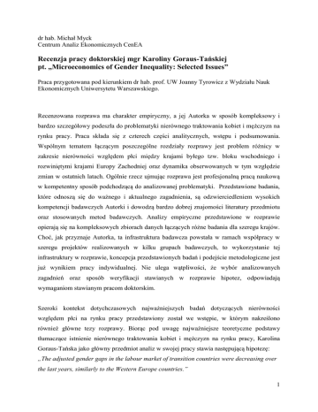 dr hab. Michał Myck Centrum Analiz Ekonomicznych CenEA Recenzja pracy doktorskiej mgr Karoliny Goraus-Tańskiej pt. „Microeconomics of Gender Inequality: Selected Issues” Praca przygotowana pod kierunkiem dr hab. prof. UW Joanny Tyrowicz z Wydziału Nauk Ekonomicznych Uniwersytetu Warszawskiego. Recenzowana rozprawa ma charakter empiryczny, a jej Autorka w sposób kompleksowy i bardzo szczegółowy podeszła do problematyki nierównego traktowania kobiet i mężczyzn na rynku pracy. Praca składa się z czterech części analitycznych, wstępu i podsumowania. Wspólnym tematem łączącym poszczególne rozdziały rozprawy jest problem różnicy w zakresie nierówności względem płci między krajami byłego tzw. bloku wschodniego i rozwiniętymi krajami Europy Zachodniej oraz dynamika obserwowanych w tym względzie zmian w ostatnich latach. Ogólnie rzecz ujmując rozprawa jest profesjonalną pracą naukową w kompetentny sposób podchodzącą do analizowanej problematyki. Przedstawione badania, które odnoszą się do ważnego i aktualnego zagadnienia, są odzwierciedleniem wysokich kompetencji badawczych Autorki i dowodzą bardzo dobrej znajomości literatury przedmiotu oraz stosowanych metod badawczych. Analizy empiryczne przedstawione w rozprawie opierają się na kompleksowych zbiorach danych łączących różne badania dla szeregu krajów. Choć, jak przyznaje Autorka, ta infrastruktura badawcza powstała w ramach współpracy w szeregu projektów realizowanych w kilku grupach badawczych, to wykorzystanie tej infrastruktury w rozprawie, koncepcja przedstawionych badań i podejście metodologiczne jest już wynikiem pracy indywidualnej. Nie ulega wątpliwości, że wybór analizowanych zagadnień oraz sposób weryfikacji stawianych w rozprawie hipotez, odpowiadają wymaganiom stawianym pracom doktorskim. Szeroki kontekst dotychczasowych najważniejszych badań dotyczących nierówności względem płci na rynku pracy przedstawiony został we wstępie, w którym nakreślono również główne tezy rozprawy. Biorąc pod uwagę najważniejsze teoretyczne podstawy tłumaczące istnienie nierównego traktowania kobiet i mężczyzn na rynku pracy, Karolina Goraus-Tańska jako główny przedmiot analiz w swojej pracy stawia następującą hipotezę: „The adjusted gender gaps in the labour market of transition countries were decreasing over the last years, similarly to the Western Europe countries.” 1 [pol.: „Skorygowane różnice w obserwowanych rezultatach osiąganych na rynku pracy względem płci zmniejszały się w ostatnich latach na rynkach pracy w krajach transformacji gospodarczej podobnie jak w krajach Europy Zachodniej.”] Główna hipoteza rozprawy poddana jest analizie w trzech kolejnych rozdziałach względem trzech zmiennych: różnic względem płci w poziomie zatrudnienia (Rozdział 1), różnic w poziomie wynagrodzeń (Rozdział 2) oraz różnic w prawdopodobieństwie zatrudnienia przy poziomie wynagrodzeń poniżej wysokości płacy minimalnej (Rozdział 3). Rozdział 4 jest w pewnym sensie uzupełnieniem analiz z Rozdziałów 2 i 3 i poświęcony jest zróżnicowaniu wynagrodzeń względem płci, opartym na danych pochodzących z rosyjskiego dużego przedsiębiorstwa przemysłowego. Choć analizy przedstawione w Rozdziale 4 bezpośrednio nie odnoszą się to hipotezy głównej, stanowią one wartościowe uzupełnienie pozostałych badań, między innymi ze względu na poszerzenie analiz o bardziej szczegółowe dane dotyczące pracowników oraz wyłączenie wpływu czynników miejsca zatrudnienia (ang. firm specific effects) poprzez ograniczenie się do danych z jednego przedsiębiorstwa. W każdym z czterech rozdziałów rozprawy, które poniżej omówione są bardziej szczegółowo, Autorka stawia interesujące i uzasadnione z punktu widzenia literatury przedmiotu szczegółowe pytania badawcze i w kompetentny sposób podchodzi do empirycznej ich weryfikacji. Weryfikacja tych zagadnień w kolejnych rozdziałach prowadzi Autorkę do wniosków, które wskazują na konieczność odrzucenia głównej hipotezy rozprawy: choć wnioski dla różnych zmiennych różnią się w poszczególnych krajach, to ogólnie rzecz biorąc w rozprawie nie potwierdzono malejących różnic w zatrudnieniu, wysokości płac i ryzyku zatrudnienia poniżej płacy minimalnej pomiędzy kobietami i mężczyznami w krajach transformacji gospodarczej. Biorąc pod uwagę uważne moim zdaniem uzasadnienie hipotezy głównej, uzyskane wyniki są z jednej strony zaskakujące, a z drugiej, jeśli nie z naukowego punktu widzenia (w końcu obalenie hipotezy jest tak samo istotne jak jej potwierdzenie), to przynajmniej z perspektywy oczekiwanych zmian społecznych, w jakimś stopniu rozczarowujące. Ogólne wnioski płynące z analiz stanowią ważny wynik, który w moim odczuciu pozwala na postawienie szeregu istotnych pytań dotyczących sukcesu transformacji i podziału korzyści z niej płynących. Wynik ten zasługuje na poważną, głęboka refleksję odnośnie zarówno czynników, które wyznaczają zakres nierówności na rynku pracy, jak i mechanizmów które za nimi stoją. Takiej refleksji niestety w rozprawie zabrakło, co biorąc 2 pod uwagę imponujący zakres przeprowadzonych analiz, pozostawia czytającego z odczuciem pewnego niedosytu. Charakterystyka poszczególnych rozdziałów rozprawy Rozdział 1 Tematem analiz Rozdziału 1 jest zróżnicowanie względem płci w zakresie zatrudnienia i opiera się o zbiory danych mikro pochodzące głównie z badań aktywności ekonomicznej (LFS, EU-LFS) z okresu od kilku do kilkudziesięciu lat, które uzupełnione zostały o szereg innych źródeł by poszerzyć zakres analiz w szczególności o kraje Europy Wschodniej. W konsekwencji Karolina Goraus-Tańska analizuje 1615 różnych baz danych dla 46 krajów. Głównym podejściem analitycznym jest metoda nieparametrycznej dekompozycji zaproponowana przez Ñopo (2008), a podstawowym wyni