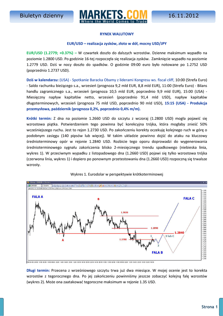 Biuletyn dzienny 16.11.2012 99 RYNEK WALUTOWY EUR/USD – realizacja zysków, złoto w dół, mocny USD/JPY EUR/USD (1.2779; +0.37%) – W czwartek doszło do dalszych wzrostów. Dzienne maksimum wypadło na poziomie 1.2800 USD. Po godzinie 16-tej rozpoczęła się realizacja zysków. Zamknięcie wypadło na poziomie 1.2779 USD. Dziś w nocy doszło do spadków. O godzinie 09:00 euro było notowane po 1.2752 USD (poprzednio 1.2737 USD). Dziś w kalendarzu: (USA) - Spotkanie Baracka Obamy z liderami Kongresu ws. fiscal cliff, 10:00 (Strefa Euro) - Saldo rachunku bieżącego s.a., wrzesień (prognoza 9,2 mld EUR, 8,8 mld EUR), 11:00 (Strefa Euro) - Bilans handlu zagranicznego s.a., wrzesień (prognoza 10,5 mld EUR, poprzednio 9,9 mld EUR), 15:00 (USA) Miesięczny napływ kapitałów netto, wrzesień (poprzednio 91,4 mld USD), napływ kapitałów długoterminowych, wrzesień (prognoza 75 mld USD, poprzednio 90 mld USD), 15:15 (USA) - Produkcja przemysłowa, październik (prognoza 0,2%, poprzednio 0,4% m/m). Krótki termin: Z dna na poziomie 1.2660 USD do szczytu z wczoraj (1.2800 USD) mogła pojawić się wzrostowa piątka. Potwierdzeniem tego powinna być korekcyjna trójka, która mogłaby znieść 50% wcześniejszego ruchu. Jest to rejon 1.2730 USD. Po zakończeniu korekty oczekuję kolejnego ruch w górę o podobnym zasięgu (140 pipsów lub więcej). W takim układzie powinno dojść do ataku na kluczowy średnioterminowy opór w rejonie 1.2840 USD. Rozbicie tego oporu doprowadzi do wygenerowania średnioterminowego sygnału zakończenia blisko 2-miesięcznego trendu spadkowego (niebieska linia, wykres 1). W przeciwnym wypadku z listopadowego dna (1.2660 USD) pojawi się tylko wzrostowa trójka (czerwona linia, wykres 1) i dopiero po ponownym przetestowaniu dna (1.2660 USD) rozpoczną się trwalsze wzrosty. Wykres 1. Eurodolar w perspektywie krótkoterminowej Długi termin: Przecena z wrześniowego szczytu trwa już dwa miesiące. W mojej ocenie jest to korekta wzrostów z tegorocznego dna. Po jej zakończeniu powinniśmy jeszcze zobaczyć kolejną falę wzrostów (wykres 2). Może ona zaatakować tegoroczne maksimum w rejonie 1.35 USD. Strona 1 Biuletyn dzienny 16.11.2012 99 Wykres 2. Eurodolar w perspektywie średnioterminowej USD/PLN – W czwartek kurs dolara spadał do dziennego dna na poziomie 3.2388 PLN (poprzednio 3.2589 PLN), po godzinie 16-tej doszło do odbicia. Zamknięcie wypadło po 3.2467 PLN. Dziś rano o godzinie 09:00 dolar był notowany po 3.2545 PLN (poprzednio 3.2765 PLN). Wykres 3. Dolar amerykański w relacji do złotego (USD/PLN) Wydaje się, że kilka dni temu mogło dojść do przesilenia. Sprawdzianem tej tezy powinno być jedynie korekcyjne cofnięcie pod listopadowy szczyt (3.0378 PLN) a potem dalsze spadki. Po przełamaniu przez eurodolar oporu w rejonie 1.2840 USD powinna pojawić się kolejna fala umocnienia złotego (wykres 3). Kurs dolara mógłby wrócić na tegoroczne minimum. Sygnał pojawi się po przełamaniu wsparcia w rejonie szczytu fali (A) na poziomie 3.22 PLN. Strona 2 Biuletyn dzienny 16.11.2012 99 EUR/PLN – W czwartek kurs euro spadał do dziennego dna na poziomie 4.1445 PLN (poprzednio 4.1628 PLN), po godzinie 16-tej doszło do odbicia. Zamknięcie nastąpiło na poziomie 4.1545 PLN. Dziś rano o godzinie 09:00 euro było notowane po 4.1510 PLN (poprzednio 4.1725 PLN). Wykres 4. Euro w relacji do złotego (EUR/PLN) W perspektywie krótkoterminowej możliwe są już raczej tylko korekcyjne wzrosty bez przekraczania listopadowego szczytu (4.1908 PLN). W dalszej perspektywie gdy eurodolar przełamie opór w rejonie 1.2840 USD oczekuję na kolejną falę umocnienia złotego (wykres 4). W ciągu kilku miesięcy kurs euro może zejść w rejon tegorocznego dna (4.02 PLN) i niżej. Kontrakty CFD na złoto - Od 2 tygodni trwa odbicie. Dotarło ono 9-go listopada do pułapu 1738.55 USD. W poniedziałek przekroczone zostało ważne wsparcie w rejonie 1727 USD. Rozbicie tego wsparcia powinno doprowadzić do głębszych spadków (wykres 5). Dotarły one do 1704.5 USD, dziś rano o godzinie 09:00 kontrakty były notowane po 1714 USD. Wykres 5. Kontrakty CFD na złoto Strona 3 Biuletyn dzienny 16.11.2012 99 W perspektywie najbliższych dni oczekuję spadków. Wsparcie znajduje się w rejonie 1700 USD. Dopiero potem rozpocznie się kolejna fala wzrostów w ramach fali (C). Miesięczna fala spadków miała zasięg aż 124 dolarów. W mojej ocenie była to spadkowa piątka. Obecnie powinniśmy znajdować się w dużej korekcie typu (a-b-c). Zasięg korekty można szacować na 1750 dolarów. Opór w rejonie 1755 USD powinien być poza zasięgiem popytu. Po zakończeniu korekty (a-b-c) kurs złota mógłby przez kilka tygodni spadać i zejść do długoterminowego wsparcia w rejonie 1640 dolarów za uncję. Dopiero potem rozpoczęłaby się trwalsza tendencja wzrostowa. USD/JPY – Z dna z końca września pojawiła się ładna 5-falowa struktura. W perspektywie krótkoterminowej możliwe są niewielkie wzrosty i dokończenie fali piątej (wykres 6). Potem oczekuję na korektę. Sygnał pojawi się po przebiciu wsparć w rejonie 80.30-80.45 JPY. Wykres 6. Dolar w relacji do jena (USD/JPY) Spadki mogą znieść od 38% do 50% kilkutygodniowej fali wzrostowej. Powinno być respektowane wsparcie w rejonie 78.90 JPY. Po zakończeniu korekty oczekuję kolejnej kilkutygodniowej fali wzrostów. Sławomir Dębowski Markets.com Niniejsza publikacja została przygotowana przez Safecap Investments (Poland) Sp. z o.o. i jest dostarczona wyłącznie w celach informacyjnych. Przeznaczona jest dla inwestorów, którzy nie podejmują swoich decyzji inwestycyjnych w oparciu o nią. Inwestorzy powinni mieć swoją własną ocenę co do właściwości i celowości inwestowania w którykolwiek z wymienianych instrument finansowy, opartą na analizie danego instrumentu, ryzyka z nim związanego, ich własnej strategii inwestycyjnej oraz przy uwzględnieniu ich prawnej, podatko