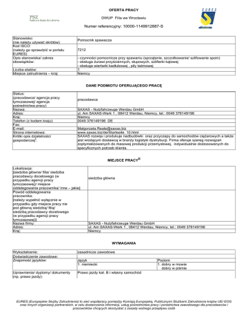 OFERTA PRACY DWUP Filia we Wrocławiu Numer referencyjny: 10000-1149912887-S Stanowisko: (nie należy używać skrótów) Kod ISCO: (należy go sprawdzić w portalu EURES) Opis stanowiska/ zakres obowiązków: Liczba etatów: Miejsce zatrudnienia – kraj: Pomocnik spawacza 7212 - czynności pomocnicze przy spawaniu (sprzątanie, szczotkowanie/ szlifowanie spoin) - obsługa żurawi przyściennych, słupowych, szlifierki kątowej - obsługa wiertarki kadłubowej , piły taśmowej 1 Niemcy DANE PODMIOTU OFERUJĄCEGO PRACĘ Status: (pracodawca/ agencja pracy tymczasowej/ agencja pośrednictwa pracy) Nazwa: Adres: Kraj: Telefon (z kodem kraju): Fax: E-mail: Strona internetowa: Krótki opis działalności gospodarczeji: pracodawca SAXAS - Nutzfahrzeuge Werdau GmbH ul. Am SAXAS-Werk 1 , 08412 Werdau, Niemcy, tel.: 0049 376149196 Niemcy 0049 376149196 DE [email protected] www.saxas.biz/de/Startseite_10.html SAXAS rozwija i produkuje nadbudówki oraz przyczepy do samochodów ciężarowych a także jest wiodącym dostawcą w branży logistyki dystrybucji. Firma oferuje szereg rozwiązań zoptymalizowanych do masowej produkcji przemysłowej, indywidualnie dostosowanych do specyficznych potrzeb klienta. MIEJSCE PRACYii Lokalizacja: [siedziba główna/ filia/ siedziba pracodawcy docelowego (w przypadku agencji pracy tymczasowej)/ miejsce oddelegowania pracownika/ inne – jakie] Powód oddelegowania pracownika: [należy wypełnić wyłącznie w przypadku gdy miejsce pracy nie jest główną siedzibą/ filią/ siedzibą pracodawcy docelowego (w przypadku agencji pracy tymczasowej)] Nazwa firmy: Adres: Kraj: siedziba główna SAXAS - Nutzfahrzeuge Werdau GmbH ul. Am SAXAS-Werk 1 , 08412 Werdau, Niemcy, tel.: 0049 376149196 Niemcy WYMAGANIA Wykształcenie: Doświadczenie zawodowe: Znajomość języków: zasadnicze zawodowe Uprawnienia/ dyplomy/ dokumenty (np. prawo jazdy): Prawo jazdy kat. B i własny samochód Język 1. niemiecki Poziom 1. dobry w mowie dobry w piśmie EURES (Europejskie Służby Zatrudnienia) to sieć współpracy pomiędzy Komisją Europejską, Publicznymi Służbami Zatrudnienia krajów UE/ EOG oraz innych organizacji partnerskich, w celu dostarczania informacji, usług pośrednictwa pracy i poradnictwa zawodowego dla pracodawców i pracowników chcących skorzystać z zasady wolnego przepływu osób Inne istotne wymagania: • Wykształcenie: zawodowe lub średnie techniczne • Doświadczenie zawodowe: podstawowe umiejętności w spawaniu MAG; mile widziane doświadczenie w obsłudze żurawi przyściennych i słupowych, szlifierki kątowej i wiertarki kadłubowej • Znajomość języków: niemiecki - komunikatywny – min. A2 wymagany • Prawo jazdy kat. B i własny samochód • Umiejętność obsługi komputera • Zmysł manualny, niezawodność, elastyczność, samodzielność Staż ogółem: 1.0 WYNAGRODZENIE I WARUNKI ZATRUDNIENIA Wysokość pensji brutto: Wysokość pensji netto: Waluta, w jakiej wypłacana jest pensja: Rodzaj stawki wynagrodzenia: (godzinowa/ tygodniowa/ miesięczna/ roczna/ inna) Premie: Dodatkowe świadczenia (zakwaterowanie, wyżywienie, koszty związane ze zmianą miejsca zamieszkania, koszty podróży itp.): Nazwa firmy, z którą zostanie podpisana umowa: Rodzaj umowy: (umowa o pracę, umowa zlecenia, wolontariat, praktyka zawodowa/ staż, praca zdalna, agencja pracy tymczasowej, inne): Wymiar czasu pracy (praca na pełen etat/ część etatu): Czas trwania umowy: (nieokreślony/ określony) 9,00 Liczba godzin tygodniowo: Zmiany i praca w dni wolne: Data rozpoczęcia: Inne informacje: 38,00 Praca na 2 zmiany – poranna i popołudniowa 2017-02-13 Po pozytywnym przejściu rozmowy kwalifikacyjnej, kandydat zostaje zaproszony na 5 dni próbnych do Niemiec. Koszty zakwaterowanie stoją po stronie pracodawcy, natomiast podróż kandydat opłaca we własnym zakresie. Wysokość pensji brutto: 9 Euro / godz. + dieta 25 Euro / dzień Jeśli ktoś przepracuje więcej niż 38 godzin tygodniowo, nadgodziny są przenoszone do „konta nadgodzin” i po uzbieraniu 200 nadgodzin są wypłacane w formie pieniężnej lub w formie czasu wolnego. Euro Czasowy ze stawką godzinową istnieje możliwość zakwaterowania na własny koszt, - pracodawca organizuje i opłaca zakwaterowanie, które jest płatne przez pracownika w wysokości ok. 80 – 100 Euro / tydzień. - opieka polskojęzycznego pracownika firmy SAXAS - Nutzfahrzeuge Werdau GmbH umowa o pracę etat nieokreślony Data wygaśnięcia umowy (w przypadku umowy na czas określony): SPOSÓB SKŁADANIA WNIOSKU Wymagane dokumenty (list motywacyjny, CV itp.): Język, w którym muszą być sporządzone przedkładane dokumenty: Do kogo należy wysłać dokumenty: (do pracodawcy/ doradcy EURES) Gdzie należy wysłać dokumenty: (adres, adres e-mail, nr faksu z kodem kraju itp.) CV i dokumenty potwierdzające kwalifikacje zawodowe niemiecki do pracodawcy Na adres e-mail: [email protected] W tytule maila proszę wpisać: „Helfer/in im Bereich Schweißen” Lub pocztą tradycyjną na adres: SAXAS - Nutzfahrzeuge Werdau GmbH Am SAXAS-Werk 1 08412 Werdau, Sachsen Sachsen Deutschland Z dopiskiem: „Helfer/in im Bereich Schweißen” Dane teleadresowe doradcy EURES lub przedstawiciela pracodawcy: Pani Małgorzata Reale – 0049 376 149 196 - informacje w j. polskim EURES (Europejskie Służby Zatrudnienia) to sieć współpracy pomiędzy Komisją Europejską, Publicznymi Służbami Zatrudnienia krajów UE/ EOG oraz innych organizacji partnerskich, w celu dostarczania informacji, usług pośrednictwa pracy i poradnictwa zawodowego dla pracodawców i pracowników chcących skorzystać z zasady wolnego przepływu osób (nazwisko, adres, telefon, fax, e-mail itp.) DODATKOWE INFORMACJE WAŻNOŚĆ 2017-02-13 Data publikacji: Termin przedkładania podań o pracę / zakończenia ważności oferty: Uprzejmie informujemy, że skontaktujemy się wyłącznie z wybranymi kandydatami. UWAGA: 1. Umowa z zagranicznym pracodawcą jest z