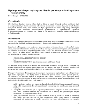 Bycie prawdziwym mężczyzną i bycie podobnym do Chrystusa to synonimy Nowy Tomyśl – 23.12.2012 Przywitanie Chwała Bogu Bracia i siostry, dobrze być tu dzisiaj z wami. Wczoraj miałem możliwość być z naszą młodzieżą w Świebodzinie na całodniowej konferencji i pomimo tego, że to był dla nas wszystkich bardzo dobry czas, dobrze jest być z powrotem w domu. Przy okazji chciałbym przekazać wam serdeczne chrześcijańskie pozdrowienie i najwspanialsze życzenia i błogosławieństwa od Pastora, od zboru i od młodzieży kościoła zielonoświątkowego w Świebodzinie. Przedmowa Temat, który zostanie dzisiaj przeze mnie poruszony stał się od prawie pół roku integralną częścią mojego życia. Osobiście go bardzo przeżywam i dotyka mnie on każdego dnia. Zaczęło się od tego, że pewna znajoma w czerwcu zadała mi jedno pytanie, w którym było masę złości, rozpaczy i bezsilności. Wierzę, że zadała je nie to po, aby mnie zawstydzić, tylko pobudzić do działania. Wierzę także, że jest to pytanie, które każdy z nas powinien zadawać sobie każdego dnia. Wiem, że moja pamięć do przytaczania różnych wypowiedzi nie jest zbyt najlepsza, ale parafrazując to pytanie, brzmiało ono tak: • • CO SIĘ Z WAMI MĘŻCZYZNAMI DZIEJE? lub GDZIE CI MĘŻCZYŹNI? (jak śpiewała zmarła już Danuta Rinn) Na początku, kiedy zadała mi to pytanie, nie rozumiałem, za bardzo, o co jej chodzi. Zacząłem się później zastanawiać i studiować Boże Słowo pod tym kątem. Nie tylko ja zacząłem zgłębiać ten temat, ale Bóg zaczął uczyć mnie i dotykać tym, co znaczy być prawdziwym mężczyzną. Dlatego wybaczcie mi dzisiaj, proszę, że skupię się wyłącznie na mężczyźnie i tym jaki powinien być Boży mężczyzna i nie będę mówił o kobietach prawie wcale. Jestem jednak pewien, że wszystko, co powiem, będzie z pożytkiem dla kobiet, ponieważ jeśli mężczyźni będą prawdziwymi mężami Bożymi, to będą lepszymi mężami i ojcami co będzie miało wpływ nie tylko na ich życie, ale także na ich żony i całe rodziny. • • • Jeśli więc jesteś mężem czy ojcem, to kazanie jest dla Ciebie Bracie, ponieważ będziesz mógł sobie przypomnieć albo uświadomić, jeśli jeszcze tego nie zrobiłeś, do czego powołał Cię Bóg. Jeśli jesteś kawalerem lub jak to się raczej obecnie mówi singlem, to także jest to Słowo dla Ciebie, ponieważ możesz się dowiedzieć, co to znaczy być prawdziwym Bożym mężczyzną i do czego powinieneś dążyć. Jeśli jesteś kobietą, zamężną czy nie zamężną, to także będzie to Słowo z korzyścią dla Ciebie, ponieważ dowiesz się lub przypomnisz sobie, czego możesz i powinnaś oczekiwać od mężczyzn, a przede wszystkim od tego najważniejszego po Jezusie 1 mężczyzny w Twoim życiu. Modlitwa Pozwólcie, proszę, że pomodlę się, aby to Słowo, które będę wam zwiastował, trafiało do waszych serc i abyście nie poprzestali tylko i wyłącznie na wysłuchaniu, ale abyście je także przemyśleli i zastosowali, jeśli Bóg da wam jego zrozumienie. Wstęp Na początek mam pytanie do Zboru, co waszym zdaniem odróżnia mężczyznę od chłopca? Dodam, że wcale nie chodzi mi o brodę ;) • ODPOWIEDZIALNOŚĆ Granica pomiędzy byciem chłopcem a mężczyzną zaczyna się tam, gdzie pojawia się odpowiedzialność za życie samego siebie i innych. Będę dzisiaj używał wielu ilustracji i przykładów, ponieważ mężczyźni potrzebują wzorów), wiem o tym bo sam tak mam. Kiedy mężczyzna idzie na zakupy potrzebuje listy. Wiecie dlaczego? Ponieważ musi mieć jakiś wzór, do którego może się odwołać. Odpowiedzialność za siebie Odpowiedzialność za swoje życie Nie wiem czy wiecie o tym, że w większości plemion afrykańskich i południowoamerykańskich chłopcy, którzy chcą zostać mężczyznami, muszą się wykazać. Muszą przejść przez proces zwany inicjacją, dopiero kiedy go ukończą, zostają uznani przez resztę plemienia za mężczyzn. Nie ma tam żadnej formalnej granicy wiekowej dla małżeństwa, bo jest to sprawa bardzo indywidualna. Każdy chłopiec, który chciałby zostać mężem, musi najpierw zostać mężczyzną. Musi zbudować swój własny dom, czy raczej szałas. Musi sam się utrzymywać pracą własnych rąk. Dopiero wtedy, jak już usamodzielni się i udowodni sobie, jak i reszcie plemienia, że jest odpowiedzialnym człowiekiem, może myśleć o małżeństwie. I wiecie co? To jest bardzo biblijne. Niesamowitym jest to, że Bóg zaszczepił Swoje prawa w każdym człowieku niezależnie od tego gdzie i kiedy się urodził. Bóg stworzył wszystkich ludzi i każdego z nas obowiązują Jego zasady. Księga Rodzaju 2:24 Dlatego opuści mąż ojca swego i matkę swoją i złączy się z żoną swoją, i staną się jednym ciałem. Biblia jasno i wyraźnie uczy nas, że mężczyzna, aby móc poślubić kobietę, musi opuścić swojego ojca i swoją matkę. Nie oznacza to koniecznie wyprowadzki przed małżeństwem, chociaż byłaby ona z pewnością pomocna. Chodzi tu raczej przynajmniej o usamodzielnienie się. Bóg chce, aby mężczyzna był odpowiedzialny sam za siebie. Musi sam się utrzymywać, aby był w stanie utrzymać także swoją przyszłą rodzinę. Skąd ma wiedzieć, jak trudne jest to zadanie, jeśli całe życie za wszystko płacą za niego rodzice? Kiedy byłem w Kolegium Językowym w Starym Tomyślu, mieszkał tam w akademiku pewien 2 20 letni chłopak. Był on kompletnym zaprzeczeniem bycia odpowiedzialnym za siebie. Mieszkał zaledwie kilka metrów nad salami wykładowymi, ale najczęściej spóźniał się na zajęcia, ponieważ nie był w stanie wstać na odpowiednią godzinę. Nie uczył się wcale i całymi dniami przesiadywał w sali komputerowej, grając w różne gry. Co gorsze, oszukiwał rodziców, że dobrze mu idzie i że jest już na 2 czy 3 roku studiów, podczas gdy zawalał egzamin za egzaminem i cały cz