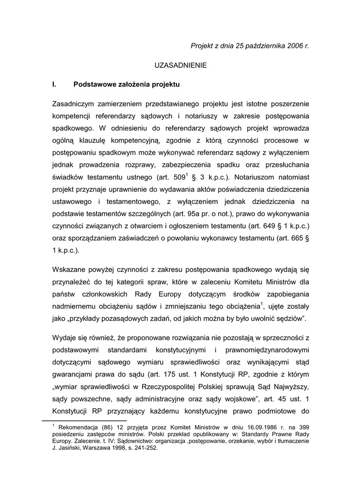 Projekt z dnia 25 października 2006 r. UZASADNIENIE I. Podstawowe załoŜenia projektu Zasadniczym zamierzeniem przedstawianego projektu jest istotne poszerzenie kompetencji referendarzy sądowych i notariuszy w zakresie postępowania spadkowego. W odniesieniu do referendarzy sądowych projekt wprowadza ogólną klauzulę kompetencyjną, zgodnie z którą czynności procesowe w postępowaniu spadkowym moŜe wykonywać referendarz sądowy z wyłączeniem jednak prowadzenia rozprawy, zabezpieczenia spadku oraz przesłuchania świadków testamentu ustnego (art. 5091 § 3 k.p.c.). Notariuszom natomiast projekt przyznaje uprawnienie do wydawania aktów poświadczenia dziedziczenia ustawowego i testamentowego, z wyłączeniem jednak dziedziczenia na podstawie testamentów szczególnych (art. 95a pr. o not.), prawo do wykonywania czynności związanych z otwarciem i ogłoszeniem testamentu (art. 649 § 1 k.p.c.) oraz sporządzaniem zaświadczeń o powołaniu wykonawcy testamentu (art. 665 § 1 k.p.c.). Wskazane powyŜej czynności z zakresu postępowania spadkowego wydają się przynaleŜeć do tej kategorii spraw, które w zaleceniu Komitetu Ministrów dla państw członkowskich Rady Europy dotyczącym środków zapobiegania nadmiernemu obciąŜeniu sądów i zmniejszaniu tego obciąŜenia1, ujęte zostały jako „przykłady pozasądowych zadań, od jakich moŜna by było uwolnić sędziów”. Wydaje się równieŜ, Ŝe proponowane rozwiązania nie pozostają w sprzeczności z podstawowymi standardami konstytucyjnymi i prawnomiędzynarodowymi dotyczącymi sądowego wymiaru sprawiedliwości oraz wynikającymi stąd gwarancjami prawa do sądu (art. 175 ust. 1 Konstytucji RP, zgodnie z którym „wymiar sprawiedliwości w Rzeczypospolitej Polskiej sprawują Sąd NajwyŜszy, sądy powszechne, sądy administracyjne oraz sądy wojskowe”, art. 45 ust. 1 Konstytucji RP przyznający kaŜdemu konstytucyjne prawo podmiotowe do 1 Rekomendacja (86) 12 przyjęta przez Komitet Ministrów w dniu 16.09.1986 r. na 399 posiedzeniu zastępców ministrów. Polski przekład opublikowany w: Standardy Prawne Rady Europy. Zalecenie. t. IV: Sądownictwo: organizacja ,postępowanie, orzekanie, wybór i tłumaczenie J. Jasiński, Warszawa 1998, s. 241-252. 2 „sprawiedliwego i jawnego rozpatrzenia sprawy bez nieuzasadnionej zwłoki przez właściwy, niezaleŜny, bezstronny i niezawisły sąd” oraz norma zawarta w art. 77 ust. 2 Konstytucji RP przewidująca zakaz zamykania drogi sądowej do dochodzenia naruszonych praw i wolności, a takŜe art. 6 ust. 1 Europejskiej Konwencji o Ochronie Praw Człowieka i Podstawowych Wolności i art. 14 ust. 1 Międzynarodowego Paktu Praw Obywatelskich i Politycznych). Sam charakter spraw wskazanych powyŜej przemawia za przyjęciem tezy, zgodnie z którą sprawy te przynaleŜą raczej do kategorii spraw z zakresu szeroko rozumianej „ochrony prawnej”, aniŜeli „wymiaru sprawiedliwości”. Chodzi tu bowiem o zakres zagadnień, w których – najogólniej rzecz ujmując – nie występuje element bezpośredniego rozstrzygania sporów prawnych wynikających z norm prawa cywilnego, karnego i administracyjnego, co w świetle poglądów doktryny i Trybunału Konstytucyjnego stanowi o istocie sądowego wymiaru sprawiedliwości (tak m.in. wyrok z 10.05.2000 r., K. 21/99, OTK 2000, z. 4, poz. 109). Zagadnienie to szczególnie dobrze widoczne jest w przypadku powierzenia notariuszom sporządzania aktów poświadczenia dziedziczenia. Zgodnie z rozwiązaniami proponowanymi w projekcie, warunkiem sporządzenia przez notariusza poświadczenia dziedziczenia jest zgodny wniosek wszystkich uczestników tego postępowania (wszystkich osób, które mogą wchodzić w rachubę jako spadkobiercy ustawowi i testamentowi – art. 95c § 2 pkt 1 w zw. z art. 95b pr. o not.). W efekcie więc poświadczenie dziedziczenia obejmować będzie jedynie sprawy niesporne. JeŜeli pomiędzy spadkobiercami istnieje jakikolwiek spór w tym zakresie, bądź spór taki powstanie w toku sporządzania przed notariuszem protokołu dziedziczenia, akt poświadczenia dziedziczenia nie zostanie wydany. potwierdzenia W takim uprawnień przypadku spadkowych jedynym będzie sposobem postępowanie uzyskania sądowe o stwierdzenie nabycia spadku. Podkreślić ponadto naleŜy, Ŝe proponowane rozwiązania w odniesieniu do Ŝadnej kategorii spraw spadkowych nie wyłączają drogi sądowej. W szczególności do wyboru zainteresowanych pozostawiono sposób załatwienia danej sprawy spadkowej – wystąpienie do sądu spadku o stwierdzenie nabycia spadku, bądź zwrócenie się do notariusza o wydanie aktu poświadczenia dziedziczenia. Analogiczny wybór przysługuje w odniesieniu do innych kategorii spraw 3 spadkowych – złoŜenia oświadczenia o przyjęciu lub odrzuceniu spadku (art. 640 § 1 k.p.c.), otwarcia i ogłoszenia testamentu (art. 649 § 1 k.p.c.), uzyskania zaświadczenia o powołaniu wykonawcy testamentu (art. 665 k.p.c.). Rozwiązania przewidywane w projekcie zmierzają do osiągnięcia dwóch celów. Po pierwsze, chodzi o odciąŜenie sędziów i sądów od spraw stosunkowo drobnych i nieskomplikowanych z zakresu „ochrony prawnej”. Po drugie, rozwiązania poszerzające kompetencje notariuszy w zakresie spraw spadkowych mają zapewnić obywatelom moŜliwości wyboru „instytucji”, która właściwa będzie do załatwienia drobnych, aczkolwiek istotnych z punktu widzenia praw i interesów osób zainteresowanych, spraw spadkowych. W szczególności procedura uzyskania notarialnego poświadczenia dziedziczenia powinna być znacznie szybsza i mniej sformalizowana aniŜeli obowiązującą w postępowaniu sądowym o stwierdzenie nabycia spadku. Nie bez znaczenia jest równieŜ miejsce załatwienia sprawy. W przypadku sądowego stwierdzenia nabycia spadku wyłącznie właściwym jest sąd spadku, a więc, co do zasady, sąd ostatniego miejsca zamieszkania spadkodawcy (art. 628 k.p.c.). Natomiast notarialne poś