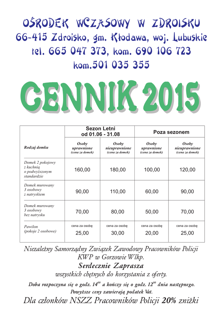 OŒRODEK WCZASOWY W ZDROISKU 66-415 Zdroisko, gm. K³odawa, woj. Lubuskie tel. 665 047 373, kom. 690 106 723 kom.501 035 355 CENNIK 2015 Sezon Letni od 01.06 - 31.08 Poza sezonem Osoby uprawnione Osoby nieuprawnione Osoby uprawnione Osoby nieuprawnione (cena za domek) (cena za domek) (cena za domek) (cena za domek) Domek 2 pokojowy z kuchni¹ o podwy¿szonym standardzie 160,00 180,00 100,00 120,00 Domek murowany 3 osobowy z natryskiem 90,00 110,00 60,00 90,00 Domek murowany 3 osobowy bez natrysku 70,00 80,00 50,00 70,00 cena za osobê cena za osobê cena za osobê cena za osobê 25,00 30,00 20,00 25,00 Rodzaj domku Pawilon (pokoje 2 osobowe) Niezale¿ny Samorz¹dny Zwi¹zek Zawodowy Pracowników Policji KWP w Gorzowie Wlkp. Serdecznie Zaprasza wszystkich chêtnych do korzystania z oferty. 00 00 Doba rozpoczyna siê o godz. 14 a koñczy siê o godz. 12 dnia nastêpnego. Powy¿sze ceny zawieraj¹ podatek Vat. Dla cz³onków NSZZ Pracowników Policji 20% zni¿ki OŒRODEK WCZASOWY W ZDROISKU 66-415 Zdroisko, gm. K³odawa, woj. Lubuskie tel. 665 047 373, kom. 690 106 723 kom.501 035 355 CENNIK 2015 Pole namiotowe - camping (za dobê) - ustawienie namiotu ustawienie przyczepy ustawienie przedsionka do przyczepy od osoby w przyczepie lub namiocie rycza³t za pr¹d - 10,00 z³ - 12,00 z³ - 2,50 z³ - 6,00 z³ - 8,00 z³ Op³ata za pobyt psa - 5,00 z³/doba (aktualne zaœwiadczenie o szczepieniu) Op³ata za parkowanie samochodu (za dobê) - wczasowicz - pozostali - 0,00 z³ - 6,00 z³ Sprzêt wodny - ³ódŸ - 10,00 z³/godz. Wynajem Oœrodka na imprezy plenerowe - 1.150,00 z³