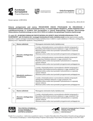 Numer sprawy: 2/NP/2016 Ostrowiec Św., 2016-20-24 Dotyczy postępowania pod nazwą: ŚWIADCZENIE USŁUGI POLEGAJĄCEJ NA ORGANIZACJI I PRZEPROWADZENIU SZKOLEŃ ZAWODOWYCH DLA 72 UCZESTNIKÓW PROJEKTU „NOWE PERSPEKTYWY” współfinansowanego ze środków Unii Europejskiej w ramach Regionalnego Programu Operacyjnego Województwa Świętokrzyskiego na lata 2014-2020 ze środków Europejskiego Funduszu Społecznego W części IV „WARUNKI FORMALNE PRZYSTĄPIENIA DO OFERTY ORAZ SPOSÓB SPEŁNIANIA TYCH WARUNKÓW”, pkt 2b (tabela dot. wymagań minimalnych kadry dydaktycznej) zostaje poprawiona omyłka pisarska w opisie wymagań minimalnych kadry dydaktycznej w tabeli w części szkolenia 4. Florysta z obsługą kasy fiskalnej oraz 5. Rękodzieło użytkowe z kasą fiskalną z: Lp. 4 5 Nazwa szkolenia Florysta z obsługą kasy fiskalnej Rękodzieło użytkowe z kasą fiskalną Wymagania minimalne kadry dydaktycznej 2 osoby z doświadczeniem w prowadzeniu szkoleń związanych z florystyką i/lub bukieciarstwem nabytym w ciągu ostatnich 3 lat. Minimum jedna osoba musi posiadać wykształcenie co najmniej wyższe rolnicze. Minimum jedna osoba musi posiadać przygotowanie pedagogiczne. 2 osoby z doświadczeniem w prowadzeniu szkoleń związanych obsługą kasy fiskalnej nabytym w ciągu ostatnich 3 lat. Minimum jedna osoba musi posiadać wykształcenie co najmniej wyższe rolnicze. Minimum jedna osoba musi posiadać przygotowanie pedagogiczne. 2 osoby z doświadczeniem w prowadzeniu szkoleń związanych z florystyką i/lub bukieciarstwem nabytym w ciągu ostatnich 3 lat. Minimum jedna osoba musi posiadać wykształcenie co najmniej wyższe rolnicze. Minimum jedna osoba musi posiadać przygotowanie pedagogiczne. 2 osoby z doświadczeniem w prowadzeniu szkoleń związanych obsługą kasy fiskalnej nabytym w ciągu ostatnich 3 lat. Minimum jedna osoba musi posiadać wykształcenie co najmniej wyższe rolnicze. Minimum jedna osoba musi posiadać przygotowanie pedagogiczne. na: Lp. 4 Nazwa szkolenia Wymagania minimalne kadry dydaktycznej Florysta z obsługą kasy fiskalnej 2 osoby z doświadczeniem w prowadzeniu szkoleń związanych z florystyką i/lub bukieciarstwem nabytym w ciągu ostatnich 3 lat. Minimum jedna osoba musi posiadać wykształcenie co najmniej wyższe rolnicze. Minimum jedna osoba musi posiadać przygotowanie pedagogiczne. Wyższa Szkoła Biznesu i Przedsiębiorczości w Ostrowcu Świętokrzyskim PARTNER WIODĄCY Biuro projektu „Nowe perspektywy”: ul. Akademicka 12, 27-400 Ostrowiec Św. tel./fax 41 266 72 00, www.wsbip.edu.pl Świętokrzyskie Towarzystwo Zapobiegania Patologiom Społecznym „Kuźnia” PARTNER KUŹNIA ul. Ogrodowa 205 , 27-400 Ostrowiec Św. tel/fax:885 885 845,601 505 410 http//www.stzps.republika.pl Projekt Nowe perspektywy realizowany na podstawie umowy z Urzędem Marszałkowskim Województwa Świętokrzyskiego pełniącym role Instytucji Zarządzającej w ramach Regionalnego Programu Operacyjnego Województwa Świętokrzyskiego na lata 2014-2020 5 Rękodzieło użytkowe z kasą fiskalną 2 osoby z doświadczeniem w prowadzeniu szkoleń związanych z rękodziełem artystycznym nabytym w ciągu ostatnich 3 lat. Minimum jedna osoba musi posiadać wykształcenie co najmniej wyższe z zakresu sztuki/ artystyczne w zakresie sztuki plastycznej . Minimum jedna osoba musi posiadać przygotowanie pedagogiczne. Wyższa Szkoła Biznesu i Przedsiębiorczości w Ostrowcu Świętokrzyskim PARTNER WIODĄCY Biuro projektu „Nowe perspektywy”: ul. Akademicka 12, 27-400 Ostrowiec Św. tel./fax 41 266 72 00, www.wsbip.edu.pl Świętokrzyskie Towarzystwo Zapobiegania Patologiom Społecznym „Kuźnia” PARTNER KUŹNIA ul. Ogrodowa 205 , 27-400 Ostrowiec Św. tel/fax:885 885 845,601 505 410 http//www.stzps.republika.pl Projekt Nowe perspektywy realizowany na podstawie umowy z Urzędem Marszałkowskim Województwa Świętokrzyskiego pełniącym role Instytucji Zarządzającej w ramach Regionalnego Programu Operacyjnego Województwa Świętokrzyskiego na lata 2014-2020