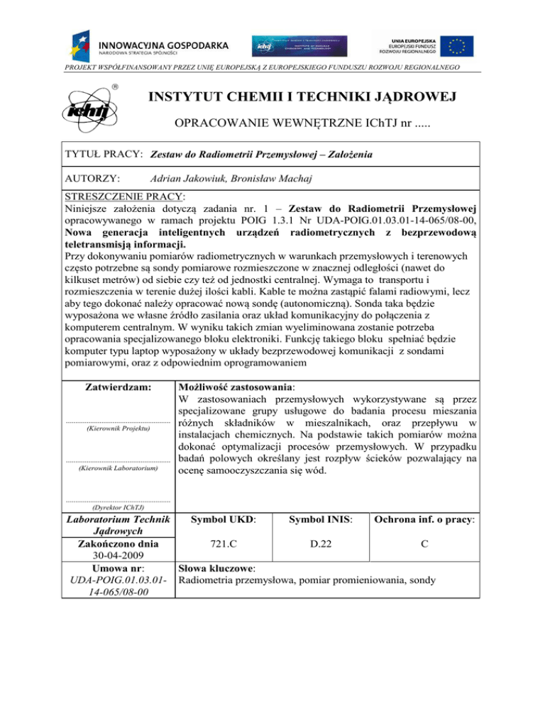 PROJEKT WSPÓŁFIASOWAY PRZEZ UIĘ EUROPEJSKĄ Z EUROPEJSKIEGO FUDUSZU ROZWOJU REGIOALEGO ISTYTUT CHEMII I TECHIKI JĄDROWEJ OPRACOWANIE WEWNĘTRZNE IChTJ nr ..... TYTUŁ PRACY: Zestaw do Radiometrii Przemysłowej – Założenia AUTORZY: Adrian Jakowiuk, Bronisław Machaj STRESZCZENIE PRACY: Niniejsze założenia dotyczą zadania nr. 1 – Zestaw do Radiometrii Przemysłowej opracowywanego w ramach projektu POIG 1.3.1 Nr UDA-POIG.01.03.01-14-065/08-00, owa generacja inteligentnych urządzeń radiometrycznych z bezprzewodową teletransmisją informacji. Przy dokonywaniu pomiarów radiometrycznych w warunkach przemysłowych i terenowych często potrzebne są sondy pomiarowe rozmieszczone w znacznej odległości (nawet do kilkuset metrów) od siebie czy też od jednostki centralnej. Wymaga to transportu i rozmieszczenia w terenie dużej ilości kabli. Kable te można zastąpić falami radiowymi, lecz aby tego dokonać należy opracować nową sondę (autonomiczną). Sonda taka będzie wyposażona we własne źródło zasilania oraz układ komunikacyjny do połączenia z komputerem centralnym. W wyniku takich zmian wyeliminowana zostanie potrzeba opracowania specjalizowanego bloku elektroniki. Funkcję takiego bloku spełniać będzie komputer typu laptop wyposażony w układy bezprzewodowej komunikacji z sondami pomiarowymi, oraz z odpowiednim oprogramowaniem Zatwierdzam: ........................................................ (Kierownik Projektu) ........................................................ (Kierownik Laboratorium) Możliwość zastosowania: W zastosowaniach przemysłowych wykorzystywane są przez specjalizowane grupy usługowe do badania procesu mieszania różnych składników w mieszalnikach, oraz przepływu w instalacjach chemicznych. Na podstawie takich pomiarów można dokonać optymalizacji procesów przemysłowych. W przypadku badań polowych określany jest rozpływ ścieków pozwalający na ocenę samooczyszczania się wód. ........................................................ (Dyrektor IChTJ) Laboratorium Technik Symbol UKD: Symbol IIS: Ochrona inf. o pracy: Jądrowych 721.C D.22 C Zakończono dnia 30-04-2009 Umowa nr: Słowa kluczowe: UDA-POIG.01.03.01- Radiometria przemysłowa, pomiar promieniowania, sondy 14-065/08-00 PROJEKT WSPÓŁFIASOWAY PRZEZ UIĘ EUROPEJSKĄ Z EUROPEJSKIEGO FUDUSZU ROZWOJU REGIOALEGO Zadanie 1 - Zestaw do Radiometrii Przemysłowej Założenia Opracowano w ramach projektu PO IG 1.3.1 UDA-POIG.01.03.01-14-065/08-00 owa generacja inteligentnych urządzeń radiometrycznych z bezprzewodową teletransmisją informacji PROJEKT WSPÓŁFIASOWAY PRZEZ UIĘ EUROPEJSKĄ Z EUROPEJSKIEGO FUDUSZU ROZWOJU REGIOALEGO 1. Wprowadzenie Niniejsze założenia dotyczą zadania nr. 1. Zestaw do radiometrii przemysłowej opracowywanego w ramach projektu POIG 1.3.1 – Program Operacyjny Innowacyjna Gospodarka, Badania i Rozwój nowoczesnych Technologii Przy dokonywaniu pomiarów radiometrycznych w warunkach przemysłowych i terenowych często potrzebne są sondy pomiarowe rozmieszczone w znacznej odległości (nawet do kilkuset metrów) od siebie czy też od jednostki centralnej. Wymaga to transportu i rozmieszczenia w terenie dużej ilości kabli. Kable te można zastąpić falami radiowymi, lecz aby tego dokonać należy opracować nową sondę (autonomiczną). Sonda taka będzie wyposażona we własne źródło zasilania oraz układ komunikacyjny do połączenia z komputerem centralnym. W wyniku takich zmian wyeliminowana zostanie potrzeba opracowania specjalizowanego bloku elektroniki. Funkcję takiego bloku spełniać będzie komputer typu laptop wyposażony w układy bezprzewodowej komunikacji z sondami pomiarowymi, oraz z odpowiednim oprogramowaniem 2. Wymagania Projektowana sonda powinna spełniać następujące wymogi: • • • • • • • • maksymalna częstość zliczeń - 30000 imp/s, zdalnie ustawiany czas zliczeń (od 0,125s do 120s), sonda wyposażona powinna być we własne źródło zasilania pozwalające na ciągłą pracę co najmniej przez 48h, synchronizacja pracy sond (równoczesny start pomiaru), przesyłanie wyników pośrednich (w trakcie trwania pomiaru, co zadany okres czasu), możliwość zdalnego zarządzania sondami za pomocą komputera przenośnego (laptopa) sonda scyntylacyjna wykonana zostanie w dwu wersjach: 1) komunikacja z jednostką sterującą za pomocą technologii WiFI 2) komunikacja z jednostka sterująca za pomocą technologii GSM odległość, z jakiej można się łączyć z sondą powinna wynosić około 300m w przypadku wersji WiFI, oraz bez ograniczeń w wersji GSM, Sondy pomiarowe powinny być wyposażone w mikrokontrolery których zadaniem będzie rejestrowanie impulsów z sondy scyntylacyjnej i przekazywanie ich do jednostki sterującej (w założonym okresie czasu lub na żądanie). Oprócz tego układ ten będzie miał za zadanie przesyłanie informacji dotyczących stanów alarmowych: • rozładowanie akumulatora, • przepełniony bufor zliczeń, • brak połączenia z sondą scyntylacyjną, Na rys. 1. przedstawiony został przykładowy sposób połączenia sond pomiarowych z jednostką centralną. Zaprezentowany układ zbudowany jest z dwóch sond typu GSM (połączenie z jednostką centralną poprzez internet za pomocą sieci telefonii komórkowej) oraz z dwóch sond typu WiFI (połączone z jednostką centralną za pomocą fal radiowych). W takim rozwiązaniu jednostka centralna powinna być wyposażona w moduł pozwalający na dostęp do Internetu (wykorzystujący sieć GSM) oraz moduł WiFI. Zadanie 1: Zestaw do radiometrii przemysłowej - Założenia 1 PROJEKT WSPÓŁFIASOWAY PRZEZ UIĘ EUROPEJSKĄ Z EUROPEJSKIEGO FUDUSZU ROZWOJU REGIOALEGO Sondy GSM Sieć GSM Sondy WiFI Jednostka sterująca Rys. 1. Schemat funkcjonalny łączności bezprzewodowej sond pomiarowych z jednostką sterująca (komputerem centralnym). Projektowane sondy pomiarowe powinny być wyposażone we własne źródło zasi