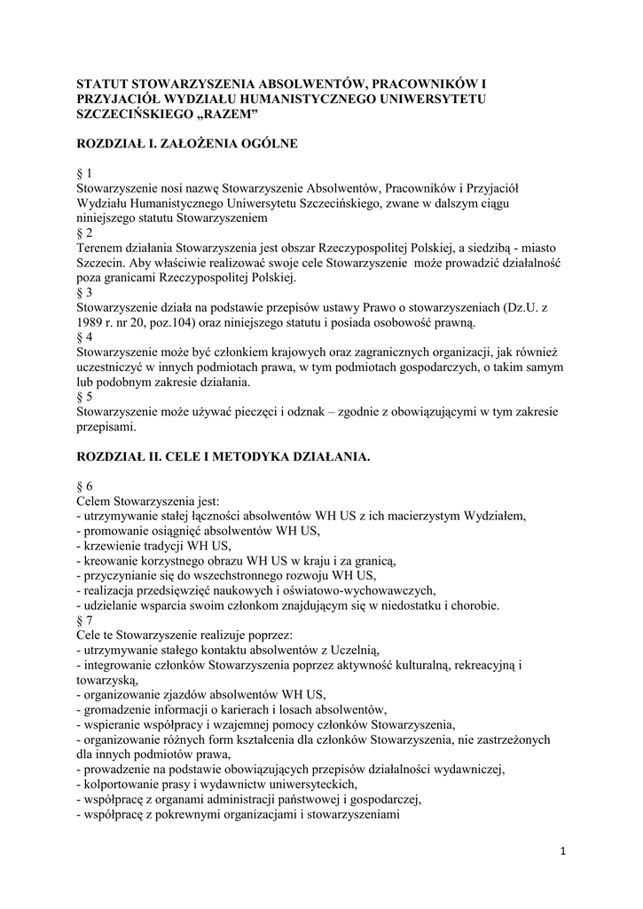 STATUT STOWARZYSZENIA ABSOLWENTÓW, PRACOWNIKÓW I PRZYJACIÓŁ WYDZIAŁU HUMANISTYCZNEGO UNIWERSYTETU SZCZECIŃSKIEGO „RAZEM” ROZDZIAŁ I. ZAŁOŻENIA OGÓLNE §1 Stowarzyszenie nosi nazwę Stowarzyszenie Absolwentów, Pracowników i Przyjaciół Wydziału Humanistycznego Uniwersytetu Szczecińskiego, zwane w dalszym ciągu niniejszego statutu Stowarzyszeniem §2 Terenem działania Stowarzyszenia jest obszar Rzeczypospolitej Polskiej, a siedzibą - miasto Szczecin. Aby właściwie realizować swoje cele Stowarzyszenie może prowadzić działalność poza granicami Rzeczypospolitej Polskiej. §3 Stowarzyszenie działa na podstawie przepisów ustawy Prawo o stowarzyszeniach (Dz.U. z 1989 r. nr 20, poz.104) oraz niniejszego statutu i posiada osobowość prawną. §4 Stowarzyszenie może być członkiem krajowych oraz zagranicznych organizacji, jak również uczestniczyć w innych podmiotach prawa, w tym podmiotach gospodarczych, o takim samym lub podobnym zakresie działania. §5 Stowarzyszenie może używać pieczęci i odznak – zgodnie z obowiązującymi w tym zakresie przepisami. ROZDZIAŁ II. CELE I METODYKA DZIAŁANIA. §6 Celem Stowarzyszenia jest: - utrzymywanie stałej łączności absolwentów WH US z ich macierzystym Wydziałem, - promowanie osiągnięć absolwentów WH US, - krzewienie tradycji WH US, - kreowanie korzystnego obrazu WH US w kraju i za granicą, - przyczynianie się do wszechstronnego rozwoju WH US, - realizacja przedsięwzięć naukowych i oświatowo-wychowawczych, - udzielanie wsparcia swoim członkom znajdującym się w niedostatku i chorobie. §7 Cele te Stowarzyszenie realizuje poprzez: - utrzymywanie stałego kontaktu absolwentów z Uczelnią, - integrowanie członków Stowarzyszenia poprzez aktywność kulturalną, rekreacyjną i towarzyską, - organizowanie zjazdów absolwentów WH US, - gromadzenie informacji o karierach i losach absolwentów, - wspieranie współpracy i wzajemnej pomocy członków Stowarzyszenia, - organizowanie różnych form kształcenia dla członków Stowarzyszenia, nie zastrzeżonych dla innych podmiotów prawa, - prowadzenie na podstawie obowiązujących przepisów działalności wydawniczej, - kolportowanie prasy i wydawnictw uniwersyteckich, - współpracę z organami administracji państwowej i gospodarczej, - współpracę z pokrewnymi organizacjami i stowarzyszeniami 1 - tworzenie funduszy stypendialnych, - finansowanie programów naukowych i badawczych, w tym zajęć zaproszonych do WH US wykładowców, - pozyskiwanie środków na rzecz Stowarzyszenia i Uczelni, - zakup aparatury do badań oraz książek, wydawnictw i elektronicznych nośników informacji, - ustanawianie rent i przekazywanie darowizn, - badania naukowe i prace rozwojowe w dziedzinie nauk społecznych i humanistycznych, - działalność charytatywną, - działalność na rzecz osób niepełnosprawnych, - upowszechnianie i ochrona praw kobiet oraz działalność na rzecz równych praw kobiet i mężczyzn, - inspirowanie działań i upowszechnianie wolontariatu, - działalność wspomagającą rozwój gospodarczy – w tym przedsiębiorczości, - działalność wspomagającą rozwój wspólnot i społeczności lokalnych, - działalność na rzecz rozwoju społeczeństwa informacyjnego i gospodarki opartej na wiedzy, - działalność promującą stosowanie zasad zrównoważonego rozwoju i ochrony środowiska, - działalność podnosząca świadomość ekologiczną wśród szeroko pojmowanej społeczności lokalnej, - upowszechnianie ochrony wolności i praw człowieka, swobód obywatelskich, a także działań wspomagających rozwój demokracji, - działalność na rzecz integracji europejskiej oraz rozwijania kontaktów i współpracy między społecznościami, - podtrzymanie tradycji narodowej i pielęgnowanie polskości oraz rozwój świadomości narodowej, obywatelskiej i kulturowej, - organizowanie konferencji, narad, kursów, odczytów, wystaw, pokazów, szkoleń, wyjazdów krajowych i zagranicznych, spotkań okolicznościowych oraz czynnej rekreacji jako ważnych czynników integracji środowiska, - inne działania wspomagające edukację, w tym doradztwo edukacyjno-zawodowe, działalność w zakresie pomocy psychologiczno-pedagogicznej, działalność dotycząca oceny szkoleń, organizowanie programów wymiany studenckiej. §8 Dla realizacji swoich celów statutowych Stowarzyszenie może prowadzić działalność gospodarczą, przy czym cały dochód z tej działalności jest przeznaczany wyłącznie na realizację celów statutowych Stowarzyszenia. §9 W realizacji swoich celów Stowarzyszenie opiera się na honorowej (społecznej) pracy członków. Ma jednak prawo zatrudniać pracowników do prowadzenia spraw Stowarzyszenia. ROZDZIAŁ III. CZŁONKOWIE, ICH PRAWA I OBOWIĄZKI § 10 Członkowie Stowarzyszenia dzielą się na: zwyczajnych, wspierających -zwanych Przyjaciółmi Stowarzyszenia i honorowych § 11 1. Członkami zwyczajnymi Stowarzyszenia mogą być absolwenci (tj. osoby posiadające dyplom ukończenia studiów na Wydziale Humanistycznym Uniwersytetu Szczecińskiego) i pracownicy WH US, przyjęci przez Zarząd Stowarzyszenia na podstawie złożonej deklaracji. 2. Członkami zwyczajnymi Stowarzyszenia mogą być również cudzoziemcy nie zamieszkujący na terytorium Rzeczypospolitej Polskiej, jeśli spełniają warunki, o których mowa w ust. 1. 2 § 12 Członek zwyczajny Stowarzyszenia ma prawo: 1. wybierać i być wybierany do władz Stowarzyszenia oraz uczestniczyć w Walnych Zebraniach Członków z głosem stanowiącym, 2. zgłaszać wnioski i postulaty w sprawach dotyczących działalności Stowarzyszenia, 3. brać udział we wszystkich formach działalności Stowarzyszenia. § 13 Do obowiązków członka zwyczajnego Stowarzyszenia należy: 1. aktywne uczestniczenie w pracach Stowarzyszenia, 2. przestrzeganie postanowień statutu i uchwał Stowarzyszenia, 3. popularyzowanie w swoim środowisku statutowych celów i zadań Stowarzyszen