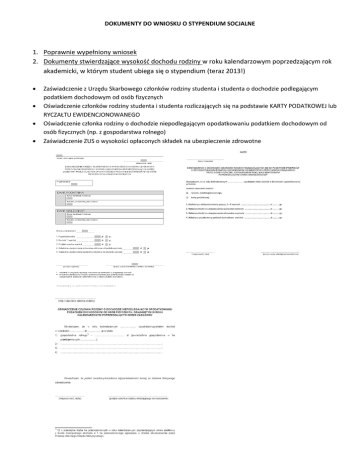 DOKUMENTY DO WNIOSKU O STYPENDIUM SOCJALNE 1. Poprawnie wypełniony wniosek 2. Dokumenty stwierdzające wysokość dochodu rodziny w roku kalendarzowym poprzedzającym rok akademicki, w którym student ubiega się o stypendium (teraz 2013!) Zaświadczenie z Urzędu Skarbowego członków rodziny studenta i studenta o dochodzie podlegającym podatkiem dochodowym od osób fizycznych Oświadczenie członków rodziny studenta i studenta rozliczających się na podstawie KARTY PODATKOWEJ lub RYCZAŁTU EWIDENCJONOWANEGO Oświadczenie członka rodziny o dochodzie niepodlegającym opodatkowaniu podatkiem dochodowym od osób fizycznych (np. z gospodarstwa rolnego) Zaświadczenie ZUS o wysokości opłaconych składek na ubezpieczenie zdrowotne INNE WYMAGANE DOKUMENTY 1. GOSPODARSTWO ROLNE Zaświadczenie właściwego organu gminy lub nakaz płatniczy o wielkości gospodarstwa rolnego wyrażonej w hektarach przeliczeniowych ogólnej powierzchni Umowa dzierżawy – w przypadku oddania części lub całości znajdującego się w posiadaniu rodziny studenta gospodarstwa Umowa zawarta w formie aktu notarialnego, w przypadku wniesienia gospodarstwa rolnego do użytkowania przez rolniczą spółdzielnię produkcyjną 2. ALIMENTY Odpis orzeczenia sądowego zasądzającego alimenty lub odpis protokołu posiedzenia zawierającego treść ugody sądowej lub odpis ugody zawartej przed mediatorem, zobowiązujących do alimentów na rzecz dzieci w rodzinie lub poza nią Przekazy lub przelewy pieniężne dokumentujące wysokość zapłaconych lub otrzymanych alimentów Zaświadczenie organu prowadzącego postępowanie egzekucyjne (np. komornik) o całkowitej lub częściowej bezskuteczności egzekucji alimentów, a także o wysokości wyegzekwowanych alimentów Decyzja Funduszu Alimentacyjnego o przyznaniu świadczeń z Funduszu i ich wysokości miesięcznej Odpis prawomocnego wyroku oddalającego powództwo o ustalenie alimentów Orzeczenie sądu zobowiązujące jednego z rodziców do ponoszenia całkowitych kosztów utrzymania dziecka Odpis zupełny aktu urodzenia w przypadku, gdy ojciec jest nieznany 3. SKŁAD RODZINY W przypadku osoby samotnie wychowującej dziecko: odpis wyroku sądu rodzinnego orzekającego rozwód lub separację akt zgonu małżonka lub rodzica studenta Odpis wyroku sądu rodzinnego stwierdzającego przysposobienie lub zaświadczenie ośrodka adopcyjnoopiekuńczego o prowadzonym postępowaniu o przysposobienie dziecka Zaświadczenie o uczęszczaniu do szkoły lub szkoły wyższej dzieci lub rodzeństwa do 26. Roku życia Odpis skrócony aktu urodzenia rodzeństwa lub dzieci do 18. Roku życia, w przypadku nieuczęszczania do szkoły Orzeczenie o niepełnosprawności studenta lub członka rodziny studenta powyżej 18. Roku życia, o ile nie uczą się i zostają na utrzymaniu studenta lub rodziny studenta 4. STUDENT SAMODZIELNY FINANSOWO Skończył 26 lat + oświadczenie o nieprowadzeniu wspólnego gospodarstwa z rodzicami lub Pozostaje w zw. małżeńskim + oświadczenie o nieprowadzeniu wspólnego gospodarstwa z rodzicami lub Ma na utrzymaniu dzieci + oświadczenie o nieprowadzeniu wspólnego gospodarstwa z rodzicami lub ŁĄCZNIE WARUNKI: posiadał stałe źródło dochodów w roku poprzednim i bieżącym w kwocie nie niższej niż 782,60 zł + oświadczenie o nieprowadzeniu wspólnego gospodarstwa z rodzicami DOCHODY NIEOPODATKOWANE – NALEŻY ZŁOŻYĆ OŚWIADCZENIE O OSIĄGANIU: Renty inwalidzkie, wojskowe, rodzinne i dodatki do rent Zasiłki chorobowe Dochody członków rolniczych spółdzielni produkcyjnych z tytułu członkostwa Alimenty na rzecz dzieci Diety otrzymywane za pełnienie obowiązków społecznych i obywatelskich Należności z tytułu wynajmu pokoi gościnnych na terenach wiejskich (agroturystyka) Dochody z działalności gospodarczej prowadzonej na podst. zezwolenia na terenie specjalnej strefy ekonomicznej Ekwiwalenty za deputaty węglowe i z tytułu prawa do bezpłatnego węgla Uposażenie poselskie i senatorskie, dodatki do uposażenia, jednorazowa odprawa, odprawa parlamentarna, dieta parlamentarna Dochody z gospodarstwa rolnego Dochody osiągane za granicą Stypendia doktoranckie i habilitacyjne, stypendia sportowe Inne określone w Ustawie Prawo o Szkolnictwie Wyższym i Ustawie o Świadczeniach Rodzinnych