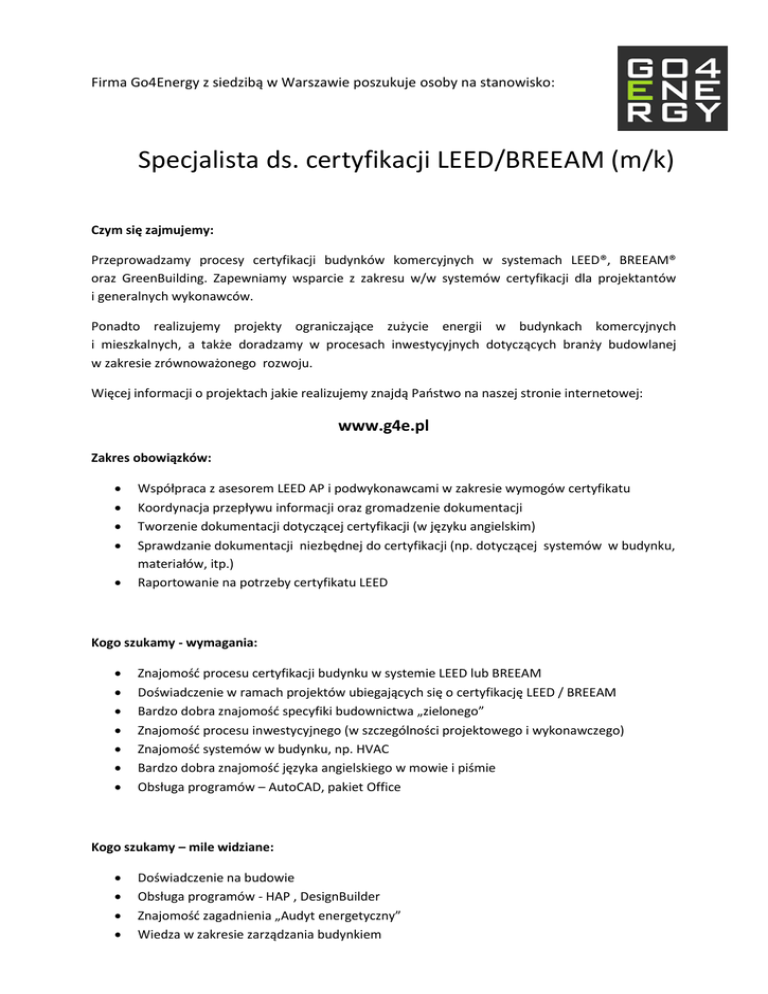 Firma Go4Energy z siedzibą w Warszawie poszukuje osoby na stanowisko: Specjalista ds. certyfikacji LEED/BREEAM (m/k) Czym się zajmujemy: Przeprowadzamy procesy certyfikacji budynków komercyjnych w systemach LEED®, BREEAM® oraz GreenBuilding. Zapewniamy wsparcie z zakresu w/w systemów certyfikacji dla projektantów i generalnych wykonawców. Ponadto realizujemy projekty ograniczające zużycie energii w budynkach komercyjnych i mieszkalnych, a także doradzamy w procesach inwestycyjnych dotyczących branży budowlanej w zakresie zrównoważonego rozwoju. Więcej informacji o projektach jakie realizujemy znajdą Państwo na naszej stronie internetowej: www.g4e.pl Zakres obowiązków: Współpraca z asesorem LEED AP i podwykonawcami w zakresie wymogów certyfikatu Koordynacja przepływu informacji oraz gromadzenie dokumentacji Tworzenie dokumentacji dotyczącej certyfikacji (w języku angielskim) Sprawdzanie dokumentacji niezbędnej do certyfikacji (np. dotyczącej systemów w budynku, materiałów, itp.) Raportowanie na potrzeby certyfikatu LEED Kogo szukamy - wymagania: Znajomość procesu certyfikacji budynku w systemie LEED lub BREEAM Doświadczenie w ramach projektów ubiegających się o certyfikację LEED / BREEAM Bardzo dobra znajomość specyfiki budownictwa „zielonego” Znajomość procesu inwestycyjnego (w szczególności projektowego i wykonawczego) Znajomość systemów w budynku, np. HVAC Bardzo dobra znajomość języka angielskiego w mowie i piśmie Obsługa programów – AutoCAD, pakiet Office Kogo szukamy – mile widziane: Doświadczenie na budowie Obsługa programów - HAP , DesignBuilder Znajomość zagadnienia „Audyt energetyczny” Wiedza w zakresie zarządzania budynkiem Oferujemy: Pracę w przyjaznej atmosferze w Warszawie Szeroki zakres obowiązków dający możliwość rozwoju zawodowego Współpracę z największymi firmami sektora budowlanego Pracę przy renomowanych i prestiżowych projektach Rekrutacja: Prosimy o przesłanie CV na adres: [email protected] CV aby mogły być rozpatrywane i przechowywane przez nas powinny zawierać klauzulę: "Wyrażam zgodę na przetwarzanie moich danych osobowych zawartych w mojej ofercie pracy dla potrzeb niezbędnych do realizacji procesu rekrutacji zgodnie z Ustawą z dnia 29.08.1997 r. o ochronie danych osobowych. (Dz.U. z 1997, nr133,poz 883)" „Wyrażam zgodę na przetwarzanie przez Go4Energy moich danych osobowych zawartych w mojej ofercie pracy dla potrzeb niezbędnych do realizacji procesu rekrutacji. Dodatkowo wyrażam zgodę na umieszczenie moich danych zawartych w ofercie pracy w bazie rekrutacyjnej administrowanej przez Go4Energy w przypadku zawarcia w nich danych w zakresie szerszym niż wymagany przepisami Kodeksu pracy oraz w sytuacji, gdy kandydat chce, aby dane zostały umieszczone w bazie rekrutacyjnej.”