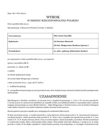 Sygn. akt. I ACa 263/14 WYROK W IMIENIU RZECZYPOSPOLITEJ POLSKIEJ Dnia 9 października 2014 r. Sąd Apelacyjny w Rzeszowie Wydział I Cywilny w składzie: Przewodniczący SSA Anna Gawełko Sędziowie: SA Dariusz Mazurek SO del. Małgorzata Moskwa (spraw.) Protokolant: st. sekr. sądowy Aleksandra Szubert po rozpoznaniu w dniu 9 października 2014 r. na rozprawie sprawy z powództwa M. C. przeciwko (...) S.A. w W. o zapłatę na skutek apelacji pozwanego od wyroku Sądu Okręgowego w Krośnie z dnia 15 stycznia 2014 r., sygn. akt I C 518/12 I. o d d a l a apelację, II. z a s ą d z a od pozwanego na rzecz powoda kwotę 1.800 zł (jeden tysiąc osiemset) tytułem kosztów postępowania apelacyjnego. UZASADNIENIE Sąd Okręgowy w Krośnie, wyrokiem z 15 stycznia 2014 r zasądził od pozwanego (...) S.A. w W. na rzecz powoda M. C. kwotę 15.000 zł z ustawowymi odsetkami na wypadek zwłoki oraz oddalił powództwo w pozostałej części i nakazał ściągnąć od pozwanego na rzecz Skarbu Państwa – Sądu Okręgowego w Krośnie kwotę 4.000 zł tytułem brakującej części opłaty od pozwu oraz zniósł wzajemnie między stronami koszty procesu. Rozstrzygniecie powyższe zapadło przy następujących ustaleniach faktycznych: W dniu 29 sierpnia 2005r. w wyniku katastrofy w ruchu lądowym, której sprawcą był J. N., prawomocnie skazanym wyrokiem karnym - śmierć poniosła córka powoda N. D.. Wraz z nią w wypadku tym zginęła żona powoda A. C. oraz wnuk D. D.. N. D. liczyła wówczas 28 lat i wraz ze swoim mężem i synem mieszkała z powodem. Powód uczestniczył w wychowaniu wnuka. Miał z córka bardzo dobre relacje. Więź między nimi była silniejsza, z uwagi na to, że córka powoda w wieku 18 lat uległa wypadkowi i miała bardzo poważny uraz kręgosłupa, co wymagało wzmożonej troski ze strony rodziców i rehabilitacji. Powód cieszył się zatem w sposób szczególny, kiedy jego córka zawarła związek małżeński i urodziła dziecko. W wyniku śmierci córki, żony i wnuka powód pozostał sam. Często myśli o zmarłej córce i nie może pogodzić się z jej tragiczną śmiercią. Jej śmierć, na którą nałożyła się śmierć żony i wnuka wywołały u powoda zaburzenia sfery emocjonalnej, które do chwili obecnej manifestują się obrazem przeżyć utraty osób bliskich. Jego sytuacja psychiczna ulegała stabilizacji, lecz nie doprowadzi to do równowagi psychicznej. Badania psychologiczne potwierdziły niepokój, duże napięcie wewnętrzne, depresyjność, unikanie kontaktów interpersonalnych, chwiejność emocjonalną. Śmierć córki dla powoda była traumatycznym wydarzeniem w życiu, które miało kluczowy, destrukcyjny wpływ na jego funkcjonowanie psychiczne w dalszym życiu, w sferze rodzinnej, towarzyskiej, zawodowej i osobistej. Z uwagi na utrwalony charakter zaburzeń i trudności psychologicznych powód wymaga leczenia psychiatrycznego jak też i systematycznych oddziaływań terapeutycznych w celu minimalizowania traumy. Wiodącą formą pomocy specjalistycznej winna być pomoc psychologiczna podtrzymująca. Szkoda została przez powoda zgłoszona pozwanemu pismem z dnia 18 maja 2012r., jednakże pozwany na to pismo nie odpowiedział. Powód M. C. przebywa na emeryturze, pobierając świadczenie w wysokości 1020 zł miesięcznie. Pozwany w ramach postępowania likwidacyjnego przyjął odpowiedzialność za zaistniałe zdarzenie z dnia 29 sierpnia 2005r. i wypłacił powodowi kwotę 35.000 tytułem odszkodowana oraz kwotę 4.133,30 zł tytułem kosztów pogrzebu. Sąd Okręgowy ocenił, że rozmiar krzywd związanych ze śmiercią córki w sferze niematerialnej powoda M. C. jest duży i w tym zakresie żądanie pozwu o zapłatę kwoty 15.000 jest uzasadnione. Sąd jednakże nie dopatrzył się tak rozległych i negatywnych skutków, jakie zakreślono w pozwie. Uznał, że nie można pominąć, że powód w postępowaniu likwidacyjnym z tytułu zdarzenia z dnia 29 sierpnia 2005r. otrzymał od pozwanego kwotę 35.000 zł i przyjął, że wraz z kwotą odszkodowania zasądzona kwota 15 000 zł jest adekwatna do rozmiaru krzywdy, jakiej doznał on w związku ze śmiercią córki. Sąd I instancji uznał, że skoro miesięczne dochody powoda wynoszą około 1.000 zł, to przyznane mu zadośćuczynienie odpowiada jego stopie życiowej. Zauważył, że rozmiar zadośćuczynienia nie zależy od statusu majątkowego pokrzywdzonego, lecz może być odnoszony do stopy życiowej społeczeństwa i w żadnym przypadku nie powinno zmierzać do wzbogacenia się uprawnionego. Orzekając o dacie początkowej odsetek, Sąd pierwszej instancji ocenił, że stopień krzywdy odniesiony przez powoda nie był znany w dniu wezwania ubezpieczyciela do zapłaty, a nadto nie odpowiadał kwocie, jaka została uwzględniona, stąd też zasądził odsetki od dnia uprawomocnienia się orzeczenia. Powołując się na art. 113 ust. 1 ustawy o kosztach sądowych opłatą od zasądzonej kwoty Sąd obciążył stronę pozwaną, w konsekwencji zasądzając od pozwanego na rzecz Skarbu Państwa – Sądu Okręgowego w Krośnie kwotę 4.000 zł. Koszty zastępstwa procesowego Sąd wzajemnie zniósł. Od powyższego wyroku apelacje złożył pozwany, domagają się zmiany zaskarżonego wyroku poprzez oddalenie powództwa i zasądzenie na jego rzecz koszów postępowania. Zarzuty podniesione w apelacji dotyczą naruszenia prawa materialnego, a to art. 448 k.c. w związku z art. 23 i 24§1 k.c. poprzez jego błędną wykładnię polegająca na przyjęciu, że przepisy te stanowią podstawę do żądana przez osoby trzecie, w tym bliskie zmarłemu, zadośćuczynienia za krzywdę wywołaną przez sprawcę czynu niedozwolonego poprzez naruszenie ich dóbr osobistych, oraz art. 34 ust. 1 ustawy z dnia 22 maja 2003 r. o ubezpieczeniach obowiązkowych, Ubezpieczeniowym Funduszu Gwarancyjnym i Polskim Biurze Ubezpieczycieli Komunikacyjnych przez przyjęcie, że umowa obowiązkowego ubezpieczenia