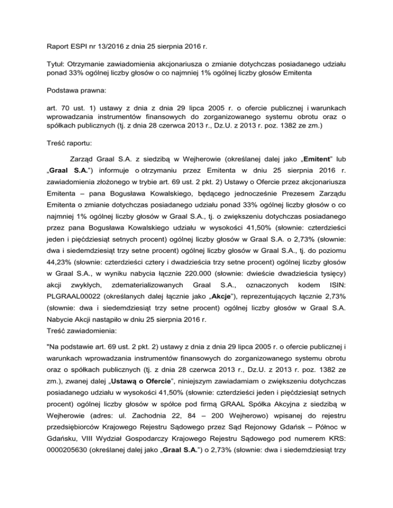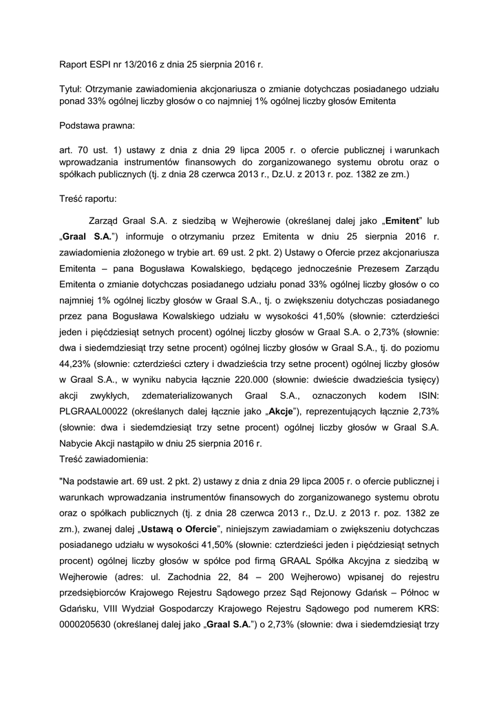 Raport ESPI nr 13/2016 z dnia 25 sierpnia 2016 r. Tytuł: Otrzymanie zawiadomienia akcjonariusza o zmianie dotychczas posiadanego udziału ponad 33% ogólnej liczby głosów o co najmniej 1% ogólnej liczby głosów Emitenta Podstawa prawna: art. 70 ust. 1) ustawy z dnia z dnia 29 lipca 2005 r. o ofercie publicznej i warunkach wprowadzania instrumentów finansowych do zorganizowanego systemu obrotu oraz o spółkach publicznych (tj. z dnia 28 czerwca 2013 r., Dz.U. z 2013 r. poz. 1382 ze zm.) Treść raportu: Zarząd Graal S.A. z siedzibą w Wejherowie (określanej dalej jako „Emitent” lub „Graal S.A.”) informuje o otrzymaniu przez Emitenta w dniu 25 sierpnia 2016 r. zawiadomienia złożonego w trybie art. 69 ust. 2 pkt. 2) Ustawy o Ofercie przez akcjonariusza Emitenta – pana Bogusława Kowalskiego, będącego jednocześnie Prezesem Zarządu Emitenta o zmianie dotychczas posiadanego udziału ponad 33% ogólnej liczby głosów o co najmniej 1% ogólnej liczby głosów w Graal S.A., tj. o zwiększeniu dotychczas posiadanego przez pana Bogusława Kowalskiego udziału w wysokości 41,50% (słownie: czterdzieści jeden i pięćdziesiąt setnych procent) ogólnej liczby głosów w Graal S.A. o 2,73% (słownie: dwa i siedemdziesiąt trzy setne procent) ogólnej liczby głosów w Graal S.A., tj. do poziomu 44,23% (słownie: czterdzieści cztery i dwadzieścia trzy setne procent) ogólnej liczby głosów w Graal S.A., w wyniku nabycia łącznie 220.000 (słownie: dwieście dwadzieścia tysięcy) akcji zwykłych, zdematerializowanych Graal S.A., oznaczonych kodem ISIN: PLGRAAL00022 (określanych dalej łącznie jako „Akcje”), reprezentujących łącznie 2,73% (słownie: dwa i siedemdziesiąt trzy setne procent) ogólnej liczby głosów w Graal S.A. Nabycie Akcji nastąpiło w dniu 25 sierpnia 2016 r. Treść zawiadomienia: "Na podstawie art. 69 ust. 2 pkt. 2) ustawy z dnia z dnia 29 lipca 2005 r. o ofercie publicznej i warunkach wprowadzania instrumentów finansowych do zorganizowanego systemu obrotu oraz o spółkach publicznych (tj. z dnia 28 czerwca 2013 r., Dz.U. z 2013 r. poz. 1382 ze zm.), zwanej dalej „Ustawą o Ofercie”, niniejszym zawiadamiam o zwiększeniu dotychczas posiadanego udziału w wysokości 41,50% (słownie: czterdzieści jeden i pięćdziesiąt setnych procent) ogólnej liczby głosów w spółce pod firmą GRAAL Spółka Akcyjna z siedzibą w Wejherowie (adres: ul. Zachodnia 22, 84 – 200 Wejherowo) wpisanej do rejestru przedsiębiorców Krajowego Rejestru Sądowego przez Sąd Rejonowy Gdańsk – Północ w Gdańsku, VIII Wydział Gospodarczy Krajowego Rejestru Sądowego pod numerem KRS: 0000205630 (określanej dalej jako „Graal S.A.”) o 2,73% (słownie: dwa i siedemdziesiąt trzy setne procent) ogólnej liczbie głosów w Graal S.A., tj. do poziomu 44,23% (słownie: czterdzieści cztery i dwadzieścia trzy setne procent) ogólnej liczby głosów w Graal S.A., w wyniku nabycia łącznie 220.000 (słownie: dwieście dwadzieścia tysięcy) akcji zwykłych, zdematerializowanych Graal S.A., oznaczonych kodem ISIN: PLGRAAL00022 (określanych dalej łącznie jako „Akcje”), reprezentujących łącznie 2,73% (słownie: dwa i siedemdziesiąt trzy setne procent) ogólnej liczby głosów w Graal S.A. Nabycie Akcji nastąpiło w dniu 25 sierpnia 2016 r. Jednocześnie, na podstawie art. 69 ust. 4 Ustawy o Ofercie podaję następujące informacje: 1. data i rodzaj zdarzenia powodującego zmianę udziału, której dotyczy zawiadomienie: (i) zawarcie dnia 25 sierpnia 2016 r. umowy darowizny w formie aktu notarialnego, pomiędzy moją osobą a panem Piotrem Kowalskim, na mocy której pod tytułem darmym nabyłem 12.100 (słownie: dwanaście tysięcy sto) Akcji; (ii) zawarcie w dniu 25 sierpnia 2016 r. pomiędzy moją osobą a spółką pod firmą Tuna Fish Bogusław Kowalski, Piotr Kowalski Spółka Jawna z siedzibą w Wejherowie (adres: ul. Zachodnia 22, 84 – 200 Wejherowo), wpisaną do rejestru przedsiębiorców Krajowego Rejestru Sądowego prowadzonego przez Sąd Rejonowy Gdańsk – Północ w Gdańsku, VIII Wydział Gospodarczy Krajowego Rejestru Sądowego pod numerem KRS: 0000186999, NIP: 588-200-19-48, REGON: 192640609 (dalej jako „Tuna Fish”) umowa przeniesienia własności akcji tytułem udziału w majątku Tuna Fish w związki z jej rozwiązaniem na mocy uchwały wspólników z dnia 25 sierpnia 2016 r. w sprawie rozwiązania Tuna Fish bez przeprowadzania likwidacji. Na podstawie ww. umowy przeniesienia własności akcji nabyłem 207.900 (słownie: dwieście siedem tysięcy dziewięćset) Akcji; 2. liczba akcji posiadanych przed zmianą udziału i ich procentowy udział w kapitale zakładowym Graal S.A. oraz liczba głosów z tych akcji i ich procentowy udział w ogólnej liczbie głosów: liczba akcji posiadanych przed zmianą wynosi 3.343.480 (słownie: trzy miliony trzysta czterdzieści trzy tysiące czterysta osiemdziesiąt) Akcji stanowiących 41,50% (słownie: czterdzieści jeden procent 50/100) kapitału zakładowego Graal S.A. i uprawniających do 3.343.480 (słownie: trzy miliony trzysta czterdzieści trzy tysiące czterysta osiemdziesiąt) ogólnej liczby głosów w Graal S.A., reprezentujących 41,50% (słownie: czterdzieści jeden procent 50/100) ogólnej liczby głosów w Graal S.A.; 3. liczba aktualnie posiadanych akcji i ich procentowy udział w kapitale zakładowym Graal S.A. oraz liczba głosów z tych akcji i ich procentowy udział w ogólnej liczbie głosów: na dzień niniejszego zawiadomienia posiadam 3.563.480 (słownie: trzy miliony pięćset sześćdziesiąt trzy tysiące czterysta osiemdziesiąt) Akcji stanowiących 44,23% (słownie: czterdzieści cztery i dwadzieścia trzy setne procent) kapitału zakładowego Graal S.A. i uprawniających do 3.563.480 (słownie: trzy miliony pięćset sześćdziesiąt trzy tysiące czterysta osiemdziesiąt) ogólnej liczby głosów w Graal S.A., reprezentujących 44,23% (słownie: czterdzie
