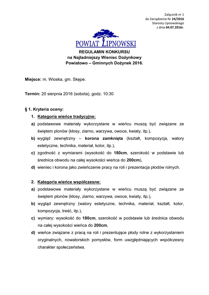 Załącznik nr 1 do Zarządzenia Nr 24/2016 Starosty Lipnowskiego z dnia 04.07.2016r. REGULAMIN KONKURSU na Najładniejszy Wieniec Dożynkowy Powiatowo – Gminnych Dożynek 2016. Miejsce: m. Wioska, gm. Skępe. Termin: 20 sierpnia 2016 (sobota), godz. 10:30 § 1. Kryteria oceny: 1. Kategoria wieńce tradycyjne: a) podstawowe materiały wykorzystane w wieńcu muszą być związane ze świętem plonów (kłosy, ziarno, warzywa, owoce, kwiaty, itp.), b) wygląd zewnętrzny – korona zamknięta (kształt, kompozycja, walory estetyczne, technika, materiał, kolor, itp.), c) zgodność z wymiarami (wysokość do 180cm, szerokość w podstawie lub średnica obwodu na całej wysokości wieńca do 200cm), d) wieniec i korona jako zwieńczenie pracy na roli i prezentacja płodów rolnych. 2. Kategoria wieńce współczesne: a) podstawowe materiały wykorzystane w wieńcu muszą być związane ze świętem plonów (kłosy, ziarno, warzywa, owoce, kwiaty, itp.), b) wygląd zewnętrzny (walory estetyczne, technika, materiał, kształt, kolor, kompozycja, treść, itp.), c) wymiary: wysokość do 180cm, szerokość w podstawie lub średnica obwodu na całej wysokości wieńca do 200cm, d) wieńce związane z pracą na roli i prezentujące płody rolne z wykorzystaniem oryginalnych, nowatorskich pomysłów, form uwzględniających współczesny charakter społeczeństwa. § 2. Dodatkowe atrakcje: Otwarty konkurs na wieniec, który zdaniem publiczności okaże się najładniejszy. W tym celu każdy uczestnik Dożynek otrzyma specjalną kartę do głosowania i będzie mógł wziąć udział w zabawie. § 3. Uczestnictwo: 1. Udział w Konkursie biorą wyłącznie wieńce z terenu Powiatu Lipnowskiego. 2. Grupy przyjeżdżają na koszt własny. 3. Miejscem spotkania grup jest plac przed Klasztorem OO. Bernardynów w Skępem. 4. Każda gmina, z wyłączeniem współorganizatora, może zgłosić po dwa wieńce (jeden w każdej kategorii). Odstępstwa od zasady muszą być każdorazowo uzgadniane z organizatorami. 5. Każdy wieniec musi być opatrzony odpowiednią tabliczką informacyjną, mówiącą o jego pochodzeniu. 30 6. Wieńce muszą być dostarczone na miejsce konkursu do godz. 10 . § 4. Zgłoszenia do udziału w konkursie: Konkursem objęte uczestnictwa będą poprzez wieńce, których poinformowanie wykonawcy naszego urzędu wyrażą i chęć odesłanie załączonego formularza zgłoszeniowego (stanowiącego Załącznik A do Regulaminu Konkursu na Najładniejszy Wieniec Dożynkowy) w nieprzekraczalnym terminie do 12 sierpnia br. na adres: Starostwo Powiatowe w Lipnie ul. Sierakowskiego 10 B 87 – 600 Lipno lub e-mail: [email protected] (w temacie wpisując „zgłoszenie-Konkurs Najładniejszy Wieniec Powiatowo – Gminnych Dożynek 2016”). Informacje dot. konkursu uzyskać można pod nr tel. /54/ 287 20 39 wew. 32 i 33. na