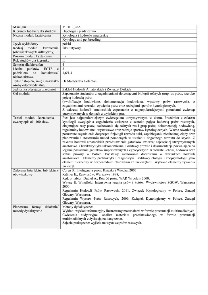 M uu_uu Kierunek lub kierunki studiów Nazwa modułu kształcenia Język wykładowy Rodzaj modułu kształcenia (obowiązkowy/fakultatywny) Poziom modułu kształcenia Rok studiów dla kierunku Semestr dla kierunku Liczba punktów ECTS z podziałem na kontaktowe/ niekontaktowe Tytuł / stopień, imię i nazwisko osoby odpowiedzialnej Jednostka oferująca przedmiot Cel modułu Treści modułu kształcenia – zwarty opis ok. 100 słów. Zalecana lista lektur lub lektury obowiązkowe Planowane formy/ działania/ metody dydaktyczne M HJ 1_26A Hipologia i jeździectwo Kynologia i hodowle amatorskie Kynology and pet breeding polski fakultatywny Is II 4 3 1,6/1,4 Dr Małgorzata Goleman Zakład Hodowli Amatorskich i Zwierząt Dzikich Zapoznanie studentów z zagadnieniami dotyczącymi biologii różnych grup ras psów, szeroko pojętą hodowlą psów (kwalifikacje hodowlane, dokumentacja hodowlana, wystawy psów rasowych), z zagadnieniami rozrodu i żywienia psów oraz rodzajami sportów kynologicznych. Z zakresu hodowli amatorskich zapoznanie z najpopularniejszymi gatunkami zwierząt utrzymywanych w domach z wyjątkiem psa. Pies jest najpopularniejszym zwierzęciem utrzymywanym w domu. Przedmiot z zakresu kynologii uwzględnia zagadnienia związane z szeroko pojęta hodowlą psów rasowych, obejmujące rasy psów, zachowanie się różnych ras i grup psów, dokumentację hodowlaną, regulaminy hodowlane i wystawowe oraz rodzaje sportów kynologicznych. Ważne również są poruszane zagadnienia dotyczące fizjologii rozrodu suki, zapobieganiu niechcianej ciąży oraz planowaniu i stosowaniu metod pomocnych w ustalaniu dogodnego terminu do krycia. Z zakresu hodowli amatorskich przedstawienie gatunków zwierząt najczęściej utrzymywanych amatorsko. Charakterystyka taksonomiczna. Podstawy prawne i dokumentacja pozwalająca na legalne posiadanie gatunków importowanych i egzotycznych. Kotowate –chów, hodowla oraz status prawny w Polsce. Podstawy zachowania dobrostanu w warunkach hodowli amatorskich. Elementy profilaktyki i diagnostyki. Podstawy etologii i zoopsychologii jako element niezbędny w bezpośrednim obcowaniu ze zwierzętami. Wybrane elementy żywienia zwierząt. Coren S.: Inteligencja psów. Książka i Wiedza, 2005 Krämer E., Rasy psów, Warszawa 1998, Red. pr. zbior. Dubiel A., Rozród psów, WAR Wrocław 2000, Wayne E. Wingfield, Intensywna terapia psów i kotów, Wydawnictwo SGGW, Warszawa 2000 Regulamin Hodowli Psów Rasowych, 2011, Związek Kynologiczny w Polsce, Zarząd Główny, Warszawa. Regulamin Wystaw Psów Rasowych, 2009, Związek Kynologiczny w Polsce, Zarząd Główny, Warszawa. Metody dydaktyczne: Wykład: wykład informacyjny ilustrowany materiałami w formie prezentacji multimedialnych Ćwiczenia audytoryjne: analiza materiału przedstawionego w formie prezentacji multimedialnych z dyskusją na dany temat. Zajęcia praktyczne: wyjście na wystawę psów rasowych.