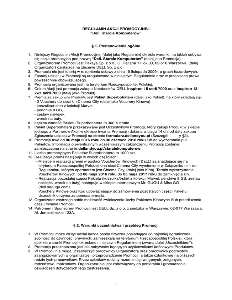 !! ! REGULAMIN AKCJI PROMOCYJNEJ! “Dell. Starcie Komputerów”! § 1. Postanowienia ogólne! 1. Niniejszy Regulamin Akcji Promocyjnej (dalej jako Regulamin) określa warunki, na jakich odbywa się akcja promocyjna pod nazwą “Dell. Starcie Komputerów” (dalej jako Promocja).! 2. Organizatorem Promocji jest Pakaya Sp. z o.o., ul. Rejtana 17 lok 33, 02-516 Warszawa, (dalej Organizator) działająca na zlecenie DELL Sp. z o.o.! 3. Promocja nie jest loterią w rozumieniu ustawy z dnia 19 listopada 2009r. o grach hazardowych.! 4. Zasady udziału w Promocji są uregulowane w niniejszym Regulaminie oraz w przepisach prawa powszechnie obowiązującego.! 5. Promocja organizowana jest na terytorium Rzeczypospolitej Polskiej.! 6. Celem Akcji jest promocja zakupu Notebooków DELL Inspiron 15 serii 7000 oraz Inspiron 13 2w1 serii 7000 (dalej jako Produkt).! 7. Premią za zakup w/w Produktu jest Pakiet Superbohatera (dalej jako Pakiet), na który składają się: - 2 Vouchery do sieci kin Cinema City (dalej jako Vouchery Kinowe), - koszulka/t-shirt z kolekcji Marvel, - pendrive 8 GB, - zestaw naklejek, - worek na buty.! 8. Łączna wartość Pakietu Superbohatera to 300 zł brutto. ! 9. Pakiet Superbohatera przekazywany jest Uczestnikowi Promocji, który zakupi Produkt w sklepie jednego z Partnerów Akcji w okresie trwania Promocji i dokona w ciągu 14 dni od daty zakupu Zgłoszenia udziału w Promocji na stronie formularz.dellandyou.pl (Szczegół y §2).! 10. Promocja trwa od 06 maja 2016 roku do 30 czerwca 2016 roku lub do wyczerpania puli Pakietów. Informacja o ewentualnym wcześniejszym zakończeniu Promocji zostanie zamieszczona na stronie dellandyou.pl/starciekomputerow.! 11. Liczba promocyjnych Pakietów Superbohatera to 1000 szt.! 12. Realizacja premii następuje w dwóch częściach:! - Miejscem realizacji premii w postaci Voucherów Kinowych (2 szt.) są znajdujące się na terytorium Rzeczpospolitej Polskiej kina sieci Cinema City wymienione w Załączniku nr 1 do Regulaminu, których operatorem jest Cinema City, (dalej jako Kina). Termin wykorzystania Voucherów Kinowych: od 06 maja 2016 roku do 05 maja 2017 roku do zamknięcia kin.! - Realizacja pozostałej części Pakietu (koszulka/t-shirt z kolekcji Marvel, pendrive 8 GB, zestaw naklejek, worek na buty) następuje w sklepie internetowym Mr. GUGU & Miss GO (dell.mrgugu.com).! Vouchery Kinowe oraz Kod upoważniający do zamówienia pozostałych części Pakietu Uczestnik otrzyma za pomocą e-maila. ! 13. Organizator zastrzega sobie możliwość zwiększenia liczby Pakietów Kinowych i/lub przedłużenia czasu trwania Promocji.! 14. Patronem i Sponsorem Promocji jest DELL Sp. z o.o. z siedzibą w Warszawie, 02-017 Warszawa, Al. Jerozolimskie 123A.! !! ! § 2. Warunki uczestnictwa i przebieg Promocji! 1. W Promocji może wziąć udział każda osoba fizyczna posiadająca co najmniej ograniczoną zdolność do czynności prawnych, zamieszkała na terytorium Rzeczpospolitej Polskiej, która spełniła warunki Promocji określone niniejszym Regulaminem (zwana dalej „Uczestnikiem”).! 2. Promocja przeznaczona jest dla nabywców będących użytkownikami końcowymi Produktów.! 3. W Promocji nie mogą uczestniczyć pracownicy Organizatora oraz pracownicy podmiotów zaangażowanych w organizację i przeprowadzenie Promocji, a także członkowie najbliższych rodzin tych pracowników. Przez członków rodziny rozumie się: wstępnych, zstępnych, rodzeństwo, małżonków. Organizator nie jest zobowiązany do pobierania i gromadzenia oświadczeń dotyczących tego zastrzeżenia.! 1 4. W celu otrzymania Nagrody, Uczestnik powinien spełnić następujące warunki:! a) Nabycie w trakcie trwania Promocji (06 maja 2016 - 30 czerwca 2016) jednego z modeli notebooków Dell serii: - Inspiron 15 serii 7000 - Inspiron 13 2w1 serii 7000 ! b) Dokonanie w/w zakupu w sieci sklepów partnerów Promocji: - Komputronik - RTVEuroAGD - Sferis - Media Expert - X-kom - Media Markt - Saturn - przez stronę dell.pl lub sklepy internetowe w/w partnerów.! c) Zachowanie oryginalnego dowodu zakupu Produktu, w postaci paragonu fiskalnego lub faktury VAT (zawierających nazwę Produktu – dalej „Dowód zakupu”).! d) Dokonanie prawidłowego zgłoszenia udziału w Promocji na stronie formularz.dellandyou.pl poprzez podanie: - Danych osobowych Uczestnika Promocji w postaci: imienia i nazwiska, numeru telefonu kontaktowego oraz adresu e-mail, - daty zakupu produktu - miejsca zakupu Produktu (z rozwijanej listy) - numeru seryjnego zakupionego Produktu - skanu paragonu albo faktury VAT jako dowodu zakupu Produktu, - modelu komputera (z rozwijanej listy)! e) Zgłoszenia należy dokonać w ciągu 14 dni kalendarzowych od daty zakupu, najpóźniej 14 sierpnia 2016 do godz. 23.59.! f) Oświadczenie o zapoznaniu się i akceptacji Regulaminu Akcji Promocyjnej oraz zgodę na wykorzystanie podanych danych do czynności związanych z Promocją, złożone poprzez zaznaczenie stosownych pól Zgłoszenia.! 5. Promocją objęty jest Produkt fabrycznie nowy, nabyty w okresie trwania Promocji w punktach sprzedaży wymienionych w pkt 4b niniejszego paragrafu, Promocją nie są objęte produkty pochodzące ze sprzedaży wtórnej.! 6. Wysyłając zgłoszenie wzięcia udziału w Promocji, Uczestnik wyraża jednocześnie zgodę na postanowienia Regulaminu.! 7. Udział w Promocji jest całkowicie dobrowolny. Podanie danych osobowych jest dobrowolne, lecz konieczne do wzięcia udziału w Promocji.! 8. W oparciu o dane podane przez Uczestnika w Zgłoszeniu Organizator dokonuje weryfikacji prawidłowości zgłoszeń.! 9. W Promocji może brać udział tylko jedno zgłoszenie zwierające numer tego samego dowodu zakupu, uwzględnione zostaje tylko jedno zgłoszenie otrzymane przez Organizatora jako pierwsze.! !! ! § 3. Premia! 1. Uczestnikowi, który dokona prawidłowego zgłoszenia udziału w Promocji, Organizator przyznaje Premię w postaci Pakietu Suberbohatera składającego się z: