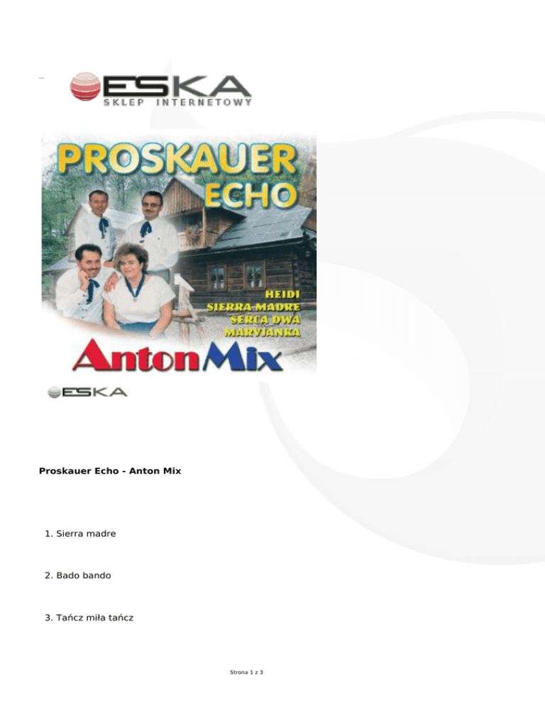 Proskauer Echo - Anton Mix 1. Sierra madre 2. Bado bando 3. Tańcz miła tańcz Strona 1 z 3 4. Heidi 5. Gdy muzyczka zagra nam 6. Wszyscy chwyćmy się za dłonie 7. Bella Madonna 8. Kochanie me 9. Moje miasteczko 10. Gorące słońce jest na majorce 11. Bella Madonna 12. Sierra madre 13. Bando bando 14. Tańcz miła tańcz 15. Zatańcz ze mną 16. Heidi 17. Upływa nam czas Strona 2 z 3 18. Wspomnienie 19. Nie wróci tamten czas 20. Serca dwa 21. Serduszka dwa ho-la-li-ha 22. Glory glory alleluja 23. O Maryjano 24. Maryjanka 25. Po naszemu - Ana, Ana Strona 3 z 3