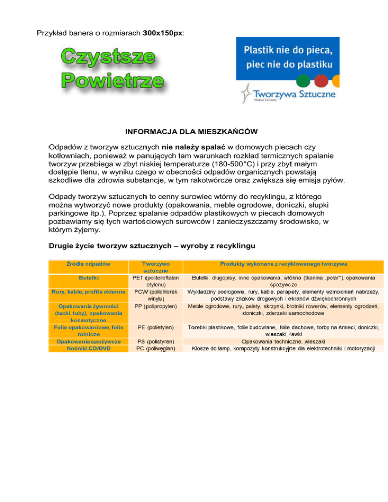 Przykład banera o rozmiarach 300x150px: INFORMACJA DLA MIESZKAŃCÓW Odpadów z tworzyw sztucznych nie należy spalać w domowych piecach czy kotłowniach, ponieważ w panujących tam warunkach rozkład termicznych spalanie tworzyw przebiega w zbyt niskiej temperaturze (180-500°C) i przy zbyt małym dostępie tlenu, w wyniku czego w obecności odpadów organicznych powstają szkodliwe dla zdrowia substancje, w tym rakotwórcze oraz zwiększa się emisja pyłów. Odpady tworzyw sztucznych to cenny surowiec wtórny do recyklingu, z którego można wytworzyć nowe produkty (opakowania, meble ogrodowe, doniczki, słupki parkingowe itp.). Poprzez spalanie odpadów plastikowych w piecach domowych pozbawiamy się tych wartościowych surowców i zanieczyszczamy środowisko, w którym żyjemy. Drugie życie tworzyw sztucznych – wyroby z recyklingu Czy wiesz, że: Opublikowany w maju 2016 roku raport WHO wskazuje, że 33 z 50 miast Unii Europejskiej o najbardziej zanieczyszczonym powietrzu położone jest na terenie naszego kraju. Niechlubne pierwsze miejsce zajął Żywiec, tuż za nim uplasowała się Pszczyna a w pierwszej dziesiątce znalazły się jeszcze Rybnik (4 miejsce), Wodzisław Śląski (5), Opoczno (6), Sucha Beskidzka (7) i Godów (8). Mieszkańcy polskich miast i gmin mogą na bieżąco zapoznać się ze stanem powietrza monitorowanym w najbliższej stacji pomiarowej. Informacje te są zamieszczone na stronie Głównego Inspektoratu Ochrony Środowiska: http://powietrze.gios.gov.pl/pjp/home Z raportu GUS „Ochrona Środowiska w Polsce 2015” wynika m.in., że ze spalania w gospodarstwach domowych wytwarzane jest prawie czterokrotnie więcej pyłów niż łącznie emituje sektor produkcji i transformacji energii. Do takiego stanu rzeczy przyczynia się nie tylko palenie paliwem niskiej jakości, ale także spalanie odpadów w piecach, kominkach czy na wolnym powietrzu - zjawisko to jest w Polsce niestety nadal powszechne. Według Światowej Organizacji Zdrowia (WHO) długotrwałe narażenie na działanie pyłu zawieszonego PM 2,5 (jest to pył o średnicy nie większej niż 2,5 mikrometrów, tj. 20-35 razy mniejszej niż wynosi średnica ludzkiego włosa) skutkuje skróceniem średniej długości życia, a krótkotrwała ekspozycja na wysokie stężenia tego pyłu powoduje wzrost liczby zgonów z powodu chorób układu oddechowego i krążenia oraz wzrost ryzyka nagłych przypadków wymagających hospitalizacji (nasilenie astmy, ostra reakcja układu oddechowego, osłabienie czynności płuc). Pomocne linki: www.plasticeurope.pl http://misja-emisja.pl/ http://www.niskaemisja.pl/ http://waznamisjazdrowaemisja.pl/niska-emisja-wysoki-poziom-zagrozenia/