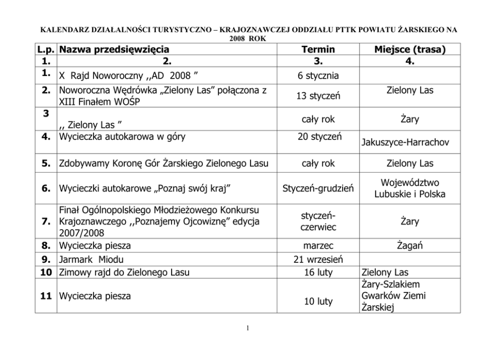 KALENDARZ DZIAŁALNOŚCI TURYSTYCZNO – KRAJOZNAWCZEJ ODDZIAŁU PTTK POWIATU śARSKIEGO NA 2008 ROK L.p. Nazwa przedsięwzięcia 1. 2. 1. X Rajd Noworoczny ,,AD 2008 ” Termin 3. 6 stycznia 2. Noworoczna Wędrówka „Zielony Las” połączona z XIII Finałem WOŚP 3 ,, Zielony Las ” 4. Wycieczka autokarowa w góry 5. Zdobywamy Koronę Gór śarskiego Zielonego Lasu 6. Wycieczki autokarowe „Poznaj swój kraj” 7. 8. 9. 10 Miejsce (trasa) 4. Finał Ogólnopolskiego MłodzieŜowego Konkursu Krajoznawczego ,,Poznajemy Ojcowiznę” edycja 2007/2008 Wycieczka piesza Jarmark Miodu Zimowy rajd do Zielonego Lasu 11 Wycieczka piesza 13 styczeń cały rok 20 styczeń śary Jakuszyce-Harrachov cały rok Zielony Las Styczeń-grudzień Województwo Lubuskie i Polska styczeńczerwiec śary marzec 21 wrzesień 16 luty 10 luty 1 Zielony Las śagań Zielony Las śary-Szlakiem Gwarków Ziemi śarskiej 12 VIII rajd pieszy ,,Jasieńska Wiosna 2008 ” im. Kazimierza Górnika 13 Rajd pieszy przez Zielony Las kwiecień 14 Wędrówki po ŁuŜycach 15 16 17 18 III Oddziałowy rajd ,, In Memoriał Carolus Wojtyła Papa’’ Gwiaździsty Rajd Rowerowy „Doliną Szyszyny” 3-dniowy rajd rowerowy do Krzesińskiego Parku Krajobrazowego 22 23 Oddziałowy Rok Parków i Ogrodów 20 21 śary kwiecień-listopad Wycieczka autokarowa na Lubelszczyznę Wojewódzkie Zawody Latawców Wojewódzki Ogólnopolski MłodzieŜowy Turniej Turystyczno – Krajoznawczy PTTK IX Konkurs Fotograficzno - Plastyczny: ,,Piękno Ziemi śarskiej” a) zabytki, krajobraz śar i okolic, b) moje wakacje, ferie c) atrakcje tur. powiatu (makieta) Gwiaździsty Rajd Rowerowy 19 29 marzec 2 kwietnia kwiecień Biedrzychowice 2-4 maj śary-Lubsko-Kłopot kwiecień-maj wrzesień-listopad kwiecień śary kwiecień maj cały powiat I dekada maja Rietscheu marzec-listopad 2 śary - lotnisko 24 Cykliczne wycieczki rowerowe „Poznajemy śary i okolicę” 25 Rajd Rowerowy po niemieckiej stronie marca- listopada Powiat Ŝarski 17 maj 26 Święto Parku MuŜakowskiego maj „ Zielone ścieŜki” śar i okolic współpraca z Lange Reisen w Guben czerwiec śary 28 Dni Ziemi śarskiej - wycieczka I dekada czerwca śary 29 Wyjazd na narty 17 luty 27 30 Rajd rowerowy po ,,Łuku MuŜakowa’’ 31 Wielodyscyplinowy Zlot Oddziałowy 32 27 wrzesień Harrachov śary, Łęknica 14-15 czerwiec Świbna Europejski Dzień Bez Samochodu 21 wrzesień śary 33 XXX Rajd Pieszy Szlakiem ,,Czarnej Stopy” 26 wrzesień Zielony Las 34 Złaz górski „O Laską Liczyrzepy” 13-14 wrzesień Karkonosze 35 Zaduszki Turystyczne 2 listopada śary 36 Wojewódzki Konkurs Piosenki Turystycznej 22 listopad śary - Luna 3 37 Andrzejki Turystyczne 38 ,,Wędruj z nami” 30 listopada Raz w miesiącu (od luty do grudnia), 39 ,,DolnołuŜycki Rowerowy Rajd Turystyczny” lipiec 40 ,,Wakacje z PTTK” czerwiec-sierpień 41 ,,WdraŜanie turystyki kajakowej po rzekach woj.Lubuskiego” 42 Rajdy rowerowe ,,Szlakiem KrzyŜy Pokutnych” w woj. Lubuskim kwiecieńpaździernik 43 Obchody 50-lecia Koła ,,Włóczęga” 25-26 październik kwiecień-listopad śary Powiat Ŝarski śary- LubańWęgliniec- Lwówek Śląski- Bolesławiecśary Łęknica- LubskoBiedrzychowiceGubin- Góry Izerskie i Karkonosze Województwo Lubuskie Województwo Lubuskie Serdecznie prosimy aby zgłoszeń uczestnictwa w imprezach dokonywać co najmniej na 2 tyg. przed wyznaczonym terminem realizacji zadania Zapraszamy do licznego udziału w imprezach turystycznych PTTK 4