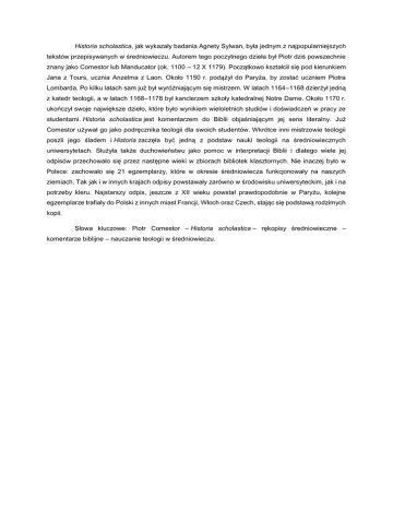 Historia scholastica, jak wykazały badania Agnety Sylwan, była jednym z najpopularniejszych tekstów przepisywanych w średniowieczu. Autorem tego poczytnego dzieła był Piotr dziś powszechnie znany jako Comestor lub Manducator (ok. 1100 – 12 X 1179). Początkowo kształcił się pod kierunkiem Jana z Tours, ucznia Anzelma z Laon. Około 1150 r. podążył do Paryża, by zostać uczniem Piotra Lombarda. Po kilku latach sam już był wyróżniającym się mistrzem. W latach 1164–1168 dzierżył jedną z katedr teologii, a w latach 1168–1178 był kanclerzem szkoły katedralnej Notre Dame. Około 1170 r. ukończył swoje największe dzieło, które było wynikiem wieloletnich studiów i doświadczeń w pracy ze studentami. Historia scholastica jest komentarzem do Biblii objaśniającym jej sens literalny. Już Comestor używał go jako podręcznika teologii dla swoich studentów. Wkrótce inni mistrzowie teologii poszli jego śladem i Historia zaczęła być jedną z podstaw nauki teologii na średniowiecznych uniwersytetach. Służyła także duchowieństwu jako pomoc w interpretacji Biblii i dlatego wiele jej odpisów przechowało się przez następne wieki w zbiorach bibliotek klasztornych. Nie inaczej było w Polsce: zachowało się 21 egzemplarzy, które w okresie średniowiecza funkcjonowały na naszych ziemiach. Tak jak i w innych krajach odpisy powstawały zarówno w środowisku uniwersyteckim, jak i na potrzeby kleru. Najstarszy odpis, jeszcze z XII wieku powstał prawdopodobnie w Paryżu, kolejne egzemplarze trafiały do Polski z innych miast Francji, Włoch oraz Czech, stając się podstawą rodzimych kopii. Słowa kluczowe: Piotr Comestor – Historia scholastica – rękopisy średniowieczne – komentarze biblijne – nauczanie teologii w średniowieczu.