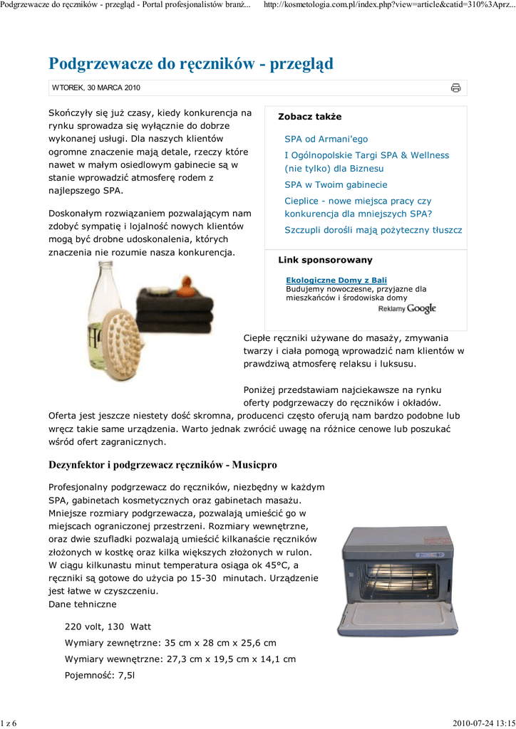 Podgrzewacze do ręczników - przegląd - Portal profesjonalistów branż... 1z6 http://kosmetologia.com.pl/index.php?view=article&catid=310%3Aprz... Podgrzewacze do ręczników - przegląd WTOREK, 30 MARCA 2010 Skończyły się już czasy, kiedy konkurencja na Zobacz także rynku sprowadza się wyłącznie do dobrze wykonanej usługi. Dla naszych klientów SPA od Armani'ego ogromne znaczenie mają detale, rzeczy które I Ogólnopolskie Targi SPA & Wellness nawet w małym osiedlowym gabinecie są w (nie tylko) dla Biznesu stanie wprowadzić atmosferę rodem z SPA w Twoim gabinecie najlepszego SPA. Cieplice - nowe miejsca pracy czy Doskonałym rozwiązaniem pozwalającym nam konkurencja dla mniejszych SPA? zdobyć sympatię i lojalność nowych klientów Szczupli dorośli mają pożyteczny tłuszcz mogą być drobne udoskonalenia, których znaczenia nie rozumie nasza konkurencja. Link sponsorowany Ekologiczne Domy z Bali Budujemy nowoczesne, przyjazne dla mieszkańców i środowiska domy www.organica.net.pl Ciepłe ręczniki używane do masaży, zmywania twarzy i ciała pomogą wprowadzić nam klientów w prawdziwą atmosferę relaksu i luksusu. Poniżej przedstawiam najciekawsze na rynku oferty podgrzewaczy do ręczników i okładów. Oferta jest jeszcze niestety dość skromna, producenci często oferują nam bardzo podobne lub wręcz takie same urządzenia. Warto jednak zwrócić uwagę na różnice cenowe lub poszukać wśród ofert zagranicznych. Dezynfektor i podgrzewacz ręczników - Musicpro Profesjonalny podgrzewacz do ręczników, niezbędny w każdym SPA, gabinetach kosmetycznych oraz gabinetach masażu. Mniejsze rozmiary podgrzewacza, pozwalają umieścić go w miejscach ograniczonej przestrzeni. Rozmiary wewnętrzne, oraz dwie szufladki pozwalają umieścić kilkanaście ręczników złożonych w kostkę oraz kilka większych złożonych w rulon. W ciągu kilkunastu minut temperatura osiąga ok 45°C, a ręczniki są gotowe do użycia po 15-30 minutach. Urządzenie jest łatwe w czyszczeniu. Dane tehniczne 220 volt, 130 Watt Wymiary zewnętrzne: 35 cm x 28 cm x 25,6 cm Wymiary wewnętrzne: 27,3 cm x 19,5 cm x 14,1 cm Pojemność: 7,5l 2010-07-24 13:15 Podgrzewacze do ręczników - przegląd - Portal profesjonalistów branż... 2z6 http://kosmetologia.com.pl/index.php?view=article&catid=310%3Aprz... Cena: 732 zł Podgrzewacz na ręczniki - Baylla Podgrzewacz na ręczniki służy do podgrzewania ręczników lub okładów działa na zasadzie podczerwieni. Stosowanie gorących ręczników może towarzyszyć praktycznie każdemu zabiegowi przeprowadzanego w gabinecie kosmetycznym, czy salonie SPA. W ciągu 5 minut temperatura osiąga 800 C, a ręczniki są gotowe do użycia po 15 minutach. Urządzenie jest łatwe w czyszczeniu. Podgrzewacz do ręczników Mini ? Bek i Bek Producent: Elite Exclusive Dane techniczne: wysokość: 25,9 cm szerokość: 35 cm głębokość: 26,5 cm moc: 130 W pojemność: 7,5l Cena: 700 zł Podgrzewacz do ręczników Hot Towel Cabin - Kosmoworld Aparat do podgrzewania ręczników lub okładów. Działa na zasadzie podczerwieni. Wytwarza temperaturę 70 lub 800C. Dane techniczne: 220 volt 35 cm x 28 cm x 25,6 cm Cena 732 zł 2010-07-24 13:15 Podgrzewacze do ręczników - przegląd - Portal profesjonalistów branż... 3z6 http://kosmetologia.com.pl/index.php?view=article&catid=310%3Aprz... Dezynfektor i podgrzewacz ręczników - Musicpro Aparat do ręczników lub okładów. Działa na zasadzie podczerwieni. W ciągu kilkunastu minut temperatura osiąga 45°C wewnątrz urządzenia , ręczniki są gotowe do użycia po 15-30 minutach. Urządzenie jest łatwe w czyszczeniu. Szafka ogrzewająca ręczniki zapewnia łatwy i niedrogi sposób na pozostawienie długotrwałego wrażenia wśród klientów. Dane techniczne: wymiary zewnętrzne: 45 cm x 28 cm x 35,5 cm wymiary wewnętrzne: 37,4 cm x 19,5 cm x 25 cm pojemność: 18l moc: 180 Watt Cena: 900 zł Podgrzewacz do ręczników - Bordomed Dane techniczne pojemność wewnętrzna: 18 litrów temperatura wewnątrz: 550C wymiary wewnętrzne: 375mm x 185mm x 150mm wymiary zewnętrzne: 450mm x 285mm x 357mm Cena: 940 zł Podgrzewacz WB 16-130 ? Ronomed SPA Dane techniczne: wymiary zewnętrzne dł x szer x wys: 775x500x495 mm wymiary wewnętrzne dł x szer x wys: 700x430x340 mm kontrola temperatury: elektronicznie sugerowana ilość okładów (300x400 mm): 16-18 zakres temperatury C: 30°C - 85°C szybki wzrost temperatury moc grzewcza: 1500 W zasilanie: 230 V, 50 Hz ruszt na okłady urządzenie ze stali nierdzewnej 2010-07-24 13:15 Podgrzewacze do ręczników - przegląd - Portal profesjonalistów branż... 4z6 http://kosmetologia.com.pl/index.php?view=article&catid=310%3Aprz... odpływ wody zabezpieczony zaworem kulowym Cena brutto: 8 560 zł Dezynfektor i podgrzewacz ręczników - Musicpro Aparat do ręczników lub okładów. Działa na zasadzie podczerwieni. Profesjonalny podgrzewacz do ręczników, przydatny w SPA, większych gabinetach kosmetycznych, oraz gabinetach masażu. Pokaźne rozmiary wewnętrzne, pozwalają umieścić kilkanaście ręczników różnej wielkości. Dane techniczne: temperatura wewnątrz: 550C wymiary zewnętrzne: długość 410mm x szerokość 440mm x wysokość 446m wymiary wewntęrzne: długość 330mm x szerokość 318mm x wysokość 145mm pojemność: 32l Cena: 1 400 zł Podgrzewacz ? Beaty Express Typ: PE470 Cena: ?195 (ok. 910 zł) Podgrzewacz do ręczników Beauty SPA Export 2010-07-24 13:15 Podgrzewacze do ręczników - przegląd - Portal profesjonalistów branż... 5z6 http://kosmetologia.com.pl/index.php?view=article&catid=310%3Aprz... Nowoczesne urządzenie, które pozwoli uatrakcyjnić i umilić niejeden zabieg kosmetyczny. Odpowiednia temperatura oraz dezynfekcja ozonem zapewni świeżość i czystość podgrzewanego ręcznika, który można wykorzystać m.in. do zmywania makijażu, peelingu itp. Cena: 690 zł Podgrzewacz do ręczników Maxi Bek i Bek Producent: Elite Exclusiv