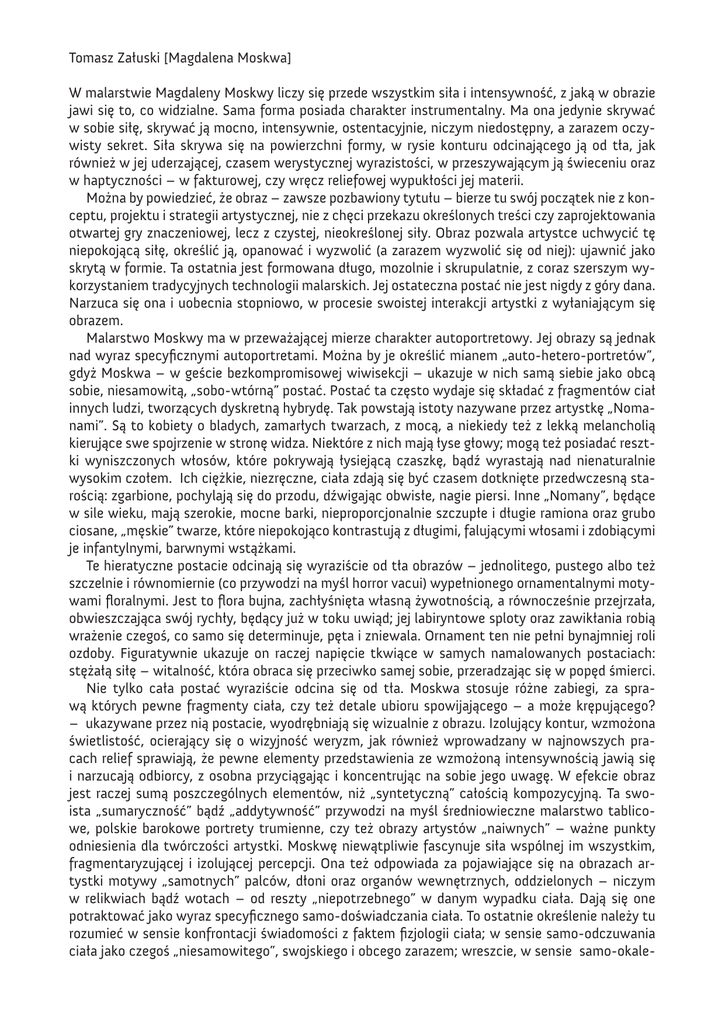 Tomasz Załuski [Magdalena Moskwa] W malarstwie Magdaleny Moskwy liczy się przede wszystkim siła i intensywność, z jaką w obrazie jawi się to, co widzialne. Sama forma posiada charakter instrumentalny. Ma ona jedynie skrywać w sobie siłę, skrywać ją mocno, intensywnie, ostentacyjnie, niczym niedostępny, a zarazem oczywisty sekret. Siła skrywa się na powierzchni formy, w rysie konturu odcinającego ją od tła, jak również w jej uderzającej, czasem werystycznej wyrazistości, w przeszywającym ją świeceniu oraz w haptyczności – w fakturowej, czy wręcz reliefowej wypukłości jej materii. Można by powiedzieć, że obraz – zawsze pozbawiony tytułu – bierze tu swój początek nie z konceptu, projektu i strategii artystycznej, nie z chęci przekazu określonych treści czy zaprojektowania otwartej gry znaczeniowej, lecz z czystej, nieokreślonej siły. Obraz pozwala artystce uchwycić tę niepokojącą siłę, określić ją, opanować i wyzwolić (a zarazem wyzwolić się od niej): ujawnić jako skrytą w formie. Ta ostatnia jest formowana długo, mozolnie i skrupulatnie, z coraz szerszym wykorzystaniem tradycyjnych technologii malarskich. Jej ostateczna postać nie jest nigdy z góry dana. Narzuca się ona i uobecnia stopniowo, w procesie swoistej interakcji artystki z wyłaniającym się obrazem. Malarstwo Moskwy ma w przeważającej mierze charakter autoportretowy. Jej obrazy są jednak nad wyraz specyficznymi autoportretami. Można by je określić mianem „auto-hetero-portretów”, gdyż Moskwa – w geście bezkompromisowej wiwisekcji – ukazuje w nich samą siebie jako obcą sobie, niesamowitą, „sobo-wtórną” postać. Postać ta często wydaje się składać z fragmentów ciał innych ludzi, tworzących dyskretną hybrydę. Tak powstają istoty nazywane przez artystkę „Nomanami”. Są to kobiety o bladych, zamarłych twarzach, z mocą, a niekiedy też z lekką melancholią kierujące swe spojrzenie w stronę widza. Niektóre z nich mają łyse głowy; mogą też posiadać resztki wyniszczonych włosów, które pokrywają łysiejącą czaszkę, bądź wyrastają nad nienaturalnie wysokim czołem. Ich ciężkie, niezręczne, ciała zdają się być czasem dotknięte przedwczesną starością: zgarbione, pochylają się do przodu, dźwigając obwisłe, nagie piersi. Inne „Nomany”, będące w sile wieku, mają szerokie, mocne barki, nieproporcjonalnie szczupłe i długie ramiona oraz grubo ciosane, „męskie” twarze, które niepokojąco kontrastują z długimi, falującymi włosami i zdobiącymi je infantylnymi, barwnymi wstążkami. Te hieratyczne postacie odcinają się wyraziście od tła obrazów – jednolitego, pustego albo też szczelnie i równomiernie (co przywodzi na myśl horror vacui) wypełnionego ornamentalnymi motywami floralnymi. Jest to flora bujna, zachłyśnięta własną żywotnością, a równocześnie przejrzała, obwieszczająca swój rychły, będący już w toku uwiąd; jej labiryntowe sploty oraz zawikłania robią wrażenie czegoś, co samo się determinuje, pęta i zniewala. Ornament ten nie pełni bynajmniej roli ozdoby. Figuratywnie ukazuje on raczej napięcie tkwiące w samych namalowanych postaciach: stężałą siłę – witalność, która obraca się przeciwko samej sobie, przeradzając się w popęd śmierci. Nie tylko cała postać wyraziście odcina się od tła. Moskwa stosuje różne zabiegi, za sprawą których pewne fragmenty ciała, czy też detale ubioru spowijającego – a może krępującego? – ukazywane przez nią postacie, wyodrębniają się wizualnie z obrazu. Izolujący kontur, wzmożona świetlistość, ocierający się o wizyjność weryzm, jak również wprowadzany w najnowszych pracach relief sprawiają, że pewne elementy przedstawienia ze wzmożoną intensywnością jawią się i narzucają odbiorcy, z osobna przyciągając i koncentrując na sobie jego uwagę. W efekcie obraz jest raczej sumą poszczególnych elementów, niż „syntetyczną” całością kompozycyjną. Ta swoista „sumaryczność” bądź „addytywność” przywodzi na myśl średniowieczne malarstwo tablicowe, polskie barokowe portrety trumienne, czy też obrazy artystów „naiwnych” – ważne punkty odniesienia dla twórczości artystki. Moskwę niewątpliwie fascynuje siła wspólnej im wszystkim, fragmentaryzującej i izolującej percepcji. Ona też odpowiada za pojawiające się na obrazach artystki motywy „samotnych” palców, dłoni oraz organów wewnętrznych, oddzielonych – niczym w relikwiach bądź wotach – od reszty „niepotrzebnego” w danym wypadku ciała. Dają się one potraktować jako wyraz specyficznego samo-doświadczania ciała. To ostatnie określenie należy tu rozumieć w sensie konfrontacji świadomości z faktem fizjologii ciała; w sensie samo-odczuwania ciała jako czegoś „niesamowitego”, swojskiego i obcego zarazem; wreszcie, w sensie samo-okale- czania, przypadkowego machinalnego, powstającego w trakcie zwykłych, codziennych czynności. W obrazach Moskwy można bowiem dostrzec liczne oznaki okaleczeń – przede wszystkim otarcia na knykciach przedstawianych postaci, powstałe jak gdyby w wyniku tarcia dłonią o chropowatą, raniącą powierzchnię. Ślady okaleczeń mają pobudzać u widza rodzaj instynktownego, niemalże cielesnego „współodczuwania”: dostrzegając je, może on sam doświadczać swego rodzaju wyobrażonego bądź widmowego bólu. Za ten dojmujący – w sensie ścisłym „patetyczny” – charakter komunikacji obrazu z odbiorcą odpowiada też werystyczna natarczywość, z jaką zostały oddane niektóre części ciała, np. dłonie. Co więcej, w najnowszych pracach cała powierzchnia obrazu narzuca się odbiorcy jako cielista materia, w której pojawiają się reliefowe wypukłości, wyrostki, a także fałdy okalające wklęsłości i otwory (w jednym z nich artystka umieściła kłębek prawdziwych włosów). Prace te ewokują 