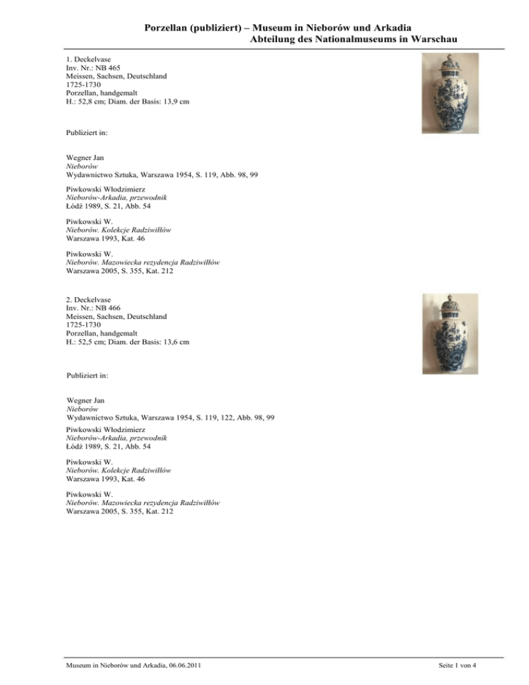 Porzellan (publiziert) – Museum in Nieborów und Arkadia Abteilung des Nationalmuseums in Warschau 1. Deckelvase Inv. Nr.: NB 465 Meissen, Sachsen, Deutschland 1725-1730 Porzellan, handgemalt H.: 52,8 cm; Diam. der Basis: 13,9 cm Publiziert in: Wegner Jan Nieborów Wydawnictwo Sztuka, Warszawa 1954, S. 119, Abb. 98, 99 Piwkowski Włodzimierz Nieborów-Arkadia, przewodnik Łódź 1989, S. 21, Abb. 54 Piwkowski W. Nieborów. Kolekcje Radziwiłłów Warszawa 1993, Kat. 46 Piwkowski W. Nieborów. Mazowiecka rezydencja Radziwiłłów Warszawa 2005, S. 355, Kat. 212 2. Deckelvase Inv. Nr.: NB 466 Meissen, Sachsen, Deutschland 1725-1730 Porzellan, handgemalt H.: 52,5 cm; Diam. der Basis: 13,6 cm Publiziert in: Wegner Jan Nieborów Wydawnictwo Sztuka, Warszawa 1954, S. 119, 122, Abb. 98, 99 Piwkowski Włodzimierz Nieborów-Arkadia, przewodnik Łódź 1989, S. 21, Abb. 54 Piwkowski W. Nieborów. Kolekcje Radziwiłłów Warszawa 1993, Kat. 46 Piwkowski W. Nieborów. Mazowiecka rezydencja Radziwiłłów Warszawa 2005, S. 355, Kat. 212 Museum in Nieborów und Arkadia, 06.06.2011 Seite 1 von 4 3. Deckelvase Inv. Nr.: NB 467 Meissen, Sachsen, Deutschland 1725-1730 Porzellan, handgemalt H.: 40,8 cm; Diam. der Basis: 13,6 cm Publiziert in: Wegner Jan Nieborów Wydawnictwo Sztuka, Warszawa 1954, S. 119, 122, Abb. 98, 99 Piwkowski Włodzimierz Nieborów-Arkadia, przewodnik Łódź 1989, S. 21, Abb. 54 Piwkowski W. Nieborów. Kolekcje Radziwiłłów Warszawa 1993, Kat. 46 Piwkowski W. Nieborów. Mazowiecka rezydencja Radziwiłłów Warszawa 2005, S. 355, Kat. 212 4. Deckelvase Inv. Nr.: NB 468 Meissen, Sachsen, Deutschland 1725-1730 Porzellan, handgemalt H.: 41,3 cm; Diam. der Basis: 13,5 cm Publiziert in: Wegner Jan Nieborów Wydawnictwo Sztuka, Warszawa 1954, S. 119, 122, Abb. 98, 99 Piwkowski Włodzimierz Nieborów-Arkadia, przewodnik Łódź 1989, S. 21, Abb. 54 Piwkowski W. Nieborów. Kolekcje Radziwiłłów Warszawa 1993, Kat. 46 Piwkowski W. Nieborów. Mazowiecka rezydencja Radziwiłłów Warszawa 2005, S. 355, Kat. 212 Museum in Nieborów und Arkadia, 06.06.2011 Seite 2 von 4 5. Deckelvase Inv. Nr.: NB 469 Meissen, Sachsen, Deutschland 1725-1730 Porzellan, handgemalt H.: 40,4 cm; Diam. der Basis: 16,5 cm Publiziert in: Wegner Jan Nieborów Wydawnictwo Sztuka, Warszawa 1954, S. 119, 122, Abb. 98, 99 Piwkowski Włodzimierz Nieborów-Arkadia, przewodnik Łódź 1989, S. 21, Abb. 54 Piwkowski W. Nieborów. Kolekcje Radziwiłłów Warszawa 1993, Kat. 46 Piwkowski W. Nieborów. Mazowiecka rezydencja Radziwiłłów Warszawa 2005, S. 355, Kat. 212 6. Deckelvase Inv. Nr.: NB 470 Meissen, Sachsen, Deutschland 1725-1730 Porzellan, painting H.: 43,8 cm; Diam. der Basis: 15,4 cm Publiziert in: Wegner Jan Nieborów Wydawnictwo Sztuka, Warszawa 1954, S. 119, 122, Abb. 98, 99 Piwkowski Włodzimierz Nieborów-Arkadia, przewodnik Łódź 1989, S. 21, Abb. 54 Piwkowski W. Nieborów. Kolekcje Radziwiłłów Warszawa 1993, Kat. 46 Piwkowski W. Nieborów. Mazowiecka rezydencja Radziwiłłów Warszawa 2005, S. 355, Kat. 212 Museum in Nieborów und Arkadia, 06.06.2011 Seite 3 von 4 7. Unterschale Inv. Nr.: NB 1159 Meissen, Sachsen, Deutschland Johann Gregorius Höroldt 1725-1730 Porzellan, Bemalung, Vergoldnung 2,8 x 20,1 cm Publiziert in: Wegner Jan Nieborów Wydawnictwo Sztuka, Warszawa 1954, Abb. 100 Piwkowski W. Nieborów. Kolekcje Radziwiłłów Warszawa 1993, Kat. 47 Piwkowski W. Nieborów. Mazowiecka rezydencja Radziwiłłów Warszawa 2005, S. 355, Kat. 213 8. Doppelhenkelbecher Inv. Nr.: NB 1163 Meissen, Sachsen, Deutschland Johann Gregorius Höroldt 1725-1730 Porzellan, Bemalung, Vergoldnung 7,8 x 12 cm Publiziert in: Wegner Jan Nieborów Wydawnictwo Sztuka, Warszawa 1954, Abb. 100 Piwkowski W. Nieborów. Kolekcje Radziwiłłów Warszawa 1993, Kat. 47 Piwkowski W. Nieborów. Mazowiecka rezydencja Radziwiłłów Warszawa 2005, S. 355, Kat. 213 9. Deckelterrine Inv. Nr.: NB 808 Meissen, Sachsen, Deutschland Um 1740 Porzellan, Bemalung, Vergoldnung 30,9 x 14,7 x 11,8 cm Publiziert in: Piwkowski Włodzimierz Nieborów-Arkadia, przewodnik Łódź 1989, S. 19, Abb. 51 Piwkowski W. Nieborów. Mazowiecka rezydencja Radziwiłłów Warszawa 2005, S. 355, Kat. 211 Museum in Nieborów und Arkadia, 06.06.2011 Seite 4 von 4