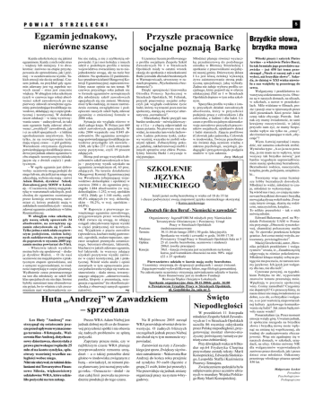 P O W I A T 5 S T R Z E L E C K I Egzamin jednakowy, Przysz³e pracownice nierówne szanse socjalne poznaj¹ Barkê Ka¿da szko³a koñczy siê jakim bie nie radz¹, a nie z szybkoci¹ od- - wiêkszy lub mniejszy. I to dwu- szkó³ o podobnym profilu z terenu egzaminem. Ka¿dy z nich rodzi stres powiedzi. I ja i moi koledzy z innych krotnie: zarówno na etapie przystê- województwa zwracalimy na to nie- niej w oczekiwaniu na wyniki. Ta- efektów. Na spotkaniu 22 padzierni- powania do sprawdzianu, jak i pó- kich emocji nie da siê unikn¹æ. Cza- ka z przedstawicielami Okrêgowej Ko- w Warm¹towicach, utworzony w ra- wych zasad stres jest znacznie czerwcu przysz³ego roku jednak nic (czyli w czerwcu tego roku) absolwenci szkó³ zawodowych po raz pierwszy zdawali zewnêtrzne egza- domnoci). Orodka specjalnych siê nie zmieni. Mo¿emy przyszli pracownicy socjalni zoba- dla m³odzie¿y szkó³ zawodowych mieæ tylko nadziejê, ¿e nasze zastrze- tycznej i teoretycznej. W dodatku egzaminy o zmienionej formule w resort edukacji w imiê wyrówny- opieczni naszych szkó³ bêd¹ zdawaæ 2006 roku. Sytuacja nie wygl¹da ró¿owo w sam egzamin bêd¹ zdawaæ absol- skali ca³ego kraju. W Polsce jest 469 i ci ze szkó³ specjalnych z lekkim roku 2004 wypuci³y one 8.845 ab- wenci zwyk³ych zawodówek, jak upoledzeniem umys³owym. Tyle tylko, ¿e na rozwi¹zywanie testu maj¹ wiêcej czasu o pó³ godziny. Warunkiem otrzymania dyplomu potwierdzaj¹cego kwalifikacje zawo- dowe jest jednak zdanie egzaminu w obu etapach: teoretycznym (sk³ada- j¹cym siê z dwóch czêci) i prak- tycznym. Zawodowej przy SOSW w Leni- cy. Ci uczniowie, którzy maj¹ praktykê w warsztatach szkolnych, pod- chodz¹ do egzaminu ocenianego przez komisjê zewnêtrzn¹, natomiast ci, którzy praktyki maj¹ w 1268, ale tylko 237 z nich otrzyma³o oceny pozytywne, czyli 19 procent zdaj¹cych. Bior¹c pod uwagê wszystkich ab- solwentów szkó³ zawodowych w kra- ju pozytywny wynik uzyska³o na zdaj¹cych. Na terenie dzia³alnoci uczniowie nie maj¹ k³opotów z praktycznym etapem sprawdzianu, ani z ustnymi wypowiedziami, to trud- noci napotykaj¹ w czêci pisemnej. Wyd³u¿enie czasu przeznaczonego na test dla m³odzie¿y ze szkó³ lub 60,4% zdaj¹cych (w woj. dolnol¹- skim 58,2%, w woj. opolskim - - Mieszkañcy Barki przyjêli nas cz³owieka, z ludmi i dla ludzi. Li- natywna normalnoæ. bardzo serdecznie mówi¹ dziewczy- ny z I Ls z chêci¹ odpowiadali na widaæ, ¿e mieszka tam wielu fachowwy wystrój; wszystko to zrobili w³a- W Raporcie z pierwszego ze- ceum o profilu socjalnym ukierunko- wuje zawodowo przysz³ych pracow- i ludzi starszych. Zajêcia profilowe w rodowisku, Twórcze przeobra¿a- zakresu psychologii, socjologii, pe- ³ymy historiê Barki i zwyczaje w studiów w tym zakresie. innych sprzêtów oraz chlew. Poznaniej panuj¹ce. dagogiki i przygotowuj¹ do podjêcia Jerzy Malczyk w czêci praktycznej ni¿ teoretycz- nej. Wyj¹tkiem z piêciu zawodów mii, ogrodnik, malarz-tapeciarz, ope- nego, betoniarz-zbrojarz, lakiernik, blacharz) w jakich zdawano egzamin, by³ lakiernik: tu wszyscy zdaj¹cy no w czêci teoretycznej, jak i praktycznej. Wród wielu analiz i opinii zawartych w tym opracowaniu jesz- cze jedna kwestia wydaje siê warta za- stanowienia - skala stresu, towarzy- chodz¹ z obserwacji samych egzaminatorów). ne s¹ w naszych domach, na ulicach, w szko³ach, a nawet w przedszko- lach. Mile widziane w filmach, pro- zie i poezji oraz w piewanych przez idoli piosenkach. Kto powie: Jakie czasy takie obyczaje. Prawda. Jed- nak czy mamy wiadomoæ, ¿e sami kreujemy rzeczywistoæ, w jakiej przysz³o nam ¿yæ, ¿e mamy bezporedni wp³yw nie tylko na czasy, ale równie¿ na panuj¹ce w nich obyczaje? Wiem. £atwiej narzekaæ i maru- dziæ, ni¿ samemu cokolwiek zrobiæ. Wymówka typu: A co ja na to pora- dzê, ja nie mam na to wp³ywu, teraz wszyscy tak brzydko mówi¹ jest bardzo wygodnym usprawiedliwie- Tworzymy wiêc coraz liczniej- S¹ wród nas i tacy, co czuj¹ siê za¿e- nowani brzydkimi s³owami i brzydk¹ mow¹ jak¹ s³ysz¹ wokó³ siebie. Zwra- caj¹ innym uwagê, skar¿¹ siê rodzi- Pracy w Strzelcach Opolskich redniozaawansowany com, nauczycielom, ksiêdzu... To relikty przesz³oci tak o nich mówi¹ m³odzi. Edward Balcerzan, prof. na Wy- dziale Polonistyki UAM w Poznaniu przyznaje Obecnoæ rynsztokowej, chamskiej polszczyzny nasila 30.11.04 do lutego 2005 ( 50 godz. lekcyjnych); siê. To zjawisko przekracza kolejne Powiatowy Urz¹d Pracy w Strzelcach Opolskich Sala nr 5 tocenzury, powci¹gliwoci. 200z³. (osoby pracuj¹ce) nika polskich przekleñstw i wulga- kursu, pod warunkiem obecnoci na min. 90% zajêæ odgrywaj¹ tu ró¿nice pokoleniowe. Spotkania we wtorki i czwartki w godz. 16:00-17:30 25 z³. (osoby bezrobotne, uczniowie i studenci) 50z³. - kaucja zwracana jest uczestnikom na koniec (22 z 25 spotkañ) granice. Jest coraz mniej wstydu, auMaciej Grochowski, autor S³ow- ryzmów uwa¿a, i¿ Zasadnicz¹ rolê M³odzie¿ kln¹ca miêdzy sob¹ na po- Pierwszeñstwo udzia³u w kursie maj¹ osoby bezrobotne. Uczestnicy otrzymuj¹ do dyspozycji podrêcznik i zeszyt æwiczeñ. Zajêcia prowadzi wykwalifikowany lektor, mgr filologii germañskiej. Na zakoñczenie uczestnicy otrzymuj¹ zawiadczenie udzia³u w kursie. têgê nie ma poczucia, ¿e narusza nor- my jêzykowe. Ich jêzyk jest wulgarny dla nas, nie dla nich. Cytowane powy¿ej, za tygodni- Kurs finansowany jest ze rodków Fundacji kiem Polityka /nr 46/, wypowiedzi Spotkanie organizacyjne dnia 30.11.2004r. godz. 16:00 Wpêdzaj¹ w poczucie spo³ecznej ul. Gogoliñska 2a, sala nr 5. nie dopatrzyli? Co przeoczylimy, ¿e sz¹cego zdaj¹cym: zdenerwowanie, gnacja z egzaminu (te okrelenia po- Wulgaryzmy i przekleñstwa to- warzysz¹ codziennemu ¿yciu. Obec- je, m³odzie¿ to wykorzystuje. Towarzystwie Owiatowym i Powiatowy Urz¹d Kaucja: serca. M³odzie¿ to widzi, m³odzie¿ to czu- Organizatorzy: JugendFORUM m³odych przy Niemieckim uz
