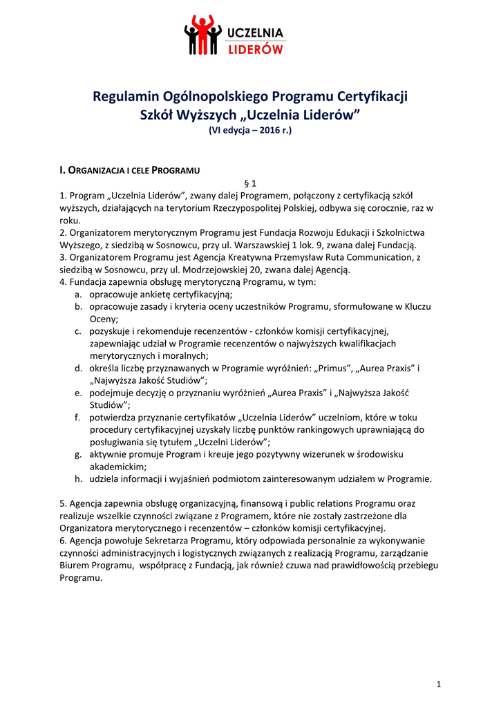 Regulamin Ogólnopolskiego Programu Certyfikacji Szkół Wyższych „Uczelnia Liderów” (VI edycja – 2016 r.) I. ORGANIZACJA I CELE PROGRAMU §1 1. Program „Uczelnia Liderów”, zwany dalej Programem, połączony z certyfikacją szkół wyższych, działających na terytorium Rzeczypospolitej Polskiej, odbywa się corocznie, raz w roku. 2. Organizatorem merytorycznym Programu jest Fundacja Rozwoju Edukacji i Szkolnictwa Wyższego, z siedzibą w Sosnowcu, przy ul. Warszawskiej 1 lok. 9, zwana dalej Fundacją. 3. Organizatorem Programu jest Agencja Kreatywna Przemysław Ruta Communication, z siedzibą w Sosnowcu, przy ul. Modrzejowskiej 20, zwana dalej Agencją. 4. Fundacja zapewnia obsługę merytoryczną Programu, w tym: a. opracowuje ankietę certyfikacyjną; b. opracowuje zasady i kryteria oceny uczestników Programu, sformułowane w Kluczu Oceny; c. pozyskuje i rekomenduje recenzentów - członków komisji certyfikacyjnej, zapewniając udział w Programie recenzentów o najwyższych kwalifikacjach merytorycznych i moralnych; d. określa liczbę przyznawanych w Programie wyróżnień: „Primus”, „Aurea Praxis” i „Najwyższa Jakość Studiów”; e. podejmuje decyzję o przyznaniu wyróżnień „Aurea Praxis” i „Najwyższa Jakość Studiów”; f. potwierdza przyznanie certyfikatów „Uczelnia Liderów” uczelniom, które w toku procedury certyfikacyjnej uzyskały liczbę punktów rankingowych uprawniającą do posługiwania się tytułem „Uczelni Liderów”; g. aktywnie promuje Program i kreuje jego pozytywny wizerunek w środowisku akademickim; h. udziela informacji i wyjaśnień podmiotom zainteresowanym udziałem w Programie. 5. Agencja zapewnia obsługę organizacyjną, finansową i public relations Programu oraz realizuje wszelkie czynności związane z Programem, które nie zostały zastrzeżone dla Organizatora merytorycznego i recenzentów – członków komisji certyfikacyjnej. 6. Agencja powołuje Sekretarza Programu, który odpowiada personalnie za wykonywanie czynności administracyjnych i logistycznych związanych z realizacją Programu, zarządzanie Biurem Programu, współpracę z Fundacją, jak również czuwa nad prawidłowością przebiegu Programu. 1 §2 Celem Programu jest: a. Identyfikowanie najlepszych uczelni i wartościowych ofert na rynku szkolnictwa wyższego; b. Identyfikowanie uczelni wdrażających najbardziej zaawansowane i innowacyjne systemy poprawy jakości kształcenia; c. Wyróżnianie i promowanie uczelni wspierających edukację praktyczną studentów – edukację liderów dla rynku pracy; d. Dostarczanie uczelniom wsparcia eksperckiego w zakresie zapewniania jakości kształcenia i projektowania koncepcji kształcenia, zgodnie z potrzebami otoczenia społeczno-gospodarczego; e. Wyróżnianie i promowanie uczelni realizujących kształcenie w oparciu o nowoczesne, innowacyjne programy studiów, zgodnie z potrzebami rynku pracy; f. Wyróżnianie i promowanie uczelni aktywnie dbających o przyszłość swoich absolwentów, pomagających im w „dobrym starcie” na rynku pracy; g. Wyróżnienie uczelni inwestujących we współpracę międzynarodową, aktywnie realizujących programy europejskie; h. Wyróżnienie uczelni osiągających sukcesy w dziedzinie pozyskiwania funduszy zewnętrznych na cele dydaktyczne i naukowo-badawcze; i. Zwiększanie zainteresowania kandydatów na studia ofertą szkół wyższych wyróżnionych certyfikatem „Uczelnia Liderów”; j. Wspieranie współpracy uczelni ze środowiskiem gospodarczym i biznesowym, k. Propagowanie idei społecznej odpowiedzialności uczelni i przedsiębiorczości akademickiej; l. Promowanie rektorów uczelni działających na rzecz rozwoju edukacji dla rynku pracy; m. Budowanie wizerunku certyfikowanych uczelni jako szkół nowoczesnych, innowacyjnych, przedsiębiorczych, dbających o losy swoich absolwentów; n. Propagowanie wysokich standardów w zakresie edukacji akademickiej; o. Propagowanie „dobrych praktyk” w szkolnictwie wyższym; p. Wspieranie uczelni w działaniach na rzecz rozwoju edukacji dla rynku pracy. §3 1. Certyfikat „Uczelnia Liderów” mogą otrzymać szkoły wyższe, zarejestrowane i prowadzące działalność na terytorium Rzeczypospolitej Polskiej, które spełniają wszystkie bądź niektóre z poniższych kryteriów: a. kształcą u swoich studentów kreatywność, pomysłowość i postawy pro-innowacyjne; b. zapewniają edukację praktyczną swoich studentów; c. starają się kształtować własną ofertę edukacyjną, uwzględniając potrzeby rynku pracy w Polsce i Unii Europejskiej oraz tendencje tam występujące; d. starają się dostosowywać treści i metody kształcenia do oczekiwań otoczenia zewnętrznego, w szczególności otoczenia gospodarczego; e. wdrażają nowoczesne, zaawansowane i innowacyjne systemy poprawy jakości kształcenia, f. zapewniają udział podmiotów z otoczenia społeczno-gospodarczego w procesie kształcenia, g. promują przedsiębiorczość akademicką; h. dbają o to, by przekazywać studentom wiedzę i umiejętności użyteczne na rynku pracy; i. wspierają innowacje edukacyjne; j. aktywnie współpracują z otoczeniem społecznym i gospodarczym; k. promują społeczną odpowiedzialność uczelni; l. monitorują losy oraz aktywnie wspierają rozwój zawodowy i kariery swoich absolwentów oraz w inny sposób wspierają przedsięwzięcia, mające na celu zapewnienie absolwentom „dobrego startu” na rynku pracy. 2. Przyznanie certyfikatu „Uczelnia Liderów” oznacza, że uczelnia uczestnicząca w Programie: a. stara się kształcić liderów – absolwentów kreatywnych, innowacyjnych, twórczych; b. wyróżnia się na tle innych uczelni jako inwestująca w kształcenie dla rynku pracy i otoczenia gospodarczego; c. aktywnie współpracuje z otoczeniem społecznym, w tym otoczeniem międzynarodowym; d. w sposób szczególny dba o praktyczną edukację swoich studentów oraz przygotowuje ich, by mo