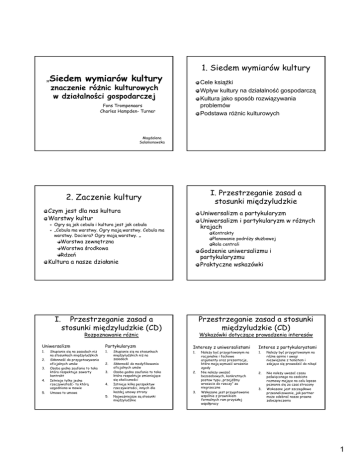 1. Siedem wymiarów kultury „Siedem wymiarów kultury Cele książki Wpływ kultury na działalność gospodarczą Kultura jako sposób rozwiązywania problemów Podstawa różnic kulturowych znaczenie różnic kulturowych w działalności gospodarczej Fons Trompenaars Charles Hampden- Turner Magdalena Salamonowska I. Przestrzeganie zasad a stosunki międzyludzkie 2. Zaczenie kultury Czym jest dla nas kultura Warstwy kultur Uniwersalizm a partykularyzm Uniwersalizm i partykularyzm w różnych krajach Ogry są jak cebula i kultura jest jak cebula „Cebula ma warstwy. Ogry mają warstwy. Cebula ma warstwy. Dociera? Ogry mają warstwy. „ Kontrakty Planowanie podróży służbowej Rola centrali Warstwa zewnętrzna Warstwa środkowa Rdzeń Godzenie uniwersalizmu i partykularyzmu Praktyczne wskazówki Kultura a nasze działanie I. Przestrzeganie zasad a stosunki międzyludzkie (CD) Przestrzeganie zasad a stosunki międzyludzkie (CD) Rozpoznawanie różnic Uniwersalizm Partykularyzm 1. 1. 2. 3. 4. 5. Skupianie się na zasadach niż na stosunkach międzyludzkich Skłonność do przygotowywania oficjalnych umów Osoba godna zaufania to taka która respektuje zawarty kontrakt Istnieje tylko jedna rzeczywistość- ta którą uzgodniono w mowie Umowa to umowa 2. 3. 4. 5. Skupianie się na stosunkach międzyludzkich niż na zasadach Skłonność do modyfikowania oficjalnych umów Osoba godna zaufania to taka która respektuje zmieniające się okoliczności Istnieje kilka perspektyw rzeczywistości, innych dla każdej umowy strony Najważniejsze są stosunki międzyludzkie Wskazówki dotyczące prowadzenia interesów Interesy z uniwersalistami Interes z partykularystami 1. 1. Należy być przygotowanym na różne opinie i uwagi niezwiązane z tematem i zdające się prowadzić do nikąd 2. Nie należy uważać czasu poświęconego na osobiste rozmowy mające na celu lepsze poznanie się za czas stracony Wskazane jest szczegółowe przeanalizowanie, jak partner może odebrać nasze prawne zabezpieczenia 2. 3. Należy być przygotowanym na racjonalne i fachowe argumenty oraz prezentacje, które mają wymusić wrażenie zgody Nie należy uważać bezosobowych, konkretnych postaw typu „przejdźmy wreszcie do rzeczy” za niegrzeczne Wskazane jest przygotowanie wspólnie z prawnikiem formalnych ram przyszłej współpracy 3. 1 Przestrzeganie zasad a stosunki międzyludzkie (CD) II. Stosunek do jednostki i grupy Wskazówki dla zarządzających i zarządzanych Uniwersalizm Partykularyzm 1. 1. 2. 3. 4. 5. Należy dążyć do niezmienności i jednolitych procedur Dobrze jest opracować formalne wzorce prowadzenia działalności Modyfikowanie systemu tak, żeby system modyfikował wzajemne relacje Sygnalizowanie zmian publicznie Należy działąć sprawiedliwie, traktując wszystkie podobne przypadki w taki sam sposób 2. 3. 4. 5. Indywidualizm i kolektywizm religia Dobrze jest budować nieformalne sieci i tworzyć prywatne porozumienia Należy próbować nieformalnie zmieniać przyjęte formalnie wzorce prowadzenia działalności Modyfikowanie wzajemnych relacji tak, żeby modyfikować systemy Wywieranie prywatnych nacisków Należy działać sprawiedliwie, traktując wszystkie przypadki w zależności od ich szczególnych cech Czy nowoczesność zakłada indywidualizm Indywidualizm i kolektywizm w międzynarodowej działalności gospodarczej Różnice w strukturze organizacyjnej Praktyczne wskazówki Stosunek do jednostki i grupy (CD) Stosunek do jednostki i grupy (CD) Rozpoznawanie różnic Wskazówki dotyczące prowadzenia interesów Indywidualizm Kolektywizm 1. 2. 1. 2. 3. 4. Częste używanie zaimka „ja” Decyzje podejmowane na miejscu przez przedstawicieli Ludzie samodzielnie osiągają cele i ponoszą osobistą odpowiedzialność Wakacje spędzane parami a nawet samotnie 3. 4. Częste używanie zaimka „my” Decyzje przekazywane przez delegata organizacji Ludzie osiągają cele grupowo, co zakłada zbiorową odpowiedzialność Wakacje spędzane w zorganizowanych grupach Interesy z Indywidualistami 1. 2. 3. 4. Stosunek do jednostki i grupy (CD) Wskazówki dla zarządzających i zarządzanych Indywidualizm Kolektywizm 1. 1. 2. 3. 4. Należy próbować dostosować potrzeby jednostek do potrzeb organizacji Trzeba być przygotowanym na duża fluktuację kadr i mobilność załogi Należy wyszukać przodowników pracy, rekordzistów i kandydatów do specjalnych wyróżnień Zalecanie dawanie ludziom swobody wykazania się indywidualną inicjatywą 2. 3. 4. Dobrze jest starać się łączyć osobowości z autorytetami w grupie Wskazana dbałość o małą fluktuację kadr i mobilność załogi Należy chwalić całą grupę i unikać faworyzowania jednostki Zalecane wyznaczenie celów nadrzędnych, które wszyscy mogą osiągnąć Trzeba być przygotowanym na szybkie decyzje i niespodziewane oferty nie konsultowane z centralą Negocjator może podejmować zobowiązania w imieniu tych, którzy go delegowali, i bardzo niechętnie wycofują się z obietnic Samodzielne załatwianie interesów świadczy, że dana osoba cieszy się poważaniem w swojej firmie Celem jest szybkie sfinalizowanie tranzakcji Interesy z Kolektywistami 1. 2. 3. 4. Trzeba okazywać cierpliwość podczas konsultacji i dochodzenia do jednomyślności Negocjator może zgodzić się na cos tylko tymczasowo i wycofać się z obietnicy po konsultacji z przełożonymi Prowadzenie interesów w otoczeniu pomocników oznacza, że ta osoba ma wysoką pozycje w swoje firmie Celem jest stworzenie trwałych więzi III. Uczucia i relacja Kultury emocjonalne a kultury powściągliwe Stopnie emocjonalności w różnych kulturach Porozumiewanie się międzykulturowe Praktyczne wskazówki 2 III. Uczucia i relacja (CD) III. Uczucia i relacja (CD) Rozpoznawanie różnic Wskazówki dotyczące prowadzenia interesów Powściągliwość 1. 2. 3. 4. 5. 6. Ludzie nie ujawniają co myślą albo co czują W wyjątkowych sytuacjach mogą ujawnić napięcie 