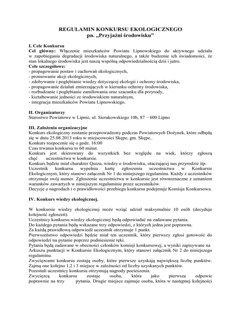 REGULAMIN KONKURSU EKOLOGICZNEGO pn. ,,Przyjaźni środowisku” I. Cele Konkursu Cel główny: Włączenie mieszkańców Powiatu Lipnowskiego do aktywnego udziału w zapobieganiu degradacji środowiska naturalnego, a także budzenie ich świadomości, że stan lokalnego środowiska jest naszą wspólną odpowiedzialnością dziś i jutro. Cele szczegółowe: - propagowanie postaw i zachowań ekologicznych, - promowanie akcji ekologicznych, - zdobywanie i pogłębianie wiedzy dotyczącej ekologii i ochrony środowiska, - propagowanie działań zmierzających w kierunku ochrony środowiska, - rozbudzanie i pogłębianie zamiłowania oraz szacunku dla przyrody, - kształtowanie jedności ze środowiskiem naturalnym, - integracja mieszkańców Powiatu Lipnowskiego. II. Organizatorzy Starostwo Powiatowe w Lipnie, ul. Sierakowskiego 10b, 87 – 600 Lipno III. Założenia organizacyjne Konkurs ekologiczny zostanie przeprowadzony podczas Powiatowych Dożynek, które odbędą się w dniu 25.08.2013 roku w miejscowości Skępe, gm. Skępe.. Konkurs rozpocznie się o godz. 16:00 Czas trwania konkursu to 60 minut. Konkurs jest skierowany do wszystkich bez względu na wiek, którzy zgłoszą chęć uczestnictwa w konkursie. Konkurs będzie miał charakter Quizu, wiedzy o środowisku, otaczającej nas przyrodzie itp. Uczestnik konkursu wypełnia kartę zgłoszenia uczestnictwa w Konkursie Ekologicznym, który stanowi załącznik Nr 1 do niniejszego regulaminu. Każdy z uczestników otrzymuje swój numer. Zgłoszenie uczestnictwa w konkursie jest równoznaczne z uznaniem warunków zawartych w niniejszym regulaminie przez uczestników. Decyzje o nagrodach i o prawidłowości przebiegu konkursu podejmuje Komisja Konkursowa. IV. Konkurs wiedzy ekologicznej. W konkursie wiedzy ekologicznej może wziąć udział maksymalnie 10 osób (decyduje kolejność zgłoszeń). Uczestnicy konkursu wiedzy ekologicznej będą odpowiadać na zadawane pytania. Do każdego pytania będą wskazane trzy odpowiedzi, z których jedna jest poprawna. Za każdą prawidłową odpowiedź uczestnik otrzymuje 1 punkt. Pierwszeństwo odpowiedzi będzie miał ten uczestnik, który pierwszy zgłosi gotowość do odpowiedzi na pytanie poprzez podniesienie ręki. Pytania będą zadawane w obecności członków komisji konkursowej, a wyniki zapisywane na Arkuszu punktacji w Konkursie Ekologicznym, który stanowi załącznik Nr 2 do niniejszego regulaminu. Zwycięzcami konkursu zostają osoby, które pierwsze uzyskają największą liczbę punktów. Zajmą one kolejno 1,2 i 3 miejsce w zależności od liczby uzyskanych punktów. Pozostali uczestnicy konkursu otrzymują nagrody pocieszenia. Zwycięzcą konkursu zostaje osoba, która jako pierwsza odpowie poprawnie na trzy pytania. Drugie miejsce zajmuje osoba, która w następnej kolejności odpowie poprawnie na dwa pytania. Trzecie miejsce zajmuje osoba, która jako trzecia odpowie poprawnie na dwa pytania. W przypadku uzyskania równej maksymalnej liczby punktów przeprowadzona zostaje dogrywka, w której prowadzący zadaje pytanie do uczestników, którzy mają jednakową liczbę punktów. Odpowiada osoba, która zgłosi się jako pierwsza przez podniesienie ręki. Za każdą prawidłową odpowiedź uczestnik otrzymuje 1 punkt. Uzyskane punkty będą zapisywane przez członków Komisji Konkursowej na Arkuszu punktacji w Konkursie Ekologicznym, który stanowi załącznik Nr 2 do niniejszego regulaminu. Zwycięzcą konkursu zostaje osoba, która jako pierwsza odpowie poprawnie na dwa pytania. Drugie miejsce zajmuje osoba, która w następnej kolejności odpowie poprawnie na dwa pytania. Trzecie miejsce zajmuje osoba, która jako trzecia odpowie poprawnie na dwa pytania. Dogrywka przeprowadzana jest na tych samych zasadach w przypadku uzyskania równej liczby punktów uniemożliwiających wyłonienie miejsca 1, 2 lub 3 i dotyczy miejsca (miejsc), którego nie udało się wyłonić w etapie głównym. Dogrywka o miejsce (miejsca) niższe – 2 i 3 rozgrywa się odpowiednio w przypadku wyłonienia już w etapie głównym miejsca 1 lub tylko o miejsce 3 (w przypadku wyłonienia już w etapie głównym miejsca 1 i 2) w zależności od wyników etapu głównego konkursu. Pytania konkursowe opracowane przez Komisję Konkursową będą dotyczyły następujących zagadnień: 1. ekologii, 2. problemów ochrony środowiska, a w szczególności najbliższego regionu, 3. przyrody ożywionej i nieożywionej z uwzględnieniem najbliższego regionu, 4. zjawisk globalnych, 5. klimatu Ziemi (budowa atmosfery; źródła, rodzaje i skutki zanieczyszczenia powietrza atmosferycznego), 6. sposobów ochrony klimatu Ziemi (racjonalne gospodarowanie odpadami; oszczędzanie energii).. V. Komisja Konkursowa 1. Komisję Konkursową w składzie 3 osobowym powołuje Zarząd Powiatu w Lipnie. 2. Pracą Komisji Konkursowej kieruje Przewodniczący wybrany przez Zarząd Powiatu w Lipnie. 3. Decyzje Komisji Konkursowej są ostateczne, nie przewiduje się od nich środków odwoławczych. 4. W sprawach spornych Komisja zajmuje stanowisko w drodze głosowania większością głosów. VI. Nagrody 1. Laureaci konkursu otrzymają nagrody rzeczowe – 3 nagrody sprzęt RTV, AGD lub sportowy. 2. Pozostali uczestnicy konkursu otrzymają nagrody za udział w Konkursie: - 7 zestawów artykułów biurowych lub gier, 3. Nagrody zostaną wydane bezpośrednio po zakończeniu konkursu za pokwitowaniem ich odbioru na podstawie protokołów odbioru nagród, które stanowią załączniki nr 3 i 4 do niniejszego regulaminu. 4. Zakup nagród został dofinansowany ze środków Wojewódzkiego Funduszu Ochrony Środowiska i Gospodarki Wodnej w Toruniu. VII. Postanowienia końcowe 1. We wszystkich sprawach nieuregulowanych w regulaminie decyzje podejmuje Organizator. 2. Regulamin konkursu dostępny jest na stronie internetowej: www.lipnowski.powiat.pl