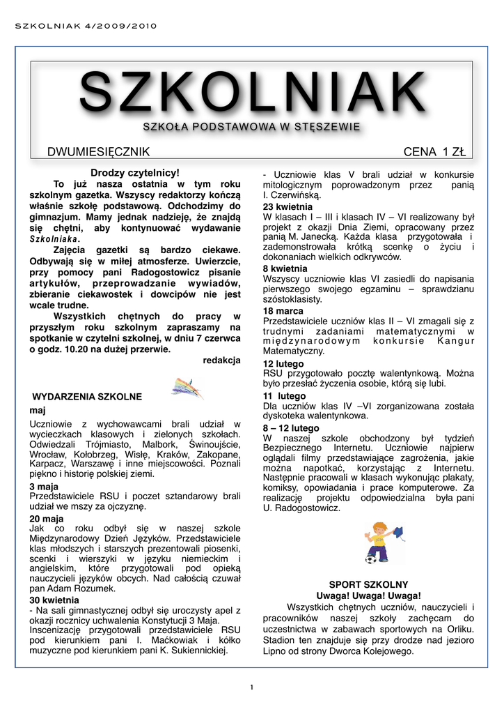 S Z K O L N I A K 4 / 2 0 0 9 / 2 0 1 0! SZKOL N IAK S ZKOŁ A POD STAWOWA W STĘSZEWIE DWUMIESIĘCZNIK CENA 1 ZŁ Drodzy czytelnicy! - Uczniowie klas V brali udział w konkursie mitologicznym poprowadzonym przez panią I. Czerwińską. 23 kwietnia W klasach I – III i klasach IV – VI realizowany był projekt z okazji Dnia Ziemi, opracowany przez panią M. Janecką. Każda klasa przygotowała i zademonstrowała krótką scenkę o życiu i dokonaniach wielkich odkrywców. 8 kwietnia Wszyscy uczniowie klas VI zasiedli do napisania pierwszego swojego egzaminu – sprawdzianu szóstoklasisty. 18 marca Przedstawiciele uczniów klas II – VI zmagali się z trudnymi zadaniami matematycznymi w międzynarodowym konkursie Kangur Matematyczny. 12 lutego RSU przygotowało pocztę walentynkową. Można było przesłać życzenia osobie, którą się lubi. 11 lutego Dla uczniów klas IV –VI zorganizowana została dyskoteka walentynkowa. 8 – 12 lutego W naszej szkole obchodzony był tydzień Bezpiecznego Internetu. Uczniowie najpierw oglądali filmy przedstawiające zagrożenia, jakie można napotkać, korzystając z Internetu. Następnie pracowali w klasach wykonując plakaty, komiksy, opowiadania i prace komputerowe. Za realizację projektu odpowiedzialna była pani U. Radogostowicz. To już nasza ostatnia w tym roku szkolnym gazetka. Wszyscy redaktorzy kończą właśnie szkołę podstawową. Odchodzimy do gimnazjum. Mamy jednak nadzieję, że znajdą się chętni, aby kontynuować wydawanie Szkolniaka. Zajęcia gazetki są bardzo ciekawe. Odbywają się w miłej atmosferze. Uwierzcie, przy pomocy pani Radogostowicz pisanie artykułów, przeprowadzanie wywiadów, zbieranie ciekawostek i dowcipów nie jest wcale trudne. Wszystkich chętnych do pracy w przyszłym roku szkolnym zapraszamy na spotkanie w czytelni szkolnej, w dniu 7 czerwca o godz. 10.20 na dużej przerwie. redakcja WYDARZENIA SZKOLNE maj Uczniowie z wychowawcami brali udział w wycieczkach klasowych i zielonych szkołach. Odwiedzali Trójmiasto, Malbork, Świnoujście, Wrocław, Kołobrzeg, Wisłę, Kraków, Zakopane, Karpacz, Warszawę i inne miejscowości. Poznali piękno i historię polskiej ziemi. 3 maja Przedstawiciele RSU i poczet sztandarowy brali udział we mszy za ojczyznę. 20 maja Jak co roku odbył się w naszej szkole Międzynarodowy Dzień Języków. Przedstawiciele klas młodszych i starszych prezentowali piosenki, scenki i wierszyki w języku niemieckim i angielskim, które przygotowali pod opieką nauczycieli języków obcych. Nad całością czuwał pan Adam Rozumek. 30 kwietnia - Na sali gimnastycznej odbył się uroczysty apel z okazji rocznicy uchwalenia Konstytucji 3 Maja. Inscenizację przygotowali przedstawiciele RSU pod kierunkiem pani I. Maćkowiak i kółko muzyczne pod kierunkiem pani K. Sukiennickiej. SPORT SZKOLNY Uwaga! Uwaga! Uwaga! Wszystkich chętnych uczniów, nauczycieli i pracowników naszej szkoły zachęcam do uczestnictwa w zabawach sportowych na Orliku. Stadion ten znajduje się przy drodze nad jezioro Lipno od strony Dworca Kolejowego. 1 S Z K O L N I A K 4 / 2 0 0 9 / 2 0 1 0! Więcej informacji znajdziesz na tablicy ogłoszeń w naszej szkole lub na stronie i n t e r n e t o w e j : http://www.steszew.pl/index.php?id=132&lan=pl Serdecznie zapraszam! Karolina Fajkowska III miejsce – Czekała Alan (kpt.), Adamek Krystian, Keller Aleksander, Majchrzak Szymon, Wyzuj Paweł, Bródka Lucjan. IV miejsce – Przybysz Szymon (kpt.), Miądowicz Mateusz, Mydlak Mateusz, Zeuschner Krzysztof, Sibrecht Bartosz, Gidaszewski Marek. V miejsce – Biskup Adam (kpt.), Ławniczak Jakub, Kaźmierowski Kamil, Alejski Dawid, Tomczak Gwidon, Wirth Marcin. VI miejsce – Wróbel Artur (kpt.), Grzelczak Kamil, Nowakowski Sebastian, Kęsicki Jonasz, Chraplak Adrian. VII miejsce – Skórnicki Filip (kpt.), Konieczny Jan, Ratajczak Dorian, Potrawiak Filip, Chróst Dawid, Kistowski Mikołaj. "Najlepszy Zawodnik Turnieju" – Waselczyk Marcin "Najlepszy Bramkarz Turnieju" – Dudziak Jakub *** 28. 04. 2010r. Komorniki – Wiosenny Towarzyski Turniej Koszykówki Chłopców /opiekun J. Mydlak/ I miejsce –UKS Dwójka Stęszew II miejsce – GKS Tarnovia Tarnowo Podgórne III miejsce – Pro Basket Komorniki Szkołę reprezentowali: Misztal Marek (kpt.), Woźniak Mateusz, Keller Aleksander, Szyfter Jakub, Turbański Krzysztof, Nowak Szymon, Kowalski Mateusz, Nowakowski Sebastian, Idowiak Wojciech, Kośmider Patryk, Kmiecik Norbert, Wyzuj Paweł. 26. 04. 2010r. Opalenica – Finał Rejonu Poznań Zachód w Koszykówce Chłopców /opiekun J. Mydlak/ 21. 04. 2010r. Grodzisk Wielkopolski – Finał Rejonu Poznań Zachód w Koszykówce Dziewcząt /opiekun M. Cieniawa/ IV miejsce –SP Stęszew Szkołę reprezentowali: Madaj Patryk (kpt.), Waselczyk Marcin, Minkisiewicz Łukasz, Konieczny Jan, Drożdżyński Bartosz, Wałęsa Kamil, Alejski Dawid, Kaźmierowski Kamil, Woźniak Mateusz, Ławniczak Jakub. III miejsce –SP Stęszew Szkołę reprezentowały: Miecznik Wiktoria, Kalemba Małgorzata, Jankowiak Zuzanna, Fajkowska Karolina, Olejniczak Michalina, Marciniak Lena, Sikora Weronika, Piasta Natalia, Maćkowiak Kinga, Kawka Lidia, Konieczna Aleksandra, Michalak Adrianna. 23. 04. 2010r. Stęszew – Gminny Turniej Piłkarski „Wielkopolski Orlik Cup 2010” /opiekun J. Mydlak/ 15. 04. 2010r. Stęszew – Eliminacje Szkolne w Czwórboju Lekkoatletycznym Chłopców /opiekun J. Mydlak/ I miejsce – SP Jeziorki II miejsce – SP Stęszew III miejsce – SP Modrze Szkołę reprezentowali: Waselczyk Marcin (kpt.), Dudziak Jakub (bramkarz), Miądowicz Mateusz (bramkarz), Madaj Patryk, Weigelt Dawid, Łakota Filip, Wojtkowiak Damian, Drożdżyński Bartosz, Czekała Alan, Szyfter Jakub, Bramki dla drużyny zdobyli – Weigelt Dawid (4), Madaj Patryk (3), Waselczyk Marcin (2+1k), Wojtkowiak Damian (2) Wyniki najlepszych I miejsce – Waselczyk Marcin II miejsce – Dudziak Jakub III miejsce – Wałęsa Kamil IV miejsce – Cz