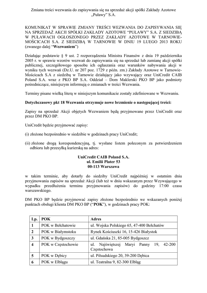 Zmiana treści wezwania do zapisywania się na sprzedaż akcji spółki Zakłady Azotowe „Puławy” S.A. KOMUNIKAT W SPRAWIE ZMIANY TREŚCI WEZWANIA DO ZAPISYWANIA SIĘ NA SPRZEDAŻ AKCJI SPÓŁKI ZAKŁADY AZOTOWE “PUŁAWY” S.A. Z SIEDZIBĄ W PUŁAWACH OGŁOSZONEGO PRZEZ ZAKŁADY AZOTOWE W TARNOWIEMOŚCICACH S.A. Z SIEDZIBĄ W TARNOWIE W DNIU 19 LUEGO 2013 ROKU (zwanego dalej “Wezwaniem”) Działając podstawie § 9 ust. 2 rozporządzenia Ministra Finansów z dnia 19 października 2005 r. w sprawie wzorów wezwań do zapisywania się na sprzedaż lub zamianę akcji spółki publicznej, szczegółowego sposobu ich ogłaszania oraz warunków nabywania akcji w wyniku tych wezwań (Dz.U. nr 207 poz. 1729 z późn. zm.) Zakłady Azotowe w TarnowieMościcach S.A z siedzibą w Tarnowie działający jako wzywający oraz UniCredit CAIB Poland S.A. wraz z PKO BP S.A. Oddział – Dom Maklerski PKO BP jako podmioty pośredniczące, niniejszym informują o zmianach w treści Wezwania. Terminy pisane wielką literą w niniejszym komunikacie zostały zdefiniowane w Wezwaniu. Dotychczasowy pkt 18 Wezwania otrzymuje nowe brzmienie o następującej treści: Zapisy na sprzedaż Akcji objętych Wezwaniem będą przyjmowane przez UniCredit oraz przez DM PKO BP. UniCredit będzie przyjmować zapisy: (i) złożone bezpośrednio w siedzibie w godzinach pracy UniCredit; (ii) złożone drogą korespondencyjną, tj. wysłane listem poleconym za potwierdzeniem odbioru lub przesyłką kurierską na adres: UniCredit CAIB Poland S.A. ul. Emilii Plater 53 00-113 Warszawa w takim terminie, aby dotarły do siedziby UniCredit najpóźniej w ostatnim dniu przyjmowania zapisów na sprzedaż Akcji (lub też w dniu wskazanym przez Wzywającego w wypadku przedłużenia terminu przyjmowania zapisów) do godziny 17:00 czasu warszawskiego. DM PKO BP będzie przyjmować zapisy złożone bezpośrednio we wskazanych poniżej punktach obsługi klienta DM PKO BP (“POK”), w godzinach pracy POK: Lp. POK POK w Bełchatowie 1 Adres ul. Wojska Polskiego 65, 47-400 Bełchatów 2 POK w Białymstoku Rynek Kościuszki 16, 15-426 Białystok 3 POK w Bydgoszczy ul. Gdańska 21, 85-005 Bydgoszcz 4 POK w Częstochowie ul. Najświętszej Częstochowa 5 POK w Dębicy ul. Piłsudskiego 20, 39-200 Dębica 6 POK w Elblągu ul. Teatralna 9, 82-300 Elbląg Maryi Panny 19, 42-200 7 POK w Gdańsku ul. Okopowa 3, 80-958 Gdańsk 8 POK w Gdyni ul. Wójta Radtkego 53, 81-354 Gdynia 9 POK w Jeleniej Górze ul. Bankowa 19, 58-500 Jelenia Góra 10 POK w Katowicach ul. Warszawska 7, 40-009 Katowice 11 POK w Koszalinie ul. Jana Pawła II 23/25, 75-841 Koszalin 12 POK w Krakowie (I) ul. Wielopole 19-21, 30-942 Kraków 13 POK w Krakowie (II) os. Centrum-E 13, 31-934 Kraków 14 POK w Krośnie ul. Bieszczadzka 3, 38-400 Krosno 15 POK w Legnicy pl. Klasztorny 1, 59-220 Legnica 16 POK w Lublinie ul. Krakowskie Przedmieście 14, 20-002 Lublin 17 POK w Łodzi al. Piłsudskiego 153, 92-332 Łódź 18 POK w Olsztynie ul. Dąbrowszczaków 30, 10-541 Olsztyn 19 POK w Opolu ul. Reymonta 39, 45-072 Opole 20 POK w Płocku ul. Tumska 20c, 09-400 Płock 21 POK w Poznaniu pl. Wolności 3, 60-914 Poznań 22 POK w Puławach ul. Partyzantów 3, 24-100 Puławy 23 POK w Raciborzu (I) ul. Piłsudskiego 31, 44-335 Jastrzębie-Zdrój 24 POK w Raciborzu (II) ul. Pracy 21, 47-400 Racibórz 25 POK w Rzeszowie ul. 3-go Maja 23, 35-959 Rzeszów 26 POK w Słupsku ul. Wazów 5, 76-200 Słupsk 27 POK w Sosnowcu ul. Kilińskiego 20, 41-200 Sosnowiec 28 POK w Suwałkach ul. Noniewicza 89, 16-400 Suwałki 29 POK w Szczecinie al. Niepodległości 40, 70-404 Szczecin 30 POK w Toruniu ul. Szeroka 14/16, 87-100 Toruń 31 POK w Wałbrzychu Rynek 23, 58-300 Wałbrzych 32 POK w Warszawie (II) ul. Sienkiewicza 12/14, 00-010 Warszawa 33 POK w Warszawie (I) ul. Puławska 15, 02-515 Warszawa 34 POK we Wrocławiu Rynek 33, 50-102 Wrocław 35 POK w Zielonej Górze ul. Żeromskiego 2, 65-066 Zielona Góra 2 PODPISY OSÓB DZIAŁAJĄCYCH W IMIENIU Zakładów Azotowych w TarnowieMościcach S.A: Podpis: ________________________ Imię i nazwisko: Stanowisko: Podpis: ________________________ Imię i nazwisko: Stanowisko: PODPISY OSÓB DZIAŁAJĄCYCH W IMIENIU UniCredit CAIB Poland S.A: Podpis: ________________________ Imię i nazwisko: Stanowisko: Podpis: ________________________ Imię i nazwisko: Stanowisko: PODPISY OSÓB DZIAŁAJĄCYCH W IMIENIU Powszechna Kasa Oszczędności Bank Polski Spółka Akcyjna Oddział – Dom Maklerski PKO Banku Polskiego S.A w Warszawie: Podpis: ________________________ Imię i nazwisko: Stanowisko: Podpis: ________________________ Imię i nazwisko: Stanowisko: 3