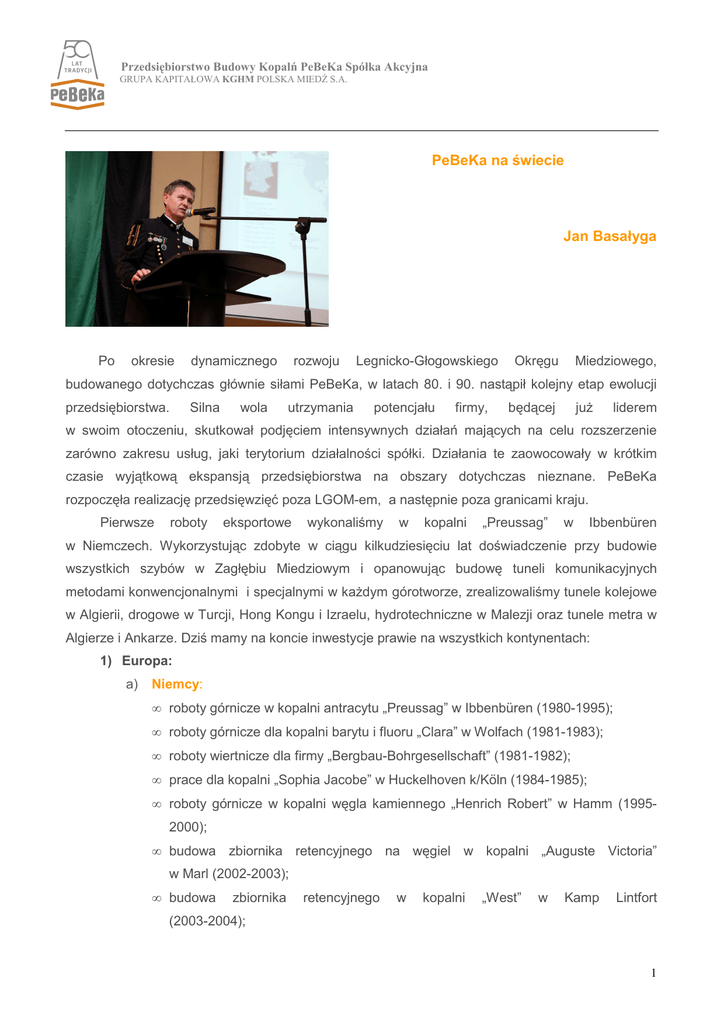 Przedsiębiorstwo Budowy Kopalń PeBeKa Spółka Akcyjna GRUPA KAPITAŁOWA KGHM POLSKA MIEDŹ S.A. PeBeKa na świecie Jan Basałyga Po okresie dynamicznego rozwoju Legnicko-Głogowskiego Okręgu Miedziowego, budowanego dotychczas głównie siłami PeBeKa, w latach 80. i 90. nastąpił kolejny etap ewolucji przedsiębiorstwa. Silna wola utrzymania potencjału firmy, będącej juŜ liderem w swoim otoczeniu, skutkował podjęciem intensywnych działań mających na celu rozszerzenie zarówno zakresu usług, jaki terytorium działalności spółki. Działania te zaowocowały w krótkim czasie wyjątkową ekspansją przedsiębiorstwa na obszary dotychczas nieznane. PeBeKa rozpoczęła realizację przedsięwzięć poza LGOM-em, a następnie poza granicami kraju. Pierwsze roboty eksportowe wykonaliśmy w kopalni „Preussag” w Ibbenbüren w Niemczech. Wykorzystując zdobyte w ciągu kilkudziesięciu lat doświadczenie przy budowie wszystkich szybów w Zagłębiu Miedziowym i opanowując budowę tuneli komunikacyjnych metodami konwencjonalnymi i specjalnymi w kaŜdym górotworze, zrealizowaliśmy tunele kolejowe w Algierii, drogowe w Turcji, Hong Kongu i Izraelu, hydrotechniczne w Malezji oraz tunele metra w Algierze i Ankarze. Dziś mamy na koncie inwestycje prawie na wszystkich kontynentach: 1) Europa: a) Niemcy: • roboty górnicze w kopalni antracytu „Preussag” w Ibbenbüren (1980-1995); • roboty górnicze dla kopalni barytu i fluoru „Clara” w Wolfach (1981-1983); • roboty wiertnicze dla firmy „Bergbau-Bohrgesellschaft” (1981-1982); • prace dla kopalni „Sophia Jacobe” w Huckelhoven k/Köln (1984-1985); • roboty górnicze w kopalni węgla kamiennego „Henrich Robert” w Hamm (19952000); • budowa zbiornika retencyjnego na węgiel w kopalni „Auguste Victoria” w Marl (2002-2003); • budowa zbiornika retencyjnego w kopalni „West” w Kamp Lintfort (2003-2004); 1 Przedsiębiorstwo Budowy Kopalń PeBeKa Spółka Akcyjna GRUPA KAPITAŁOWA KGHM POLSKA MIEDŹ S.A. • roboty chodnikowe dla kopalni „Ensdorf” w Zagłębiu Saary (2003-2004); • roboty górnicze dla kopalni „Auguste Victoria” (2004-2009); • roboty chodnikowe dla kopalni „Walsum” w Duisburgu (2005-2006); b) Jugosławia: • pomiary i ekspertyzy techniczne stanu ekranu lodowego dla elektrowni wodnej w Cakowcu (1979); c) Węgry: • roboty górnicze dla kopalni węgla kamiennego „Lencsehegyi Szenbanya” w Dorog (1986-1994); • roboty chodnikowe w kopalni „Markushegy” w Oroszlanach (1994); d) Włochy: • roboty przygotowawcze i eksploatacyjne w kopalni miedzi „Torrente Otro” w Riva Valdobia (1981); e) Turcja: • budowa czterech tuneli drogowych na peryferiach Izmitu (1988-1991); • budowa tuneli szlakowych szybkiej kolei podziemnej „Ankaray” w Ankarze (19921995); 2) Afryka - Algieria: • budowa tuneli kolejowych na trasie Jijel-Romandane (1984-1988); • tunele szlakowe metra w Algierze (1988-1993); 3) Azja: a) Iran: • budowa, dostawa i montaŜ urządzeń wydobywczych dla kopalni „Nakhlak” (19811987); b) Izrael: • budowa tunelu drogowego Har Gilo w Jerozolimie (1993-1995); c) Hongkong: • budowa dwóch tuneli drogowych na wyspie Tsing Yi (1993-1995); d) Malezja: • budowa tunelu zrzutowego wody dla zbiornika Sungai Kelinchi w Negali Sembilan (1996); • budowa tunelu hydrotechnicznego i wyrobiska transportowego dla cementowni Perak Han Joog (1997-1998); 2 Przedsiębiorstwo Budowy Kopalń PeBeKa Spółka Akcyjna GRUPA KAPITAŁOWA KGHM POLSKA MIEDŹ S.A. e) Filipiny: • budowa szybu Bus Bar dla hydroelektrowni Casecnan (1998); 4) Ameryka Południowa - Chile: • budowa szybiku dla kopalni wapienia „Pehuenche” (1989-1990); 5) Ameryka Środkowa - Honduras: • budowa dla hydroelektrowni „El Cajon” szybu wentylacyjnego i dwóch sztolni ciśnieniowych (1981-1982); KaŜdy kontrakt posiadał odmienną specyfikę, stawiał inne wyzwania, zmuszał do przystosowania się do zwyczajów i obyczajów lokalnej społeczności, a takŜe poszanowania kultury, jakŜe innej od naszej - europejskiej. Roboty eksportowe stworzyły dla przedsiębiorstwa doskonałą okazję do zdobycia nowych doświadczeń i umiejętności. Zakończenie ich z sukcesem jest kolejnym dowodem na to, jak PeBeKa bardzo szybko potrafi dostosować się do całkowicie nowych, dotychczas nieznanych technologii i sprzętu. Zdolna do podjęcia najbardziej skomplikowanych robót załoga, przyczyniła się do wzrostu prestiŜu spółki na rynkach światowych. 3