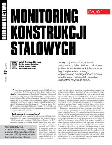 BUDOWNICTWO MONITORING KONSTRUKCJI STALOWYCH dr inż. Stanisław Wierzbicki Builder 92 lipiec 2016 Instytut Inżynierii Budowlanej, Wydział Inżynierii Lądowej, Politechnika Warszawska Z badań przeprowadzonych w ramach projektu MONIT „Monitorowanie Stanu Technicznego Konstrukcji i Ocena jej Żywotności” [M1] realizowanego przez Politechnikę Warszawską w kooperacji z kilkoma innymi jednostkami naukowo-badawczymi wynika, że przyczyny awarii i katastrof budynków rozkładają się praktycznie równomiernie na wszystkie trzy ww. etapy, a więc projektowania, realizacji i eksploatacji obiektu – rys. 1. Wykres został sporządzony na podstawie oficjalnych danych dotyczących katastrof budowlanych w Polsce, w latach 19952010, udostępnionych przez Inspektoraty Nadzoru Budowlanego oraz z uwzględnieniem analogicznych informacji zaczerpniętych z materiałów własnych i innych źródeł [5, 7, 18]. Gdzie poprawić bezpieczeństwo? Z przytoczonych wyżej badań wynika też, że większość katastrof miała miejsce w budynkach o konstrukcji stalowej lub mieszanej stalowo-żelbetowej, ze stalowymi dachami i żelbetowymi słupami – rys. 2. Potwierdzenie powyższych wniosków stanowią również obserwacje najbardziej znanych katastrof – większość z nich dotyczyOprócz podstawowej ła konstrukcji stalowych. roli systemów monitoringu, jaką jest Wnioski takie nie są oczypoprawa bezpieczeństwa, mogą wiście niczym zaskakującym, jeżeli weźmie się pod one przyczynić się do ograniczenia uwagę, że budynki o stakosztów eksploatacji obiektu. lowych konstrukcjach no- Część 1 Jedną z najbardziej istotnych kwestii związanych z każdym obiektem budowlanym jest bezpieczeństwo konstrukcji. Zapewnienie tego bezpieczeństwa wymaga odpowiedniego przebiegu zarówno procesu projektowania i realizacji, jak i późniejszej eksploatacji powstałego obiektu. śnych charakteryzują się stosunkowo niewielkim udziałem ciężaru własnego w całości obciążeń granicznych. W przypadku typowych budynków o konstrukcji żelbetowej ich ciężar własny jest na tyle duży, że przyrost obciążeń spowodowany oddziaływaniami zmiennymi, szczególnie klimatycznymi, nie skutkuje zbyt dużymi zmianami sił wewnętrznych. Oznacza to, że jeżeli konstrukcja jest na tyle poprawnie zaprojektowana i wykonana, że jest w stanie bezpiecznie przenosić obciążenia stałe, to zagrożenie bezpieczeństwa w wyniku relatywnie niezbyt dużego przyrostu obciążeń pochodzących od oddziaływań zmiennych jest niewielkie. Zgoła inaczej przedstawia się sytuacja budynków o konstrukcjach stalowych, w których ze względu na niewielki ciężar konstrukcji i obudowy udział oddziaływań zmiennych w całości obciążeń jest znaczny, często większy niż 50%, a sytuacja ta jest potęgowana powszechną tendencją do stosowania coraz bardziej ekonomicznych i lekkich rozwiązań konstrukcyjnych. Jeżeli weźmie się pod uwagę losowość występowania oddziaływań zmiennych, w szczególności klimatycznych, oznacza to, że nawet obarczona wadami konstrukcja może przez wiele lat bezpiecznie pracować, nienarażona na maksymalne obciążenia zmienne, i dopiero wystąpienie ekstremalnych wartości tych oddziaływań objawi się awarią lub katastrofą. Równocześnie pojawia się kwestia zmian klimatycznych i coraz częściej występujących anomalii zjawisk pogodowych, która, nałożona na wspomniane wyżej podejście do projektowania, sprawia, że realne staje się przeciążenie konstrukcji i zagrożenie dla jej bezpieczeństwa, a co za tym idzie, także dla bezpieczeństwa przebywających w obiekcie osób i znajdującego się tam mienia. Z powyższych rozważań wynika, że celowe jest poszukiwanie i stosowanie metod i środków mogących przyczynić się do poprawy bezpieczeństwa konstrukcji. Monitoring konstrukcji Rys. 1. Podział przyczyn awarii i katastrof Jedynie wspomaganie Omawiając zagadnienia monitoringu, należy jednak pamiętać, że funkcjonujący w obiekcie system monitoringu technicznego nie powinien być traktowany jako pełna gwarancja bezpieczeństwa konstrukcji i nie może prowadzić do zaniedbań w innych obszarach dbałości o konstrukcję – zdanie się wyłącznie na informacje uzyskiwane z takiego systemu lub nieumiejętna ich interpretacja mogłyby być dla konstrukcji bardziej niebezpieczne niż brak takiego systemu. W literaturze można znaleźć także sceptyczne oceny przydatności systemów monitoringu konstrukcji określanych jako „monitoring bezpieczeństwa konstrukcji budowlanych” [9, 10], które są argumentowane np. brakiem realnych możliwości monitoringu niektórych wielkości i zjawisk, takich jak naprężenia w spoinach, wyboczenie, połączenia warstw ścian murowanych, stopień destrukcji zbrojenia i betonu itp. Należy zaznaczyć, że chociaż teoretycznie jest możliwe monitorowanie bardzo wielu różnych wielkości i zjawisk, to ze względu na uwarunkowania techniczne i koszty, stosowane w praktyce typowe systemy są ograniczane do pomiaru podstawowych wielkości, a co za tym idzie, powinny być określane raczej jako „systemy monitorin- 93 Znaczenie zagadnień monitoringu konstrukcji podkreśla fakt wprowadzenia w 2009 r. do „Warunków technicznych, jakim powinny odpowiadać budynki…” (Dz.U. z 2009 r. Nr 56 poz. 461, §204, ust. 7) [N2] wymagania stałego monitorowania parametrów istotnych dla bezpieczeństwa konstrukcji (przemieszczenia, odkształcenia, naprężenia) w obiektach użyteczności publicznej, takich jak: hale widowiskowe, sportowe, dworcowe, wystawowe, obiekty handlowe. Rozporządzenie to nie odnosi się do najczęściej występujących budynków o konstrukcji stalowej, takich jak np. hale magazynowe, magazynowo-spedycyjne i przemysłowe, jeśli jednak wziąć pod uwagę możliwe korzyści wynikające z monitorowania zachowania się konstrukcji – poprawa jej bezpieczeństwa i optymalizacja procesu utrzymania obiektu w okresie