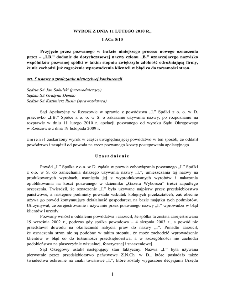 WYROK Z DNIA 11 LUTEGO 2010 R., I ACa 5/10 Przyjęcie przez pozwanego w trakcie niniejszego procesu nowego oznaczenia przez – „I.B.” dodanie do dotychczasowej nazwy członu „B.” oznaczającego nazwisko wspólników pozwanej spółki w takim stopniu zwiększyło zdolność odróżniającą firmy, że nie zachodzi już zagrożenie wprowadzenia klienteli w błąd co do tożsamości stron. art. 5 ustawy o zwalczaniu nieuczciwej konkurencji Sędzia SA Jan Sokulski (przewodniczący) Sędzia SA Grażyna Demko Sędzia SA Kazimierz Rusin (sprawozdawca) Sąd Apelacyjny w Rzeszowie w sprawie z powództwa „I.” Spółki z o. o. w D. przeciwko „I.B.” Spółce z o. o. w S. o zakazanie używania nazwy, po rozpoznaniu na rozprawie w dniu 11 lutego 2010 r. apelacji pozwanego od wyroku Sądu Okręgowego w Rzeszowie z dnia 19 listopada 2009 r. z m i e n i ł zaskarżony wyrok w części uwzględniającej powództwo w ten sposób, że oddalił powództwo i zasądził od powoda na rzecz pozwanego koszty postępowania apelacyjnego. U za sa dnienie Powód „I.” Spółka z o.o. w D. żądała w pozwie zobowiązania pozwanego „I.” Spółki z o.o. w S. do zaniechania dalszego używania nazwy „I.”, umieszczania tej nazwy na produkowanych wyrobach, usunięcia jej z wyprodukowanych wyrobów i nakazania opublikowania na koszt pozwanego w dzienniku „Gazeta Wyborcza” treści zapadłego orzeczenia. Twierdził, że oznaczenie „I.” było używane najpierw przez przedsiębiorstwo państwowe, a następnie podmioty powstałe wskutek kolejnych przekształceń, zaś obecnie używa go powód kontynuujący działalność gospodarczą na bazie majątku tych podmiotów. Utrzymywał, że zarejestrowanie i używanie przez pozwanego nazwy „I.” wprowadza w błąd klientów i urzędy. Pozwany wniósł o oddalenie powództwa i zarzucił, że spółka ta została zarejestrowana 19 września 2002 r., podczas gdy spółka powodowa – 4 sierpnia 2003 r., a powód nie przedstawił dowodu na okoliczność nabycia praw do nazwy „I”. Ponadto zarzucił, że oznaczenia stron nie są podobne w takim stopniu, że może zachodzić wprowadzenie klientów w błąd co do tożsamości przedsiębiorstwa, a w szczególności nie zachodzi podobieństwo na płaszczyźnie wizualnej, fonetycznej i znaczeniowej. Sąd Okręgowy ustalił następujący stan faktyczny. Nazwa „I.” była używana pierwotnie przez przedsiębiorstwo państwowe Z.N.Ch. w D., które posiadało także świadectwa ochronne na znaki towarowe „I.”, które zostały wygaszone decyzjami Urzędu 1 Patentowego RP z 2003 r. i 2008 r. Po komercjalizacji w 1999 r. powstała Spółka Akcyjna Z.N.Ch. „I.”, a jej upadłość ogłoszona została 17 lipca 2002 r. W dniu 19 września 2002 r. została zarejestrowana pozwana Spółka z o.o. Cały majątek Z.N.Ch. „I.” S.A. stanowiący przedsiębiorstwo w rozumieniu art. 551 k.c. został w dniu 1 sierpnia 2003 r. sprzedany przez syndyka masy upadłości Spółce Akcyjnej „P.” w Ł. Ta ostatnia spółka jest jedynym udziałowcem powodowej spółki zarejestrowanej w dniu 4 sierpnia 2003 r. Obie strony mają w zakresie prowadzonej działalności produkcję pojazdów mechanicznych do przewozu towarów, pojazdów do celów specjalnych, nadwozi, przyczep i naczep, urządzeń chłodniczych i wentylacyjnych. Powód przedstawił dowody na okoliczność wprowadzania klientów w błąd w związku z takim samym brzmieniem nazw stron w postaci koperty listu otrzymanego z Urzędu Statystycznego w Rzeszowie zaadresowanego do pozwanego i notatkę służbową z rozmowy z klientem pozwanego, który zgłaszał u powoda reklamację usługi wykonanej przez pozwanego. W ocenie Sądu Okręgowego powód, działający wcześniej w innych formach organizacyjnych, używał nazwy „I.” co najmniej od lat 1990 – tych, a zatem czynił to przed rozpoczęciem używania przez pozwanego nazwy „I.”, natomiast wykazane zostało, że używanie przez pozwanego tego oznaczenia może być mylące i wprowadzające w błąd klientów obu firm, tym bardziej, że działają na tym samym terenie i mają jednakowy zakres działalności. Oceny tej nie zmienia, według tego Sądu, także fakt, iż w trakcie procesu pozwany zmienił nazwę na „I.B.”, a skoro oznaczenie to może doprowadzić do przejęcia części klientów powoda i tym samym narusza jego interesy, to zachodzą warunki udzielenia powodowi ochrony prawnej przewidzianej w art. 5 ustawy z dnia 16 kwietnia z 1993 r., o zwalczaniu nieuczciwej konkurencji (Dz. U. z 2003 r., Nr 153, poz. 1503 ze zm.). Zaskarżonym wyrokiem Sąd Okręgowy nakazał pozwanemu zaniechanie posługiwania się w prowadzonej działalności członem nazwy „I.” i umieszczania tej nazwy na produkowanych wyrobach, oddalając powództwo w pozostałej części i obciążając pozwanego kosztami procesu. Pozwany zaskarżył wyrok w części uwzględniającej powództwo i obciążającej go kosztami postępowania, zarzucając przede wszystkim naruszenie prawa materialnego przez błędną wykładnię i niewłaściwe zastosowanie art. od 431 do 4310 k.c. oraz art. 551 i 552 k.c., a także art. 3 i 5 w/w ustawy oraz sprzeczność istotnych ustaleń sądu z treścią zebranego w sprawie materiału polegające na przyjęciu, że powodowa spółka powstała w wyniku przekształcenia Z.N.Ch. „I.” S.A. w upadłości w D., ma prawo do nazwy „I.”, gdyż jedynym wspólnikiem jest „P.” S.A. w Ł. – nabywca Z.N.Ch. „I.” S.A. i prawo to nabył w wyniku nabycia wniesionego aportem przedsiębiorstwa w rozumieniu art. 55 1 k.c. to jest łącznie z oznaczeniem indywidualizującym przedsiębiorstwo i na skutek tego powód jest uprawniony do praw wyłącznych do nazwy „I.”, a w konsekwencji posiada wcześniejsze od pozwanego prawo do używania oznaczenia oraz, że oznaczenia „I.” i „I.B.” są podobne w takim stopniu do oznaczenia „I.”, że nie może to wprowadzić klientów w błąd c