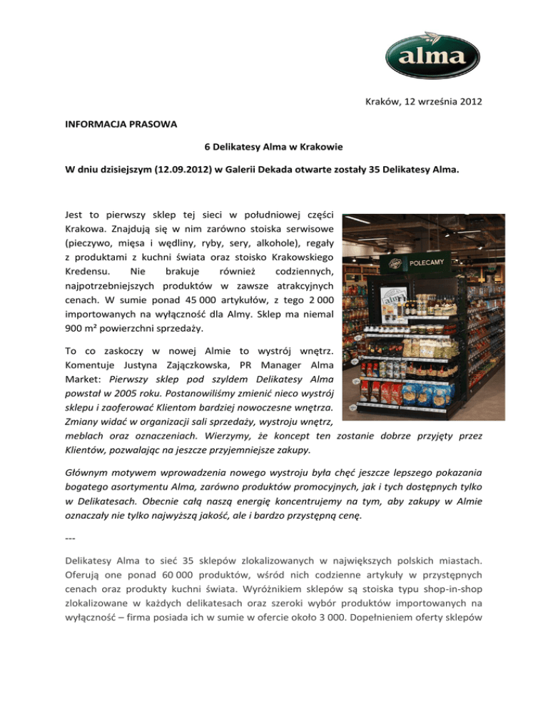 Kraków, 12 września 2012 INFORMACJA PRASOWA 6 Delikatesy Alma w Krakowie W dniu dzisiejszym (12.09.2012) w Galerii Dekada otwarte zostały 35 Delikatesy Alma. Jest to pierwszy sklep tej sieci w południowej części Krakowa. Znajdują się w nim zarówno stoiska serwisowe (pieczywo, mięsa i wędliny, ryby, sery, alkohole), regały z produktami z kuchni świata oraz stoisko Krakowskiego Kredensu. Nie brakuje również codziennych, najpotrzebniejszych produktów w zawsze atrakcyjnych cenach. W sumie ponad 45 000 artykułów, z tego 2 000 importowanych na wyłączność dla Almy. Sklep ma niemal 900 m² powierzchni sprzedaży. To co zaskoczy w nowej Almie to wystrój wnętrz. Komentuje Justyna Zajączkowska, PR Manager Alma Market: Pierwszy sklep pod szyldem Delikatesy Alma powstał w 2005 roku. Postanowiliśmy zmienić nieco wystrój sklepu i zaoferować Klientom bardziej nowoczesne wnętrza. Zmiany widać w organizacji sali sprzedaży, wystroju wnętrz, meblach oraz oznaczeniach. Wierzymy, że koncept ten zostanie dobrze przyjęty przez Klientów, pozwalając na jeszcze przyjemniejsze zakupy. Głównym motywem wprowadzenia nowego wystroju była chęć jeszcze lepszego pokazania bogatego asortymentu Alma, zarówno produktów promocyjnych, jak i tych dostępnych tylko w Delikatesach. Obecnie całą naszą energię koncentrujemy na tym, aby zakupy w Almie oznaczały nie tylko najwyższą jakość, ale i bardzo przystępną cenę. --Delikatesy Alma to sieć 35 sklepów zlokalizowanych w największych polskich miastach. Oferują one ponad 60 000 produktów, wśród nich codzienne artykuły w przystępnych cenach oraz produkty kuchni świata. Wyróżnikiem sklepów są stoiska typu shop-in-shop zlokalizowane w każdych delikatesach oraz szeroki wybór produktów importowanych na wyłączność – firma posiada ich w sumie w ofercie około 3 000. Dopełnieniem oferty sklepów stacjonarnych jest sklep internetowy alma24.pl, który operuje już na terenie 13 polskich miast. Kontakt dla mediów: Justyna Zajączkowska PR Manager Tel. 12 62 76 121, kom. 602 499 099 Mail: [email protected]