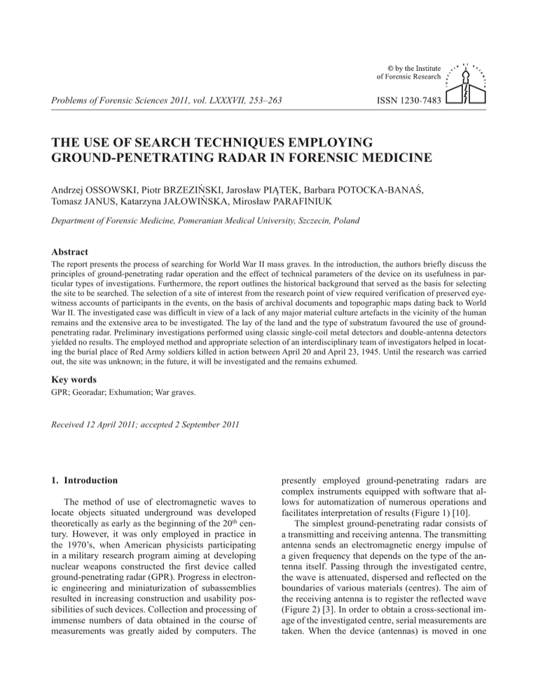 Problems of Forensic Sciences 2011, vol. LXXXVII, 253–263 The use of search techniques employing ground-penetrating radar in forensic medicine Andrzej Ossowski, Piotr Brzeziński, Jarosław Piątek, Barbara Potocka-Banaś, Tomasz Janus, Katarzyna Jałowińska, Mirosław Parafiniuk Department of Forensic Medicine, Pomeranian Medical University, Szczecin, Poland Abstract The report presents the process of searching for World War II mass graves. In the introduction, the authors briefly discuss the principles of ground-penetrating radar operation and the effect of technical parameters of the device on its usefulness in particular types of investigations. Furthermore, the report outlines the historical background that served as the basis for selecting the site to be searched. The selection of a site of interest from the research point of view required verification of preserved eyewitness accounts of participants in the events, on the basis of archival documents and topographic maps dating back to World War II. The investigated case was difficult in view of a lack of any major material culture artefacts in the vicinity of the human remains and the extensive area to be investigated. The lay of the land and the type of substratum favoured the use of groundpenetrating radar. Preliminary investigations performed using classic single-coil metal detectors and double-antenna detectors yielded no results. The employed method and appropriate selection of an interdisciplinary team of investigators helped in locating the burial place of Red Army soldiers killed in action between April 20 and April 23, 1945. Until the research was carried out, the site was unknown; in the future, it will be investigated and the remains exhumed. Key words GPR; Georadar; Exhumation; War graves. Received 12 April 2011; accepted 2 September 2011 1. Introduction The method of use of electromagnetic waves to locate objects situated underground was developed theoretically as early as the beginning of the 20th century. However, it was only employed in practice in the 1970’s, when American physicists participating in a military research program aiming at developing nuclear weapons constructed the first device called ground-penetrating radar (GPR). Progress in electronic engineering and miniaturization of subassemblies resulted in increasing construction and usability possibilities of such devices. Collection and processing of immense numbers of data obtained in the course of measurements was greatly aided by computers. The presently employed ground-penetrating radars are complex instruments equipped with software that allows for automatization of numerous operations and facilitates interpretation of results (Figure 1) [10]. The simplest ground-penetrating radar consists of a transmitting and receiving antenna. The transmitting antenna sends an electromagnetic energy impulse of a given frequency that depends on the type of the antenna itself. Passing through the investigated centre, the wave is attenuated, dispersed and reflected on the boundaries of various materials (centres). The aim of the receiving antenna is to register the reflected wave (Figure 2) [3]. In order to obtain a cross-sectional image of the investigated centre, serial measurements are taken. When the device (antennas) is moved in one 254 A. Ossowski, P. Brzeziński, J. Piątek, B. Potocka-Banaś, T. Janus, K. Jałowińska, M. Parafiniuk Fig. 1. GPRS SIR-3000 (GSSI, USA) employed during excavation works in Rzepczyno, north-western Poland. direction, an image is generated that is termed “georadar profile” [7]. The contrast on the registered image depends on the relative difference between dielectric constants of neighbouring centres (Figure 3). The dielectric constant, sometimes referred to as “dielectric permittivity” (relative) describes dielectric bodies in an electric field and may be briefly characterized as the ratio of the permittivity of a given body to the vacuum permittivity (the value approximates to 1) [8]. Dielectric constants determined for searches for ground burial sites are within the range of 4 (dry sand) to as much as more than 20 (moist soil) [7]. Fig. 2. A simplified scheme of GPR [2]. At present, investigators use antennas with frequencies ranging from 10 MHz to several GHz. The use of a given type of antenna depends mostly on the object that is sought and its physical properties. It may be assumed, however, that the higher the antenna frequency is, the smaller objects can be detected; nevertheless in such a case, the wave is markedly attenuated and the measurement range decreases. 1000 MHz and higher frequency antennas are employed in investigations of underground installations situated at shallow depths or of steel reinforcement in concrete constructions. On the other hand, low-frequency antennas are employed in geology [7]. For the purpose of archaeological and forensic investigations, devices are employed equipped with antennas with frequencies ranging from 100 to 800 MHz. In practice, the range of measurements and their precision depend on numerous factors, such as the dielectric constant, conductance, humidity or porosity of a given centre. Searching for graves or field burial sites constitutes one of the most difficult challenges when working with georadar. As a rule, there is no strong contrast between centres (differences of relative dielectric permittivity values); moreover, obtaining satisfactory results requires preparation of a grid with density of no less than 0.5 m and collecting georadar profiles of the investigated area in two planes; subsequently, data are processed using specialist software, which generates a three dimensional image. Based on the experiment of the present authors, only such an image can be evaluated and appropriately interpreted. Whereas when searching for underground installations, tanks or foundations, satisfactory results may be achieved even when only single profiles are available, when attem