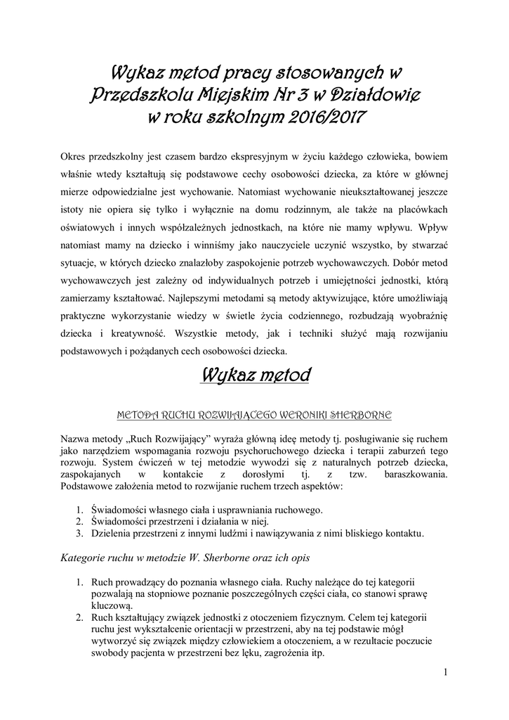 Wykaz metod pracy stosowanych w Przedszkolu Miejskim Nr 3 w Działdowie w roku szkolnym 2016/2017 Okres przedszkolny jest czasem bardzo ekspresyjnym w życiu każdego człowieka, bowiem właśnie wtedy kształtują się podstawowe cechy osobowości dziecka, za które w głównej mierze odpowiedzialne jest wychowanie. Natomiast wychowanie nieukształtowanej jeszcze istoty nie opiera się tylko i wyłącznie na domu rodzinnym, ale także na placówkach oświatowych i innych współzależnych jednostkach, na które nie mamy wpływu. Wpływ natomiast mamy na dziecko i winniśmy jako nauczyciele uczynić wszystko, by stwarzać sytuacje, w których dziecko znalazłoby zaspokojenie potrzeb wychowawczych. Dobór metod wychowawczych jest zależny od indywidualnych potrzeb i umiejętności jednostki, którą zamierzamy kształtować. Najlepszymi metodami są metody aktywizujące, które umożliwiają praktyczne wykorzystanie wiedzy w świetle życia codziennego, rozbudzają wyobraźnię dziecka i kreatywność. Wszystkie metody, jak i techniki służyć mają rozwijaniu podstawowych i pożądanych cech osobowości dziecka. Wykaz metod METODA RUCHU ROZWIJAJĄCEGO WERONIKI SHERBORNE Nazwa metody „Ruch Rozwijający” wyraża główną ideę metody tj. posługiwanie się ruchem jako narzędziem wspomagania rozwoju psychoruchowego dziecka i terapii zaburzeń tego rozwoju. System ćwiczeń w tej metodzie wywodzi się z naturalnych potrzeb dziecka, zaspokajanych w kontakcie z dorosłymi tj. z tzw. baraszkowania. Podstawowe założenia metod to rozwijanie ruchem trzech aspektów: 1. Świadomości własnego ciała i usprawniania ruchowego. 2. Świadomości przestrzeni i działania w niej. 3. Dzielenia przestrzeni z innymi ludźmi i nawiązywania z nimi bliskiego kontaktu. Kategorie ruchu w metodzie W. Sherborne oraz ich opis 1. Ruch prowadzący do poznania własnego ciała. Ruchy należące do tej kategorii pozwalają na stopniowe poznanie poszczególnych części ciała, co stanowi sprawę kluczową. 2. Ruch kształtujący związek jednostki z otoczeniem fizycznym. Celem tej kategorii ruchu jest wykształcenie orientacji w przestrzeni, aby na tej podstawie mógł wytworzyć się związek między człowiekiem a otoczeniem, a w rezultacie poczucie swobody pacjenta w przestrzeni bez lęku, zagrożenia itp. 1 3. Ruch wiodący do wytworzenia się związku z drugim człowiekiem. Ze względu na typ R. Laban ruchu klasyfikuje związki międzyludzkie jako: a) Ruch „z” (with) b) Ćwiczenia ruchowe, w których 1 partner jest bierny, drugi zaś aktywny i opiekuńczy względem niego. c) Ruch „przeciwko” (against) Ćwiczenia ruchowe, których celem jest uświadamianie uczestnikom ich własnej siły przy współdziałaniu z partnerem bez elementów agresji. Z tego powodu nie wskazane jest pobudzanie do przyjmowania postaw konkurencyjności, wyłanianie zwycięzców i pokonanych. d) Ruch „razem” (shared) Ćwiczenia ruchowe, które wymagają jednakowego zaangażowania partnerów i prowadzą one do wytworzenia harmonii i równowagi. Warunkiem osiągnięcia sukcesu w tym zakresie jest wzajemne zaufanie, zrozumienie, współpraca i równy wkład fizyczny. 4. Ruch prowadzący do współdziałania w grupie. Różnica w porównaniu z opisanymi powyżej ćwiczeniami dotyczy liczebności uczestników. Jest ona większa - najpierw ćwiczenia wykonuje się w trójkach, a potem z całą grupą 5. Ruch kreatywny. Ruch ten jest spontaniczny, kreatywny i swobodny - np. taniec wyzwolony. Ma pomóc w sposób twórczy wyrazić „siebie”. METODA GIMNASTYKI TWÓRCZEJ RUDOLFA LABANA Twórcą metody gimnastyki twórczej, zwanej również metodą improwizacji ruchowej czy nowoczesnym tańcem wychowawczym był Rudolf Laban. Powstała ona w opozycji i w akcie protestu wobec ruchu odwzorowywanego, wykonywanego na komendę i polega na ruchu podejmowanym zgodnie z własną inwencją, fantazją i doświadczeniem. Zgodnie z tą koncepcją ćwiczenia gimnastyczne powinny mieć formę zadań otwartych, które zapewniają swobodę i możliwość decydowania o sposobie wykonywania ruchu, a tym samym wyrażania swojej indywidualności. Podczas zajęć prowadzonych metodą Labana obowiązują zasady: każdy ćwiczący wykonuje zadania ruchowe na swój sposób ( bez pokazu), zajęcia prowadzone są w luźno ustawionej grupie, a pozycja wyjściowa do ćwiczeń jest dowolna dla każdego dziecka, elementem towarzyszącym wykonywaniu zadań ruchowych może być muzyka. Tematyka zadań ruchowych dotykająca pięciu zasadniczych tematów i przykładowe ćwiczenia w obrębie każdego z nich: 1. 2. 3. 4. 5. Wyczucie (świadomość) własnego ciała. Wyczucie ciężaru i czasu. Wyczucie przestrzeni. Rozwijanie wyczucia płynności ruchu i ciężaru ciała w przestrzeni i czasie. Adaptacja ruchów własnych do ruchów partnera lub grupy. Przy konstruowaniu toku zajęć obowiązują trzy zasady: 1. Zasada wszechstronności. 2 2. Zasada naprzemienności wysiłku i rozluźnienia. 3. Zasada stopniowania trudności. METODA PEDAGOGIKI ZABAWY (KLANZA) Metoda ta opiera się ona na rozumieniu terminu "zabawa" pojmowanego jako czynność dającą przyjemność, wyzwalającą kreatywność, zaspokajającą różne potrzeby, pozwalającą na poznanie nowych wartości, zdobycie wiedzy, a także na budowanie odrębnego, fikcyjnego świata. Metoda zakłada, że każdy człowiek może rozwijać się przez całe życie. Dlatego podczas zajęć pedagog dąży do sytuacji edukacyjnych, w których każdy uczestnik może osiągnąć sukces, co buduje jego pozytywną samoocenę i poczucie własnej wartości. Można wyodrębnić następujące rodzaje zabaw stosowanych w pedagogice zabawy: zabawy ułatwiające wejście w grupę, poznanie nowego otoczenia, zabawy rozluźniające, odprężające, wykorzystujące ruch, taniec, gest, likwidujące napięcie mięśni i napięcie psychiczne, zabawy ułatwiające wprowadzanie tematu, pozwalające poznać odczucia, doświadczenia, 
