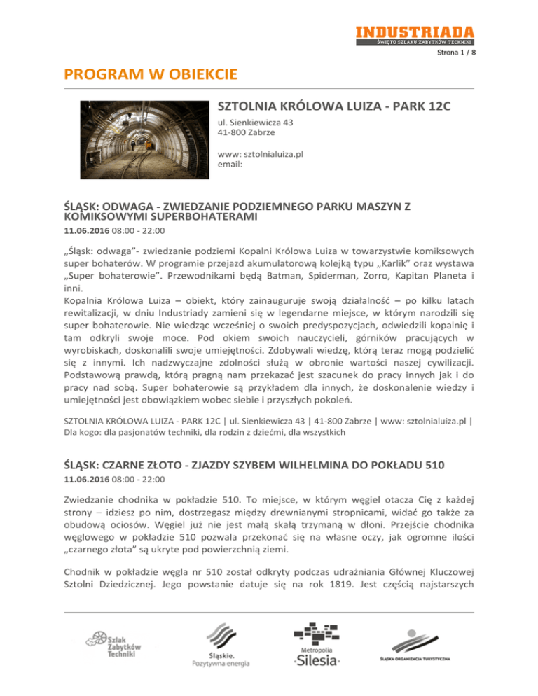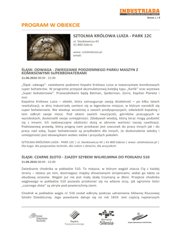 Strona 1 / 8 PROGRAM W OBIEKCIE SZTOLNIA KRÓLOWA LUIZA - PARK 12C ul. Sienkiewicza 43 41-800 Zabrze www: sztolnialuiza.pl email: ŚLĄSK: ODWAGA - ZWIEDZANIE PODZIEMNEGO PARKU MASZYN Z KOMIKSOWYMI SUPERBOHATERAMI 11.06.2016 08:00 - 22:00 „Śląsk: odwaga”- zwiedzanie podziemi Kopalni Królowa Luiza w towarzystwie komiksowych super bohaterów. W programie przejazd akumulatorową kolejką typu „Karlik” oraz wystawa „Super bohaterowie”. Przewodnikami będą Batman, Spiderman, Zorro, Kapitan Planeta i inni. Kopalnia Królowa Luiza – obiekt, który zainauguruje swoją działalność – po kilku latach rewitalizacji, w dniu Industriady zamieni się w legendarne miejsce, w którym narodzili się super bohaterowie. Nie wiedząc wcześniej o swoich predyspozycjach, odwiedzili kopalnię i tam odkryli swoje moce. Pod okiem swoich nauczycieli, górników pracujących w wyrobiskach, doskonalili swoje umiejętności. Zdobywali wiedzę, którą teraz mogą podzielić się z innymi. Ich nadzwyczajne zdolności służą w obronie wartości naszej cywilizacji. Podstawową prawdą, którą pragną nam przekazać jest szacunek do pracy innych jak i do pracy nad sobą. Super bohaterowie są przykładem dla innych, że doskonalenie wiedzy i umiejętności jest obowiązkiem wobec siebie i przyszłych pokoleń. SZTOLNIA KRÓLOWA LUIZA - PARK 12C | ul. Sienkiewicza 43 | 41-800 Zabrze | www: sztolnialuiza.pl | Dla kogo: dla pasjonatów techniki, dla rodzin z dziećmi, dla wszystkich ŚLĄSK: CZARNE ZŁOTO - ZJAZDY SZYBEM WILHELMINA DO POKŁADU 510 11.06.2016 08:00 - 22:00 Zwiedzanie chodnika w pokładzie 510. To miejsce, w którym węgiel otacza Cię z każdej strony – idziesz po nim, dostrzegasz między drewnianymi stropnicami, widać go także za obudową ociosów. Węgiel już nie jest małą skałą trzymaną w dłoni. Przejście chodnika węglowego w pokładzie 510 pozwala przekonać się na własne oczy, jak ogromne ilości „czarnego złota” są ukryte pod powierzchnią ziemi. Chodnik w pokładzie węgla nr 510 został odkryty podczas udrażniania Głównej Kluczowej Sztolni Dziedzicznej. Jego powstanie datuje się na rok 1819. Jest częścią najstarszych Strona 2 / 8 wyrobisk kopalni „Królowa Luiza” i łączy szyb „Wilhelmina” z głównym chodnikiem Sztolni. Sam w sobie stanowi unikat na skalę europejską – jest najstarszym odkrytym chodnikiem górniczym, wiodącym przez olbrzymią bryłę węglową. SZTOLNIA KRÓLOWA LUIZA - PARK 12C | ul. Sienkiewicza 43 | 41-800 Zabrze | www: sztolnialuiza.pl | Dla kogo: dla pasjonatów techniki, dla wszystkich SUPERBOHATEROWIE – WYSTAWA 11.06.2016 08:00 - 23:59 Superbohaterowie – wystawa prezentująca wizerunki naszych codziennych super bohaterów – górników w zderzeniu z super bohaterami kultury masowej. Jej koncepcja bazuje na zabawnym pomieszaniu fotografii; twarzy autentycznych hajerów po szychcie z wizerunkami komiksowych postaci jak: Batman, Supermen itp. Nie pozostawiające dużego pola do interpretacji przesłanie tego dzieła każdorazowo wywołuje uśmiech u odbiorców niezależnie od wieku. Śmiało można też założyć, że jest zrozumiała dla każdego mieszkańca naszej planety, niezależnie od miejsca zamieszkania i koloru skóry. Wystawa po trzech latach od premiery ciągle żyje, o czym świadczą powtarzające się wpisy górników – uczestników tego projektu, rozpoznających się na fotografiach prezentujących wystawę, przy różnych okazjach w mediach społecznościowych. Premierowy pokaz wystawy miał miejsce w zabytkowej kopalni Zollverein w Essen, Niemcy, przy okazji święta Extraschicht 2013 – odpowiednika naszej Industriady. SZTOLNIA KRÓLOWA LUIZA - PARK 12C | ul. Sienkiewicza 43 | 41-800 Zabrze | www: sztolnialuiza.pl | Dla kogo: dla rodzin z dziećmi, dla wszystkich ŚLĄSK: DZIECI - PARK 12C I BAJTEL GRUBA 11.06.2016 09:00 - 22:00 Plenerowa, edukacyjno - rekreacyjna wystawa "Park 12 C" to część kompleksu Sztolni Królowa Luiza, zlokalizowana w okolicy szybu "Wilhelmina" przy ul. Sienkiewicza 43 w Zabrzu. Park stanowi przestrzeń, w której dzieci i młodzież mogą w atrakcyjny sposób poznać zagadnienia związane z żywiołami ziemskimi, technikami wydobywania węgla i energią w przyrodzie. Głównym zamysłem parku jest interakcja, aktywna nauka i zabawa, a także wypoczynek w strefie grillowej. Na terenie Parku 12 C znajduje się Bajtel Gruba – o czym poniżej: BajtelGruba: W BajtelGrubie najmłodsi mogą spełnić jedno ze swoich najskrytszych marzeń: wcielić się w zawód górnika! BajtelGruba to zabawkowa mini-kopalnia, pełna ruchomych urządzeń obsługiwanych przez dzieci. Mała brygada ładuje „węgiel” do wózków na urobek za pomocą łopaty, transportuje go specjalnymi przenośnikami aż do szybu, gdzie przy pomocy kolegów Strona 3 / 8 napędzających urządzenie wyciągowe wyjeżdża on na powierzchnię. Tam zostaje przejęty przez brygadę naziemną, która komunikuje się z poziomem wydobywczym za pomocą specjalnych telefonów akustycznych. BajtelGruba to wspaniała, podziemno-naziemna atrakcja, która dzięki zabawkowym maszynom górniczym pozwala dzieciom zamienić się w małych górników, pracujących na „prawdziwej” kopalni! Niektóre instalacje dostępne w Parku 12 C: Camera obscura Można powiedzieć, że camera obscura to gigantyczy aparat fotograficzny z możliwością wejścia do środka! Obejrzysz panoramę okolicy znajdując się wewnątrz budynku bez okien. Jest to możliwe dzięki układom soczewek i zwierciadeł zamontowanych u szczytu budynku, które odpowiednio ustawione rzutują obraz na płaski stół. Dzięki obsługiwanemu ręcznie mechanizmowi możesz manipulować zarówno ostrością, jak i obrotem soczewki skupiającej obraz. W budynku znajduje się także ciemnia fotograficzna, umożliwiająca wywołanie "zdjęć" zrobionych przez camerę. Słoneczna fontanna Słońce to gigantyczne źródło darmowej energii elektrycznej. Ster