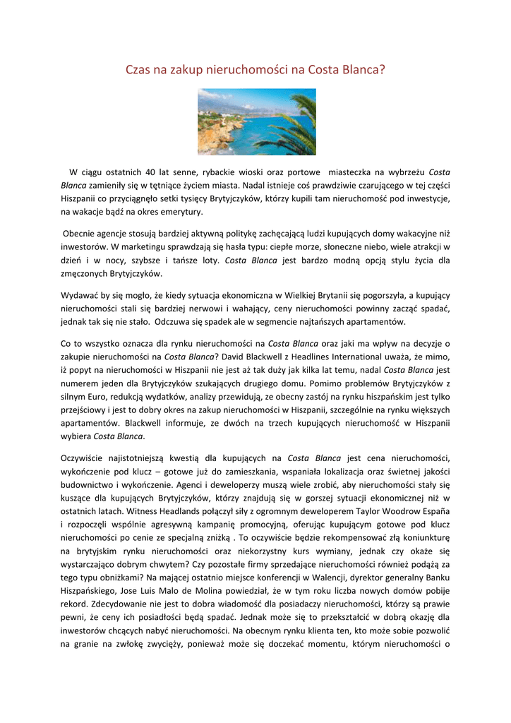 Czas na zakup nieruchomości na Costa Blanca? W ciągu ostatnich 40 lat senne, rybackie wioski oraz portowe miasteczka na wybrzeżu Costa Blanca zamieniły się w tętniące życiem miasta. Nadal istnieje coś prawdziwie czarującego w tej części Hiszpanii co przyciągnęło setki tysięcy Brytyjczyków, którzy kupili tam nieruchomość pod inwestycje, na wakacje bądź na okres emerytury. Obecnie agencje stosują bardziej aktywną politykę zachęcającą ludzi kupujących domy wakacyjne niż inwestorów. W marketingu sprawdzają się hasła typu: ciepłe morze, słoneczne niebo, wiele atrakcji w dzień i w nocy, szybsze i tańsze loty. Costa Blanca jest bardzo modną opcją stylu życia dla zmęczonych Brytyjczyków. Wydawać by się mogło, że kiedy sytuacja ekonomiczna w Wielkiej Brytanii się pogorszyła, a kupujący nieruchomości stali się bardziej nerwowi i wahający, ceny nieruchomości powinny zacząć spadać, jednak tak się nie stało. Odczuwa się spadek ale w segmencie najtańszych apartamentów. Co to wszystko oznacza dla rynku nieruchomości na Costa Blanca oraz jaki ma wpływ na decyzje o zakupie nieruchomości na Costa Blanca? David Blackwell z Headlines International uważa, że mimo, iż popyt na nieruchomości w Hiszpanii nie jest aż tak duży jak kilka lat temu, nadal Costa Blanca jest numerem jeden dla Brytyjczyków szukających drugiego domu. Pomimo problemów Brytyjczyków z silnym Euro, redukcją wydatków, analizy przewidują, ze obecny zastój na rynku hiszpańskim jest tylko przejściowy i jest to dobry okres na zakup nieruchomości w Hiszpanii, szczególnie na rynku większych apartamentów. Blackwell informuje, ze dwóch na trzech kupujących nieruchomość w Hiszpanii wybiera Costa Blanca. Oczywiście najistotniejszą kwestią dla kupujących na Costa Blanca jest cena nieruchomości, wykończenie pod klucz – gotowe już do zamieszkania, wspaniała lokalizacja oraz świetnej jakości budownictwo i wykończenie. Agenci i deweloperzy muszą wiele zrobić, aby nieruchomości stały się kuszące dla kupujących Brytyjczyków, którzy znajdują się w gorszej sytuacji ekonomicznej niż w ostatnich latach. Witness Headlands połączył siły z ogromnym deweloperem Taylor Woodrow España i rozpoczęli wspólnie agresywną kampanię promocyjną, oferując kupującym gotowe pod klucz nieruchomości po cenie ze specjalną zniżką . To oczywiście będzie rekompensować złą koniunkturę na brytyjskim rynku nieruchomości oraz niekorzystny kurs wymiany, jednak czy okaże się wystarczająco dobrym chwytem? Czy pozostałe firmy sprzedające nieruchomości również podążą za tego typu obniżkami? Na mającej ostatnio miejsce konferencji w Walencji, dyrektor generalny Banku Hiszpańskiego, Jose Luis Malo de Molina powiedział, że w tym roku liczba nowych domów pobije rekord. Zdecydowanie nie jest to dobra wiadomość dla posiadaczy nieruchomości, którzy są prawie pewni, że ceny ich posiadłości będą spadać. Jednak może się to przekształcić w dobrą okazję dla inwestorów chcących nabyć nieruchomości. Na obecnym rynku klienta ten, kto może sobie pozwolić na granie na zwłokę zwycięży, ponieważ może się doczekać momentu, którym nieruchomości o najwyższym standardzie będą oferowane po cenach, które jeszcze niedawno były uważane za nie do przyjęcia. Zatem nadchodzi okres ofert i okazji. Costa Blanca oferuje wiele miejsc cieszących się dużą popularnością wśród Brytyjczyków. Należą do nich Moraira, Altea oraz ostatnio coraz bardziej modne Elche. Są to średniej wielkości miasta zlokalizowane blisko morzą, a także w niedalekiej odległości od lotniska. Posiadają infrastrukturę i bazę turystyczną na wysokim poziomie, a jednocześnie zachowują swój typowo hiszpański styl i atmosferę. Ceny za apartament nie przekraczają 250 000€, natomiast za wille kształtują się w granicach od 350 000 do 500 000€. W ostatnim czasie najkorzystniej kształtowały się ceny w Elche, gdzie nie odnotowano żadnego ich spadku. Ogólnie rzecz biorąc przewiduje się, że ceny zaczną się stabilizować pod koniec 2008 roku i proces ten zakończy się do połowy 2009. Rynek nieruchomości na Costa Blanca będzie odżywał i hiszpańskie wybrzeża pozostaną numerem jeden zarówno dla kupujących domy wakacyjne jak i dla inwestorów. Listopad 2008, tłumaczenie z prasy brytyjskiej