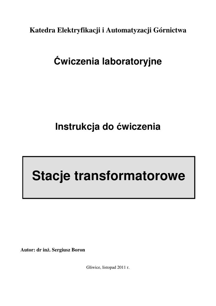 Katedra Elektryfikacji i Automatyzacji Górnictwa Ćwiczenia laboratoryjne Instrukcja do ćwiczenia Stacje transformatorowe Autor: dr inż. Sergiusz Boron Gliwice, listopad 2011 r. -2- 1. Wstęp Celem ćwiczenia jest zapoznanie studentów z przeznaczeniem i budową stacji transformatorowych stosowanych w podziemnych wyrobiskach zakładów górniczych. Stacje transformatorowe służą do przekształcania (najczęściej obniżania) wartości napięcia, z tego względu głównym elementem ich wyposażenia elektrycznego jest transformator. Stacje zawierają również aparaturę łączeniową, zabezpieczeniową i sterującą. Do zasilania sieci elektroenergetycznych w oddziałach wydobywczych stosuje się przewoźne stacje transformatorowe, które są przemieszczane w ślad za postępem robót górniczych (wynika to z konieczności lokalizowania ich w możliwie niedużej odległości od zasilanych odbiorników w celu ograniczenia spadków napięcia). Górnicze stacje transformatorowe budowane są jako normalne i ognioszczelne, przy czym wyposażenie stacji ognioszczelnych, zwłaszcza starszej konstrukcji, jest ograniczone do niezbędnego minimum. Wynika to z dążenia do ograniczenia wymiarów stacji oraz jej masy w celu ułatwienia transportu oraz możliwości lokalizacji stacji w świetle wyrobiska (bez budowy wnęk). Górnicze stacje transformatorowe przeznaczone są do zasilania sieci niskonapięciowych o napięciu znamionowym 500 lub 1000 V a także sieci o napięciu 3300 V. Napięcie znamionowe strony górnej transformatorów wynosi 6000 V, napięcie znamionowe dolne jest z reguły 5 % wyższe od napięcia znamionowego sieci zasilanej ze stacji, przy czym istnieje możliwość regulacji (ręcznej, po wcześniejszym odłączeniu transformatora od sieci zasilającej) przekładni transformatora w zakresie ±5 % za pomocą tzw. zaczepów (regulacja odbywa się poprzez zmianę liczby zwojów uzwojenia górnego). Stacje transformatorowe górnicze wyposażone są w transformator suchy trójfazowy, przy czym moce znamionowe transformatorów zawierają się w przedziale od 200 do ponad 2000 kVA. 2. Budowa stacji transformatorowej budowy przeciwwybuchowej typu MAR-400/6 PM Rys. 2.1. Widok ognioszczelnej stacji transformatorowej typu MAR-400/6 PM Obudowa ognioszczelnej stacji transformatorowej typu MAR-400/6 PM wykonana jest z blachy stalowej o grubości 5÷25 mm i składa się z pięciu połączonych ze sobą ognioszczelnych komór. Obudowa umieszczona jest na podwoziu wyposażonym w koła jezdne ułatwiające transport stacji do miejsca zainstalowania. Widok stacji przedstawiony jest na rys. 2.1 natomiast schemat elektryczny na rys. 2.2. -3- Rys. 2.2. Schemat elektryczny stacji transformatorowej MAR-400/6 PM Q – rozłącznik, Tg – transformator główny, Tp – transformator pomocniczy, F – bezpieczniki topikowe, PP – przekładniki prądowe, K – stycznik główny Komora transformatora mieści transformator główny. Do powierzchni zewnętrznej komory przyspawane są rury stalowe tworzące radiator zwiększający intensywność oddawania ciepła. Komora górnego napięcia wyposażona jest w drzwi uchylne otwierane za pomocą klucza specjalnego. W komorze tej znajduje się rozłącznik OKR-6/6-1 przeznaczony do załączania i wyłączania prądu biegu jałowego transformatora głównego. Stan styków rozłącznika widoczny jest poprzez cztery okienka umieszczone w drzwiach komory. Napęd rozłącznika oraz drzwi komory górnego napięcia sprzężone są z blokadą mechaniczną uniemożliwiającą ich otwarcie przy załączonym rozłączniku jak również zamknięcie rozłącznika przy otwartych drzwiach. W komorze tej dokonuje się również regulacji przekładni transformatora poprzez przełączenie przewodów do odpowiednich odczepów uzwojenia pierwotnego transformatora wyprowadzonych poprzez izolatory przepustowe. Na komorze górnego napięcia umieszczono skrzynkę przyłączową łącznika blokady pierścienia. Widok komory górnego napięcia przedstawiono na rys. 2.3. Rys. 2.3. Widok zamkniętej (z lewej) i otwartej (z prawej) komory górnego napięcia. Nad zamkniętą pokrywą widoczna niebieska komora łącznika blokady pierścienia. -4Komora dolnego napięcia wyposażona jest w drzwi uchylne otwierane za pomocą klucza specjalnego. W komorze tej umieszczono aparaty niskiego napięcia takie jak bezpieczniki topikowe, stycznik próżniowy typu LSV-454, przekaźnik mikroprocesorowy sterowniczozabezpieczeniowy PM-2 oraz inne elementy sterowania i kontroli. W drzwiach komory znajduje się wziernik umożliwiający obserwację wskazań wyświetlacza przekaźnika PM-2. Na drzwiach umieszczono również łącznik z kluczem specjalnym „STOP / KASOWANIE” oraz przycisk kontroli zabezpieczeń „KONTROLA”. Z boku obudowy umieszczono okienko, przez które możliwa jest obserwacja wskazań woltomierza mierzącego napięcie odpływowe stacji transformatorowej oraz łącznik awaryjnego wyłączenia „STOP AWARYJNY”. Po przeciwnej stronie obudowy umieszczono łącznik sterowania lokalnego „START”. Widok komory górnego napięcia przedstawiono na rys. 2.4, natomiast zabezpieczenia PM-2 na rys. 2.5. Rys. 2.4. Widok komory dolnego napięcia przy zamkniętych (z lewej) i otwartych (z prawej) drzwiach. Rys. 2.5. Widok panelu czołowego przekaźnika mikroprocesorowego sterowniczozabezpieczeniowego PM-2 Komory przyłączowe znajdują się nad komorami górnego i dolnego napięcia. W komorach tych znajdują się zaciski przyłączeniowe kabli: zasilającego, przelotowego i odpływowego. Kable wprowadza się do komór poprzez wpusty kablowe. -5- 3. Blokady Blokady zastosowane w stacji transformatorowej uniemożliwiają wykonywanie niedozwolonych operacji obsługowych i łączeniowych. Blokady mechaniczne realizowane są za pomocą trzech zamków, do których jest jeden klucz. Dwa zamki związane są z mechanizmami otwierania i zamykania drzwi komór górnego i dolnego napięcia, trzeci z mech