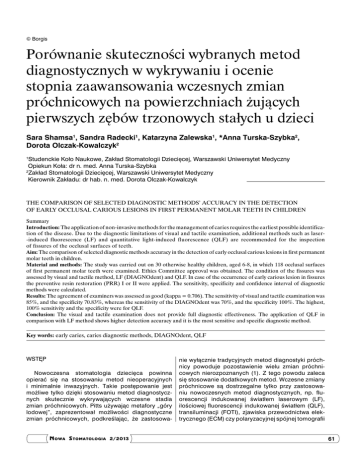 © Borgis Porównanie skuteczności wybranych metod diagnostycznych w wykrywaniu i ocenie stopnia zaawansowania wczesnych zmian próchnicowych na powierzchniach żujących pierwszych zębów trzonowych stałych u dzieci Sara Shamsa1, Sandra Radecki1, Katarzyna Zalewska1, *Anna Turska-Szybka2, Dorota Olczak-Kowalczyk2 Studenckie Koło Naukowe, Zakład Stomatologii Dziecięcej, Warszawski Uniwersytet Medyczny Opiekun Koła: dr n. med. Anna Turska-Szybka 2 Zakład Stomatologii Dziecięcej, Warszawski Uniwersytet Medyczny Kierownik Zakładu: dr hab. n. med. Dorota Olczak-Kowalczyk 1 The comparison of selected diagnostic methods’ accuracy in the detection of early occlusal carious lesions in first permanent molar teeth in children Summary Introduction: The application of non-invasive methods for the management of caries requires the earliest possible identification of the disease. Due to the diagnostic limitations of visual and tactile examination, additional methods such as laser-induced fluorescence (LF) and quantitative light-induced fluorescence (QLF) are recommended for the inspection of fissures of the occlusal surfaces of teeth. Aim: The comparison of selected diagnostic methods accuracy in the detection of early occlusal carious lesions in first permanent molar teeth in children. Material and methods: The study was carried out on 30 otherwise healthy children, aged 6-8, in which 118 occlusal surfaces of first permanent molar teeth were examined. Ethics Committee approval was obtained. The condition of the fissures was assessed by visual and tactile method, LF (DIAGNOdent) and QLF. In case of the occurrence of early carious lesion in fissures the preventive resin restoration (PRR) I or II were applied. The sensitivity, specificity and confidence interval of diagnostic methods were calculated. Results: The agreement of examiners was assessed as good (kappa = 0.706). The sensitivity of visual and tactile examination was 85%, and the specificity 70.83%, whereas the sensitivity of the DIAGNOdent was 70%, and the specificity 100%. The highest, 100% sensitivity and the specificity were for QLF. Conclusion: The visual and tactile examination does not provide full diagnostic effectiveness. The application of QLF in comparison with LF method shows higher detection accuracy and it is the most sensitive and specific diagnostic method. Key words: early caries, caries diagnostic methods, DIAGNOdent, QLF Wstęp Nowoczesna stomatologia dziecięca powinna opierać się na stosowaniu metod nieoperacyjnych i minimalnie inwazyjnych. Takie postępowanie jest możliwe tylko dzięki stosowaniu metod diagnostycznych skutecznie wykrywających wczesne stadia zmian próchnicowych. Pitts używając metafory „góry lodowej”, zaprezentował możliwości diagnostyczne zmian próchnicowych, podkreślając, że zastosowa- N OWA S TOMATOLOGIA 2/2013 nie wyłącznie tradycyjnych metod diagnostyki próchnicy powoduje pozostawienie wielu zmian próchnicowych nierozpoznanych (1). Z tego powodu zaleca się stosowanie dodatkowych metod. Wczesne zmiany próchnicowe są dostrzegalne tylko przy zastosowaniu nowoczesnych metod diagnostycznych, np. fluorescencji indukowanej światłem laserowym (LF), ilościowej fluorescencji indukowanej światłem (QLF), transiluminacji (FOTI), zjawiska przewodnictwa elektrycznego (ECM) czy polaryzacyjnej spójnej tomografii 61 Sara Shamsa i wsp. optycznej (PS-OCT). Są to metody nieinwazyjne i dobrze tolerowane przez dzieci. W praktyce klinicznej badanie opiera się głównie na metodzie wizualno-dotykowej, która ma swoje ograniczenia w ocenie stanu bruzd na powierzchniach okludalnych zębów. Powierzchnie zgryzowe zębów bocznych są najbardziej predysponowanymi miejscami do rozwoju choroby próchnicowej. Ubytki tam zlokalizowane mogą stanowić nawet ponad 90% wszystkich ubytków stwierdzanych u dzieci (2). Głównie dotyczy to pierwszych zębów trzonowych i jest uwarunkowane budową anatomiczną (3, 4). Obserwowane są bruzdy typu lejkowatego, klepsydrowatego, szczelinowatego, szerokie i nieregularne (5). Blisko połowa bruzd ma kształt szeroki (typ U i V), a reszta wąski (6). Jak podają Lee i Swartz, średnia głębokość bruzdy centralnej wynosi od 0,1 do 1,5 mm (7). Stosunkowo szerokie wejście ulega zwężeniu nawet do 0,1 mm. Szczoteczka o średnicy włosia od 0,15 do 0,3 mm uniemożliwia oczyszczanie całej głębokości bruzdy (8). Utrudnione szczotkowanie, ograniczone działanie śliny i związków fluoru sprawiają, że flora bakteryjna płytki nazębnej łatwo kolonizuje wnętrze bruzd, inicjując proces próchnicowy. W celu zminimalizowania miejsc retencyjnych dla płytki nazębnej, zwłaszcza u małych dzieci, u których powierzchnia okludalna charakteryzuje się wydatnymi guzkami i głębokimi bruzdami, zaleca się profilaktyczne uszczelnianie bruzd. Szczególnie narażone na zapoczątkowanie procesu próchnicowego są pierwsze zęby trzonowe stałe, które pojawiają się w jamie ustnej około 6 roku życia. W tym okresie dziecko nie zawsze posiada umiejętność poprawnego szczotkowania zębów, a rodzice często odstępują już od regularnej kontroli i pomocy w przeprowadzeniu zabiegów higienicznych. Profilaktyczne uszczelnienie bruzd jest zabiegiem przeciwwskazanym, gdy w zębie stwierdza się ubytek próchnicowy. Przy zmianie ograniczonej do szkliwa, na powstały ubytek zmineralizowanej tkanki i pozostałe bruzdy stosuje się uszczelniacz (tzw. poszerzone lakowanie), a gdy ubytek sięga zębiny, wówczas wykonuje się tzw. wypełnienie zapobiegawcze (9). Wypełnienie zapobiegawcze (ang. Preventive Resin Restoration – PRR) wprowadzone zostało przez Simonsena i Stallarda w 1977 roku (10). Początkowo polegało na punktowym usunięciu próchnicy i odbudowie małego ubytku materiałem złożonym z jednoczesnym uszczelnieniem bruzd lakiem szczelinowym. Modyfikacja tej metody polega na wypełnieniu ubytku cementem szkłojonomerowym lub cementem szkło-jonomerow