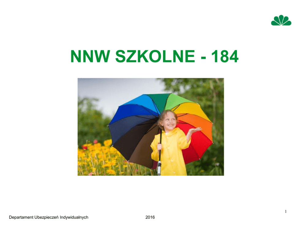 NNW SZKOLNE - 184 1 Departament Ubezpieczeń Indywidualnych 2016 Ubezpieczenie szkolne Ubezpieczenie dedykowane jest dla: dzieci, młodzieży, osób uczących się, personelu placówki oświatowej w tym: dziecko lub uczeń, w tym również: osoba z upośledzeniem umysłowym (w stopniu umożliwiającym naukę w ramach klas (oddziałów) integracyjnych lub szkolnictwa specjalnego), osoba z upośledzeniem ruchowym, osoba niewidoma oraz niesłysząca nauczyciel lub wychowawca zatrudniony w placówce oświatowej bez względu na podstawę prawną zatrudnienia pracownik administracyjny, zatrudniony w palcówce oświatowej bez względu na podstawą prawną zatrudnienia Departament Ubezpieczeń Indywidualnych 2016 Nieszczęśliwy wypadek – definicja NIESZCZĘŚLIWY WYPADEK – nagłe zdarzenie wywołane przyczyną zewnętrzną, w wyniku którego Ubezpieczony, niezależnie od swej woli, doznał trwałego uszczerbku na zdrowiu lub zmarł; za nieszczęśliwy wypadek w rozumieniu OWU uznaje się również: • zawał serca i udar mózgu, • usiłowanie popełnienia lub popełnienie samobójstwa, • utonięcie, • atak epileptyczny, • omdlenie Departament Ubezpieczeń Indywidualnych 2016 Sport w ubezpieczeniu szkolnym Zakres obejmuje nieszczęśliwe wypadki powstałe podczas uprawiania sportu (w tym: karate, judo, capoeira, jujitsu, takewondo, zapasy, kendo, kung-fu, tai chi, aikido) w ramach SKS, UKS i w pozaszkolnych klubach sportowych pod warunkiem, że nie jest to zarobkowe uprawianie sportu. 4 Departament Ubezpieczeń Indywidualnych 2016 Śmierć wskutek nieszczęśliwego wypadku Śmierć wskutek nieszczęśliwego wypadku Śmierć wskutek nieszczęśliwego wypadku w środku lokomocji lub wskutek aktów sabotażu i terroru Suma ubezpieczenia: Minimalna: 5 000 zł Maksymalna: 50 000 zł Suma ubezpieczenia na ryzyko śmierć wskutek nieszczęśliwego wypadku w środku lokomocji lub wskutek aktów sabotażu i terroru wynosi dodatkowe 50% sumy wskazanej na śmierć wskutek nw – jest to dodatkowa suma ubezpieczenia Zakres terytorialny: Śmierć wskutek nieszczęśliwego wypadku – cały świat Śmierć wskutek nieszczęśliwego wypadku w środku lokomocji – cały świat Śmierć wskutek nieszczęśliwego wypadku lub wskutek aktów sabotażu i terroru ograniczony do krajów członkowskich Unii Europejskiej Departament Ubezpieczeń Indywidualnych 2016 Trwały uszczerbek na zdrowiu wskutek nw Trwały uszczerbek na zdrowiu wypłacany jest w oparciu o Tabelę Uszczerbkową obowiązującą w dniu zawarcia umowy. Suma ubezpieczenia: Minimalna: 5 000 zł Maksymalna: 50 000 zł Suma ubezpieczenia na ryzyko trwałego uszczerbku wskutek nieszczęśliwego wypadku wskutek aktów sabotażu i terroru wynosi dodatkowe 50% sumy wskazanej na trwały uszczerbek wskutek nw – jest to dodatkowa suma ubezpieczenia Limity: jednorazowe świadczenie z tytułu pogryzienia, ukąszenia, użądlenia, jednorazowe świadczenie z tytułu wystąpienia nieszczęśliwego wypadku w przypadku, gdy nie został orzeczony trwały uszczerbek na zdrowiu zwrot kosztów operacji plastycznych wskutek nw są wypłacane w ramach s.u. wskazanej na trwały uszczerbek Departament Ubezpieczeń Indywidualnych 2016 Klauzula nr 1 – zwrot kosztów leczenia KOSZTY LECZENIA – związane z nieszczęśliwym wypadkiem objętym ochroną ubezpieczeniową w ramach umowy niezbędne wydatki poniesione przez Ubezpieczonego na terytorium Rzeczpospolitej Polskiej z tytułu: • udzielenia pomocy lekarskiej lub ambulatoryjnej; • wizyt i honorariów lekarskich; • pobytu w szpitalu, badań, zabiegów ambulatoryjnych i operacji (z wyłączeniem operacji plastycznych); • nabycia niezbędnych lekarstw i środków opatrunkowych (w tym gips lekki) przepisanych przez lekarza; • transportu z miejsca nieszczęśliwego wypadku do szpitala/ambulatorium • zaleconej przez lekarza odbudowy zębów stałych. Limit odpowiedzialności: • 40% sumy ubezpieczenia wskazanej na trwały uszczerbek na zdrowiu • 1.000 zł na odbudowę zębów stałych, nie więcej niż 200 zł na jeden ząb Limity wypłacane są w ramach sumy ubezpieczenia wskazanej na trwały uszczerbek na zdrowiu Wypłata: • Koszty leczenia muszą być poniesione w następstwie zajścia nieszczęśliwego wypadku objętego umową • oryginały rachunków / faktur Szczególne wyłączenia: Poza wyłączeniami odpowiedzialności określonymi w § 4 OWU, COMPENSA nie ponosi odpowiedzialności za wydatki poniesione na: • zabiegi stomatologiczne o charakterze profilaktycznym • leczenie korony zęba, korzenia zęba, paradontozy, usunięcia kamienia nazębnego. Departament Ubezpieczeń Indywidualnych 2016 Klauzula nr 2 – dzienne świadczenie szpitalne POBYT W SZPITALU – pobyt Ubezpieczonego w szpitalu w następstwie nieszczęśliwego wypadku objętego ochroną ubezpieczeniową w ramach umowy, służący przywróceniu lub poprawie zdrowia Ubezpieczonego. Jako pierwszy dzień pobytu Ubezpieczonego w szpitalu liczony jest dzień rejestracji, a jako ostatni - dzień wypisu ze szpitala. Jeżeli w czasie pobytu w szpitalu nastąpił zgon Ubezpieczonego, okres pobytu w szpitalu liczony jest do daty zgonu Ubezpieczonego Limity odpowiedzialności (wybrany przez Ubezpieczającego): • 15 zł za każdy dzień pobytu Ubezpieczonego w szpitalu, nie więcej niż 1.350 zł na wszystkie nieszczęśliwe wypadki w okresie ubezpieczenia; • 25 zł za każdy dzień pobytu Ubezpieczonego w szpitalu, nie więcej niż 2.250 zł na wszystkie nieszczęśliwe wypadki w okresie ubezpieczenia; • 35 zł za każdy dzień pobytu w szpitalu Ubezpieczonego, nie więcej niż 3.150 zł na wszystkie nieszczęśliwe wypadki w okresie ubezpieczenia. Wypłata: Za każdy dzień, maksymalnie 90 dni Pobyt w szpitalu co najmniej 3 dni Dostarczenie karty leczenia szpitalnego Wypłata dziennego świadczenia szpitalnego następuje, jeżeli pobyt w szpitalu jest następstwem wystąpienia w okresie ubezpieczenia nieszczęśliwego wypadku