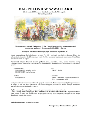 BAL POLONII W SZWAJCARII 26 stycznia 2008 roku w Sali Balowej Hotelu Mövenpick Zürich-Regensdorf Mamy zaszczyt zaprosić Państwa na IX Bal Polonii Szwajcarskiej organizowany pod patronatem Ambasady Rzeczpospolitej Polskiej w Bernie. Uroczyste otwarcie Balu tradycyjnym polonezem o godzinie 2000. Koszt uczestnictwa dla jednej osoby wynosi Fr. 100 i obejmuje trzydaniową kolację. Bilety dla młodzieży i studentów do 25 roku są w cenie Fr. 85.- (aktualna legitymacja niezbędna). Cena biletu nie zawiera opłat za napoje. Rezerwacji miejsc dokonać można podając imię, nazwisko, adres, numer telefonu osoby zgłaszającej oraz ilość osób, ich imiona oraz nazwiska (stół dla niepalących lub palących) w poniższy sposób: ⋅ Telefonicznie: 056 634 48 92 Jadwiga Müller 044 825 41 23 Maria Natora ⋅ Fax: 044 371 60 60 ⋅ E-Mail: [email protected] ⋅ Listownie: Paweł Zgorzelski, Unterrenggstrasse 36, 8135 Langnau am Albis Istnieje możliwość rezerwacji stołów dla grup 10-osobowych. Rezerwacja miejsc będzie potwierdzana w ciągu 14 dni od daty zgłoszenia. Dla osób chcących pozostać w Hotelu istnieje możliwość rezerwacji pokoi po obniżonych cenach. Wpłat prosimy dokonywać po otrzymaniu potwierdzenia rezerwacji na konto: „Piast Gesang- und Tanzgruppe, 8424 Embrach, PC Konto-Nr: 87-690218-5 z dopiskiem ”Ball”. Ilość miejsc na Balu jest ograniczona. W przypadku liczby zgłoszeń przewyższającej liczbę miejsc decydować będzie data wpłaty. Na Balu obowiązują stroje wieczorowe. Polonijny Zespół Tańca i Pieśni „Piast“