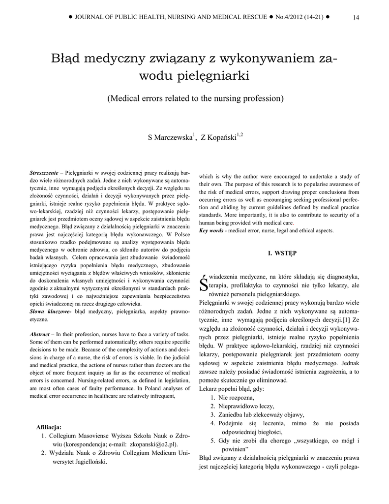 ● JOURNAL OF PUBLIC HEALTH, NURSING ANDAND MEDICAL RESCUE ● No.4/2012 (14-21) ● JOURNAL OF PUBLIC HEALTH, NURSING MEDICAL RESCUE ● No.4/2012 ● ● 14 Błąd medyczny związany z wykonywaniem zawodu pielęgniarki (Medical errors related to the nursing profession) S Marczewska1, Z Kopański1,2 Streszczenie – Pielęgniarki w swojej codziennej pracy realizują bardzo wiele różnorodnych zadań. Jedne z nich wykonywane są automatycznie, inne wymagają podjęcia określonych decyzji. Ze względu na złożoność czynności, działań i decyzji wykonywanych przez pielęgniarki, istnieje realne ryzyko popełnienia błędu. W praktyce sądowo-lekarskiej, rzadziej niż czynności lekarzy, postępowanie pielęgniarek jest przedmiotem oceny sądowej w aspekcie zaistnienia błędu medycznego. Błąd związany z działalnością pielęgniarki w znaczeniu prawa jest najczęściej kategorią błędu wykonawczego. W Polsce stosunkowo rzadko podejmowane są analizy występowania błędu medycznego w ochronie zdrowia, co skłoniło autorów do podjęcia badań własnych. Celem opracowania jest zbudowanie świadomość istniejącego ryzyka popełnienia błędu medycznego, zbudowanie umiejętności wyciągania z błędów właściwych wniosków, skłonienie do doskonalenia własnych umiejętności i wykonywania czynności zgodnie z aktualnymi wytycznymi określonymi w standardach praktyki zawodowej i co najważniejsze zapewniania bezpieczeństwa opieki świadczonej na rzecz drugiego człowieka. Słowa kluczowe- błąd medyczny, pielęgniarka, aspekty prawnoetyczne. Abstract – In their profession, nurses have to face a variety of tasks. Some of them can be performed automatically; others require specific decisions to be made. Because of the complexity of actions and decisions in charge of a nurse, the risk of errors is viable. In the judicial and medical practice, the actions of nurses rather than doctors are the object of more frequent inquiry as far as the occurrence of medical errors is concerned. Nursing-related errors, as defined in legislation, are most often cases of faulty performance. In Poland analyses of medical error occurrence in healthcare are relatively infrequent, Afiliacja: 1. Collegium Masoviense Wyższa Szkoła Nauk o Zdrowiu (korespondencja; e-mail: [email protected]). 2. Wydziału Nauk o Zdrowiu Collegium Medicum Uniwersytet Jagielloński. which is why the author were encouraged to undertake a study of their own. The purpose of this research is to popularise awareness of the risk of medical errors, support drawing proper conclusions from occurring errors as well as encouraging seeking professional perfection and abiding by current guidelines defined by medical practice standards. More importantly, it is also to contribute to security of a human being provided with medical care. Key words - medical error, nurse, legal and ethical aspects. I. WSTĘP wiadczenia medyczne, na które składają się diagnostyka, terapia, profilaktyka to czynności nie tylko lekarzy, ale również personelu pielęgniarskiego. Pielęgniarki w swojej codziennej pracy wykonują bardzo wiele różnorodnych zadań. Jedne z nich wykonywane są automatycznie, inne wymagają podjęcia określonych decyzji.[1] Ze względu na złożoność czynności, działań i decyzji wykonywanych przez pielęgniarki, istnieje realne ryzyko popełnienia błędu. W praktyce sądowo-lekarskiej, rzadziej niż czynności lekarzy, postępowanie pielęgniarek jest przedmiotem oceny sądowej w aspekcie zaistnienia błędu medycznego. Jednak zawsze należy posiadać świadomość istnienia zagrożenia, a to pomoże skutecznie go eliminować. Lekarz popełni błąd, gdy: 1. Nie rozpozna, 2. Nieprawidłowo leczy, 3. Zaniedba lub zlekceważy objawy, 4. Podejmie się leczenia, mimo że nie posiada odpowiedniej biegłości, 5. Gdy nie zrobi dla chorego „wszystkiego, co mógł i powinien” Błąd związany z działalnością pielęgniarki w znaczeniu prawa jest najczęściej kategorią błędu wykonawczego - czyli polega- Ś ● JOURNAL OF PUBLIC HEALTH, NURSING AND MEDICAL RESCUE ● No.4/2012 ● jącego na niepoprawnym wykonaniu zleceń diagnostycznych i terapeutycznych. Jest to wykonanie zabiegu w wyniku, którego powstanie szkoda nawet pod postacią przedłużonego pobytu pacjenta w szpitalu [1]. Nieprawidłowości te często wiążą się z niedoskonałością i zawodnością czynnika ludzkiego, na które rzutują określone nawyki, predyspozycje psychiczne takie jak zmęczenie, roztargnienie, lekkomyślność, niedbalstwo, a także rutyna. Niemałe znaczenie mają także warunki pracy, których wpływ na powstanie błędu lub zdarzenia niepożądanego zawiera się w dużym dziale tzw. błędów organizacyjnych. II. SKARGI PACJENTÓW Z jakimi roszczeniami przeciwko pracownikom medycznym, najczęściej występują pacjenci: 1. Nagła i niespodziewana śmierć po zabiegu operacyjnym, uważanym powszechnie za prosty lub w przebiegu schorzenia, uważanego za łatwe do wyleczenia, 2. Wystąpienie ciężkich powikłań, mieszczących się w granicach ryzyka leczniczego, z którymi chorzy lub jego rodzina nie liczyli się, 3. Udzielenie świadczeń zdrowotnych, na które według pacjenta nie wyraził on zgody, 4. Nie udzielenie pomocy choremu przez wezwanego lekarza, a zwłaszcza pozostawienie go w domu, gdy zdaniem rodziny wymagał on hospitalizacji, 5. Styl pracy personelu medycznego, sprawiający wrażenie lekceważenia i braku zainteresowania, 6. Nie przeprowadzenia lub przeprowadzenie zbyt pobieżne badań fizykalnych chorego, co budzi podejrzenie o niemożności postawienia w takiej sytuacji prawidłowego rozpoznania, 7. Nieprawidłowa ocena badań albo sprzeczność pomiędzy takimi samymi badaniami, dokonanymi przez różnych lekarzy, 8. Udzielenie informacji w ocenie pacjenta bulwersujących, przez niepowołane do tego osoby z personelu np. szpitala (salowe, pielęgniarki, sanitariusze) [1,2]. Najczęściej skarżą się c