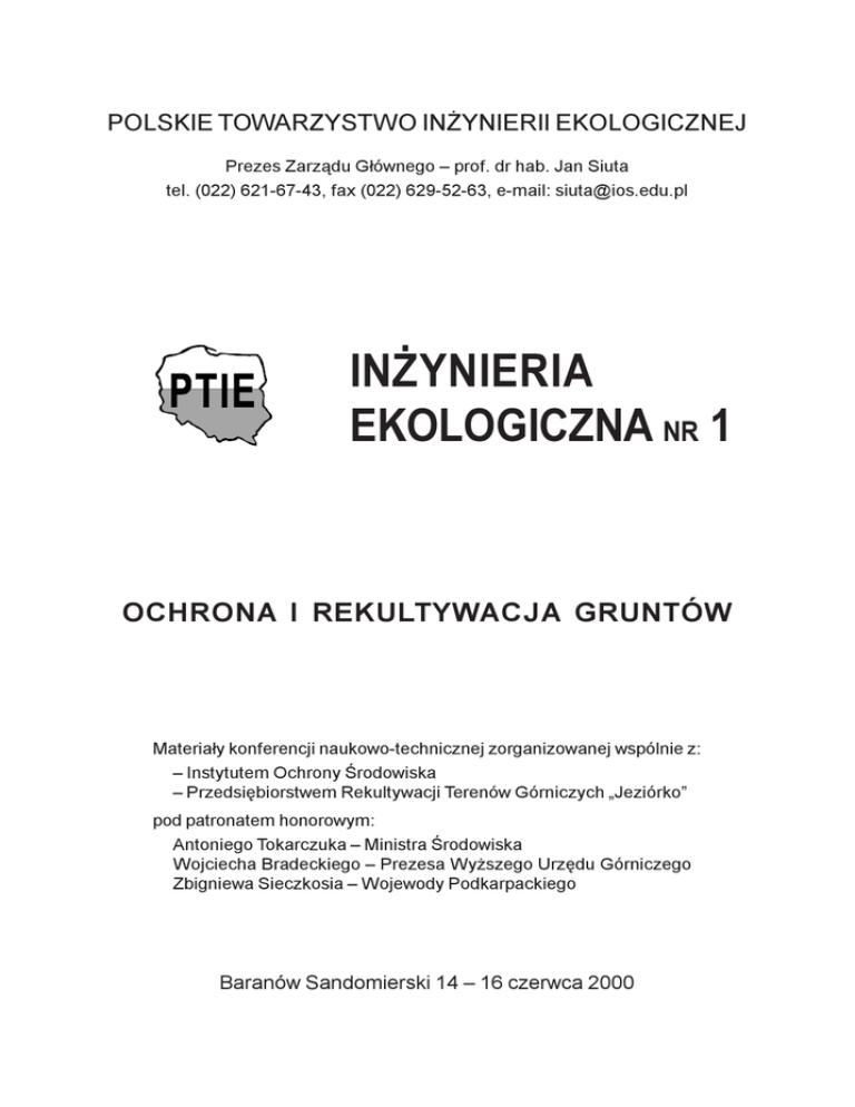 POLSKIE TOWARZYSTWO IN¯YNIERII EKOLOGICZNEJ Prezes Zarz¹du G³ównego prof. dr hab. Jan Siuta tel. (022) 621-67-43, fax (022) 629-52-63, e-mail: [email protected] IN¯YNIERIA EKOLOGICZNA NR 1 OCHRONA I REKULTYWACJA GRUNTÓW Materia³y konferencji naukowo-technicznej zorganizowanej wspólnie z: Instytutem Ochrony rodowiska Przedsiêbiorstwem Rekultywacji Terenów Górniczych Jeziórko pod patronatem honorowym: Antoniego Tokarczuka Ministra rodowiska Wojciecha Bradeckiego Prezesa Wy¿szego Urzêdu Górniczego Zbigniewa Sieczkosia Wojewody Podkarpackiego Baranów Sandomierski 14 16 czerwca 2000 KOMITET NAUKOWY 1. 2. 3. 4. 5. 6. 7. 8. prof. dr hab. in¿. Jan Siuta przewodnicz¹cy dr in¿. Jan Dulewski doc. dr hab. Barbara Gworek prof. dr hab. in¿. Czes³aw Józefaciuk prof. dr hab. in¿. Waldemar Mioduszewski doc. dr hab. in¿. Janusz Ostrowski prof. dr hab. in¿. Czes³aw Rosik-Dulewska prof. dr hab. Lech Ryszkowski KOMITET ORGANIZACYJNY prof. dr hab. in¿. Jan Siuta przewodnicz¹cy mgr in¿. Zbigniew Buczek mgr in¿. W³adys³aw Warzybok mgr in¿. Bogus³aw ¯ukowski © Copyright by Polskie Towarzystwo In¿ynierii Ekologicznej ISBN 83-911390-0-X Redakcja techniczna: mgr in¿. Gabriel Borowski mgr in¿. Gra¿yna Kutla Przygotowanie do druku i druk: Wydawnictwo EKOIN¯YNIERIA 20-723 Lublin, ul. Kielecka 4/1, tel./fax (0-81) 527-12-37 OCHRONA I REKULTYWACJA GRUNTÓW SPIS TRECI OCHRONA GRUNTÓW POWINNOCI¥ KA¯DEGO U¯YTKOWNIKA POWIERZCHNI ZIEMI Jan Siuta ............................................................................................................................... 7 PROBLEMY PRZYWRACANIA WARTOCI U¯YTKOWYCH GRUNTOM ZDEGRADOWANYM DZIA£ALNOCI¥ GÓRNICZ¥ Jan Dulewski, Leszek Wtorek ............................................................................................ 14 REKULTYWACJA TERENÓW GÓRNICZYCH KOPALNI SIARKI JEZIÓRKO W³adys³aw Warzybok ........................................................................................................... 23 ZASTOSOWANIE OSADÓW CIEKOWYCH W REKULTYWACJI GRUNTÓW KOPALNI SIARKI JEZIÓRKO Marek Joñca ......................................................................................................................... 27 PODSTAWOWE UWARUNKOWANIA REKULTYWACJI TERENÓW POGÓRNICZYCH KOPALNI SIARKI JEZIÓRKO Tadeusz Go³da ..................................................................................................................... 31 EFEKTYWNOÆ REKULTYWACJI TERENU ZWA£OWISKA KOPALNI SIARKI W PIASECZNIE Tadeusz Wêgorek ................................................................................................................ 37 REKULTYWACJA GRUNTÓW NA OBSZARZE GÓRNICZYM KWK BOGDANKA S.A. Stanis³aw Stachowicz, Teodor Kosiarski, Zbigniew Borchulski, Laurencja £yszczarz ....... 45 REKULTYWACJA TERENÓW ZDEGRADOWANYCH DZIA£ALNOCI¥ KOPALÑ WÊGLA KAMIENNEGO S³awomir Durczyñski ........................................................................................................... 50 REKULTYWACJA TERENU SK£ADOWANIA ODPADÓW KZS SOLVAY W KRAKOWIE Krzysztof Boroñ, Ewelina Zaj¹c, S³awomir Klatka ............................................................ 58 WYKORZYSTANIE OSADÓW (USTABILIZOWANYCH) Z OCZYSZCZALNI CIEKÓW KOMUNALNYCH DO REKULTYWACJI GRUNTÓW Bernard Quant, Zbigniew Sobociñski ................................................................................ 65 PRZYRODNICZE ZAGOSPODAROWANIE NIEU¯YTKÓW MIEJSKOPRZEMYS£OWYCH NA PRZYK£ADZIE CENTRÓW GÓRNICZYCH EUROPY Barbara Tokarska-Guzik ..................................................................................................... 72 REKULTYWACJA I ZAGOSPODAROWANIE NIEU¯YTKÓW POPRZEMYS£OWYCH ROZWI¥ZANIA ALTERNATYWNE Adam Rostañski ................................................................................................................... 81 ROLA PROCESÓW NATURALNYCH W REKULTYWACJI NIEU¯YTKÓW POPRZEMYS£OWYCH Gabriela Woniak, Agnieszka Kompa³a ........................................................................... 87 5 IN¯YNIERIA EKOLOGICZNA NR 1 PROBLEMY REKULTYWACJI GRUNTÓW ZNIEKSZTA£CONYCH BUDOW¥ INSTALACJI LINIOWYCH NAZIEMNYCH I PODZIEMNYCH Ryszard Cymreman, Andrzej Morze, Luiza Tyszko ........................................................ 94 OCHRONA MOKRADE£ I RETENCJA WODNA Barbara Piekarska, S³awomir Ró¿añski ........................................................................ 100 WP£YW WARUNKÓW METEOROLOGICZNYCH NA WILGOTNOÆ GLEB ZREKULTYWOWANYCH GRUNTÓW POGÓRNICZYCH Czes³aw Szafrañski, Piotr Stachowski ........................................................................... 105 CHARAKTERYSTYKA MOKRADE£ POJEZIERZA MAZURSKIEGO W ASPEKCIE ICH U¯YTKOWANIA I OCHRONY Jerzy Smo³ucha, Janusz Gotkiewicz ............................................................................... 113 MO¯LIWOCI ZWIÊKSZENIA RETENCJI OCZEK WODNYCH W ZDRENOWANEJ MIKROZLEWNI ROLNICZEJ Micha³ Fiedler, Czes³aw Szafrañski, Jerzy Bykowski .................................................... 120 ODDZIA£YWANIE ZABIEGÓW AGROMELIORACYJNYCH NA GOSPODARKÊ WODN¥ ZDRENOWANYCH GLEB INTENSYWNIE U¯YTKOWANYCH ROLNICZO Jerzy Bykowski, Czes³aw Szafrañski, Micha³ Fiedler .................................................... 129 PRODUKTYWNOÆ WIERZB KRZEWIASTYCH SALIX SP. NA GLEBIE ORGANICZNEJ Stefan Szczukowski, Józef Tworkowski .......................................................................... 138 WP£YW 7 HYDRATU SIARCZANU (VI) ¯ELAZA (II) NA WYSOKOÆ PLONÓW MIESZANKI REKULTYWACYJNEJ TRAW I ZAWARTOÆ W NIEJ KADMU, NIKLU I O£OWIU Edward Krzywy, Adam Grzekowiak, Ewa KrzywyGawroñska, Beata Dunowska ..... 145 KOMPOSTOWANIE PYLISTYCH ODPADÓW DRZEWNYCH Z PRODUKCJI PANELI BOAZERYJNYCH Z P£YT MDF Hanna Wróblewska ........................................................................................................... 150 OCHRONA POWIERZCHNI ZIEMI STAN I NIEZBÊDNE DZIA£ANIA Jan Siuta ..........