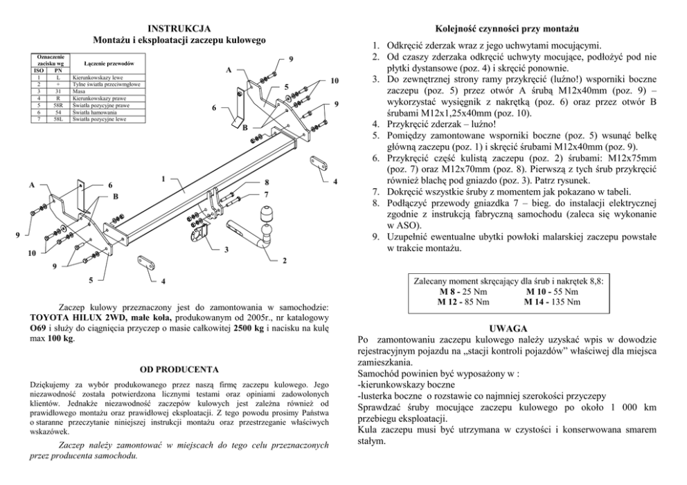 INSTRUKCJA MontaŜu i eksploatacji zaczepu kulowego Oznaczenie zacisku wg ISO PN 1 L 2 + 3 31 4 R 5 58R 6 54 7 58L Kolejność czynności przy montaŜu 9 Łączenie przewodów A Kierunkowskazy lewe Tylne światła przeciwmgłowe Masa Kierunkowskazy prawe Światła pozycyjne prawe Światła hamowania Światła pozycyjne lewe 5 10 9 6 B A 1 6 4 8 7 B 9 3 10 1. Odkręcić zderzak wraz z jego uchwytami mocującymi. 2. Od czaszy zderzaka odkręcić uchwyty mocujące, podłoŜyć pod nie płytki dystansowe (poz. 4) i skręcić ponownie. 3. Do zewnętrznej strony ramy przykręcić (luźno!) wsporniki boczne zaczepu (poz. 5) przez otwór A śrubą M12x40mm (poz. 9) – wykorzystać wysięgnik z nakrętką (poz. 6) oraz przez otwór B śrubami M12x1,25x40mm (poz. 10). 4. Przykręcić zderzak – luźno! 5. Pomiędzy zamontowane wsporniki boczne (poz. 5) wsunąć belkę główną zaczepu (poz. 1) i skręcić śrubami M12x40mm (poz. 9). 6. Przykręcić część kulistą zaczepu (poz. 2) śrubami: M12x75mm (poz. 7) oraz M12x70mm (poz. 8). Pierwszą z tych śrub przykręcić równieŜ blachę pod gniazdo (poz. 3). Patrz rysunek. 7. Dokręcić wszystkie śruby z momentem jak pokazano w tabeli. 8. Podłączyć przewody gniazdka 7 – bieg. do instalacji elektrycznej zgodnie z instrukcją fabryczną samochodu (zaleca się wykonanie w ASO). 9. Uzupełnić ewentualne ubytki powłoki malarskiej zaczepu powstałe w trakcie montaŜu. 2 9 5 4 Zaczep kulowy przeznaczony jest do zamontowania w samochodzie: TOYOTA HILUX 2WD, małe koła, produkowanym od 2005r., nr katalogowy O69 i słuŜy do ciągnięcia przyczep o masie całkowitej 2500 kg i nacisku na kulę max 100 kg. OD PRODUCENTA Dziękujemy za wybór produkowanego przez naszą firmę zaczepu kulowego. Jego niezawodność została potwierdzona licznymi testami oraz opiniami zadowolonych klientów. JednakŜe niezawodność zaczepów kulowych jest zaleŜna równieŜ od prawidłowego montaŜu oraz prawidłowej eksploatacji. Z tego powodu prosimy Państwa o staranne przeczytanie niniejszej instrukcji montaŜu oraz przestrzeganie właściwych wskazówek. Zaczep naleŜy zamontować w miejscach do tego celu przeznaczonych przez producenta samochodu. Zalecany moment skręcający dla śrub i nakrętek 8,8: M 8 - 25 Nm M 10 - 55 Nm M 12 - 85 Nm M 14 - 135 Nm UWAGA Po zamontowaniu zaczepu kulowego naleŜy uzyskać wpis w dowodzie rejestracyjnym pojazdu na „stacji kontroli pojazdów” właściwej dla miejsca zamieszkania. Samochód powinien być wyposaŜony w : -kierunkowskazy boczne -lusterka boczne o rozstawie co najmniej szerokości przyczepy Sprawdzać śruby mocujące zaczepu kulowego po około 1 000 km przebiegu eksploatacji. Kula zaczepu musi być utrzymana w czystości i konserwowana smarem stałym. PPUH AUTO-HAK S.J. WyposaŜenie zaczepu kulowego: Produkcja Zaczepów Kulowych Henryk & Zbigniew Nejman 76-200 SŁUPSK ul. Słoneczna 16K tel/fax (059) 8-414-414; 8-414-413 E-mail: [email protected] www.autohak.com.pl Zaczep kulowy bez wyposaŜenia elektrycznego O69 Klasa: A50-X Nr kat. Przeznaczony do zamontowania w samochodzie: Producent: TOYOTA Model: HILUX Typ: 2WD (małe koła) produkowanym od 2005r. KARTA GWARANCYJNA Producent udziela gwarancji niniejszą kartą gwarancyjną na okres 24 miesięcy licząc od dnia zakupu zaczepu kulowego do samochodu: Dane techniczne: wartość siły D: 12,86 kN maksymalna masa przyczepy: 2500 kg maksymalny nacisk na kulę: 100 kg Numer homologacji zgodnie z dyrektywą 94/20/WE: e20*94/20*0525*00 TOYOTA HILUX 2WD małe koła produkowanego od 2005r. Data produkcji .............................. Data zakupu............................................. Zakres gwarancji obejmuje wyłącznie wady jakościowe wynikające z winy producenta. Gwarancja nie obejmuje natomiast uszkodzeń zawinionych przez nabywcę, wynikających z niewłaściwego montaŜu, uŜytkowania lub konserwacji, uszkodzeń mechanicznych, normalnego zuŜycia podczas eksploatacji itp. Gwarancja udzielona na zakupiony towar nie wyłącza, nie ogranicza ani nie zawiesza uprawnień kupującego wynikających z niezgodności towaru z umową. Reklamacje naleŜy zgłaszać w punkcie sprzedaŜy, składając jednocześnie kartę gwarancyjną. Usunięcie "wady" następuje po stwierdzeniu przez punkt sprzedaŜy wspólnie z producentem słuszności złoŜonej reklamacji. Reklamacja powinna być załatwiona w ciągu 14 dni od dnia uznania reklamacji. Karta gwarancyjna jest niewaŜna jeŜeli nie jest wypełniona i podpisana. Data zgłoszenia reklamacji: ................................................................... INFORMACJA WSTĘPNA Zaczep kulowy jest skonstruowany zgodnie z zasadami bezpieczeństwa ruchu drogowego. Zaczep kulowy jest elementem wpływającym na bezpieczeństwo jazdy i moŜe zostać zainstalowany wyłącznie przez personel wyspecjalizowany. Niedopuszczalne jest dokonywanie jakichkolwiek zmian w konstrukcji zaczepu. Powoduje to wygaśniecie dopuszczenia do stosowania. W przypadku obecności masy izolacyjnej lub osłony podwozia w miejscu przylegania zaczepu, naleŜy ją usunąć. Nieosłonięte miejsca karoserii oraz wywiercone otwory naleŜy pomalować farbą antykorozyjną. Informacjami wiąŜącymi odnośnie wartości obciąŜeń są dane podawane przez producenta samochodu, względnie wartości maksymalnej masy przyczepy oraz maksymalnego nacisku na kulę, przy czym wartości parametrów zaczepu kulowego nie mogą być przekroczone. Wzór do obliczania wartości siły D: Maks. masa przyczepy [kg] x Maks. masa samochodu [kg] Maks. masa przyczepy [kg] + Maks. masa samochodu [kg] X 9,81 = 1000 D [kN]