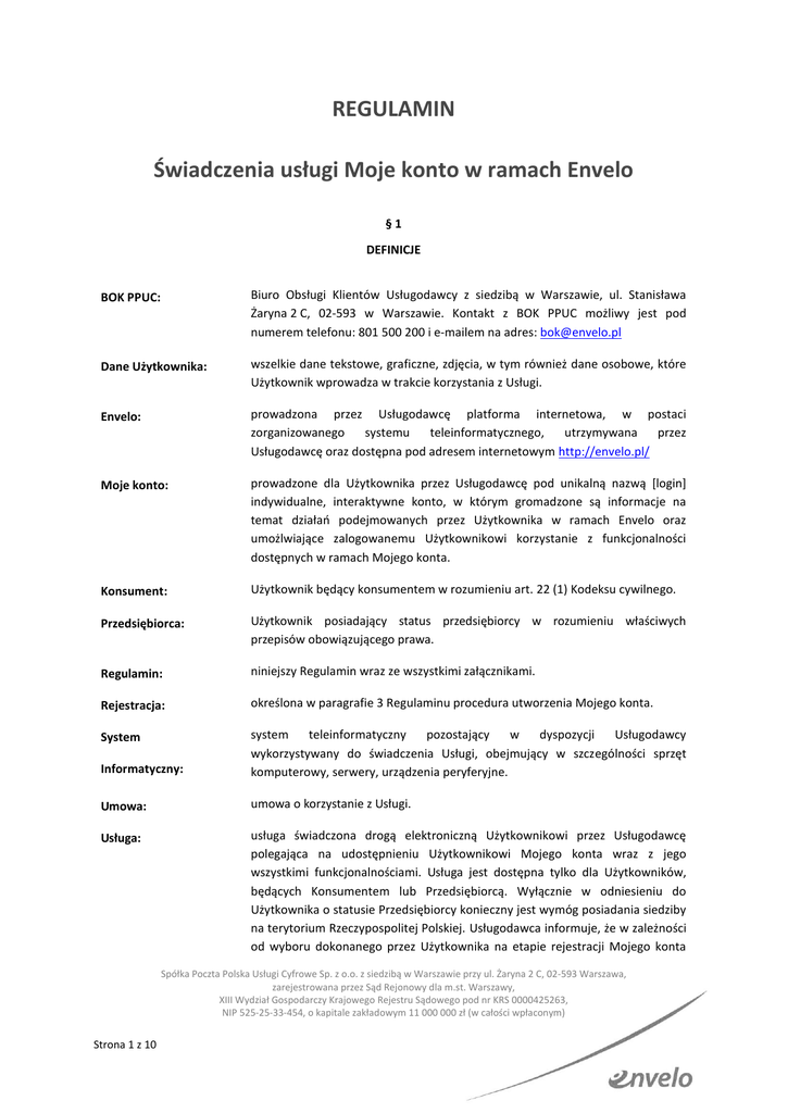 REGULAMIN Świadczenia usługi Moje konto w ramach Envelo §1 DEFINICJE BOK PPUC: Biuro Obsługi Klientów Usługodawcy z siedzibą w Warszawie, ul. Stanisława Żaryna 2 C, 02-593 w Warszawie. Kontakt z BOK PPUC możliwy jest pod numerem telefonu: 801 500 200 i e-mailem na adres: [email protected] Dane Użytkownika: wszelkie dane tekstowe, graficzne, zdjęcia, w tym również dane osobowe, które Użytkownik wprowadza w trakcie korzystania z Usługi. Envelo: prowadzona przez Usługodawcę platforma internetowa, w postaci zorganizowanego systemu teleinformatycznego, utrzymywana przez Usługodawcę oraz dostępna pod adresem internetowym http://envelo.pl/ Moje konto: prowadzone dla Użytkownika przez Usługodawcę pod unikalną nazwą [login] indywidualne, interaktywne konto, w którym gromadzone są informacje na temat działań podejmowanych przez Użytkownika w ramach Envelo oraz umożlwiające zalogowanemu Użytkownikowi korzystanie z funkcjonalności dostępnych w ramach Mojego konta. Konsument: Użytkownik będący konsumentem w rozumieniu art. 22 (1) Kodeksu cywilnego. Przedsiębiorca: Użytkownik posiadający status przedsiębiorcy w rozumieniu właściwych przepisów obowiązującego prawa. Regulamin: niniejszy Regulamin wraz ze wszystkimi załącznikami. Rejestracja: określona w paragrafie 3 Regulaminu procedura utworzenia Mojego konta. System Informatyczny: system teleinformatyczny pozostający w dyspozycji Usługodawcy wykorzystywany do świadczenia Usługi, obejmujący w szczególności sprzęt komputerowy, serwery, urządzenia peryferyjne. Umowa: umowa o korzystanie z Usługi. Usługa: usługa świadczona drogą elektroniczną Użytkownikowi przez Usługodawcę polegająca na udostępnieniu Użytkownikowi Mojego konta wraz z jego wszystkimi funkcjonalnościami. Usługa jest dostępna tylko dla Użytkowników, będących Konsumentem lub Przedsiębiorcą. Wyłącznie w odniesieniu do Użytkownika o statusie Przedsiębiorcy konieczny jest wymóg posiadania siedziby na terytorium Rzeczypospolitej Polskiej. Usługodawca informuje, że w zależności od wyboru dokonanego przez Użytkownika na etapie rejestracji Mojego konta Spółka Poczta Polska Usługi Cyfrowe Sp. z o.o. z siedzibą w Warszawie przy ul. Żaryna 2 C, 02-593 Warszawa, zarejestrowana przez Sąd Rejonowy dla m.st. Warszawy, XIII Wydział Gospodarczy Krajowego Rejestru Sądowego pod nr KRS 0000425263, NIP 525-25-33-454, o kapitale zakładowym 11 000 000 zł (w całości wpłaconym) Strona 1 z 10 pewne funkcjonalności dostępne w ramach korzystania z Usługi mogą być zróżnicowane dla Użytkownika będącego Konsumentem lub Użytkownika będącego Przedsiębiorcą. Usługodawca: Poczta Polska Usługi Cyfrowe Sp. z o.o. z siedzibą w Warszawie, ul. Stanisława Żaryna 2 C, 02-593 Warszawa, wpisaną do Rejestru Przedsiębiorców prowadzonego przez Sąd Rejonowy dla m.st. Warszawy w Warszawie, XIII Wydział Gospodarczy Krajowego Rejestru Sądowego, pod numerem KRS: 0000425263, kapitał zakładowy 11 000 000,00 zł, NIP: 525-25-33-454. Użytkownik: osoba fizyczna lub osoba prawna (w której imieniu działa osoba należycie upoważniona) posiadająca zdolność do czynności prawnych. W przypadku osób fizycznych nie posiadających zdolności do czynności prawnych lub osób fizycznych z ograniczoną zdolnością do czynności prawnych, Użytkownik powinien być należycie reprezentowany przez przedstawiciela ustawowego lub odpowiednio działać za zgodą takiego przedstawiciela ustawowego. Użytkownik może korzystać z Usługi w imieniu własnym, a w przypadku korzystania z Usługi w imieniu osoby trzeciej konieczne jest posiadanie w tym zakresie odpowiedniego upoważnienia. Użytkownik może korzystać z Usługi jako Konsument lub Przedsiębiorca. W powyższym celu Użytkownik w trakcie procedury korzystania z Usługi proszony jest o odpowiednie określenie swojego statusu. §2 POSTANOWIENIA WSTĘPNE 2.1. Na podstawie art. 8 ust. 1 pkt 1 ustawy z 18 lipca 2002 r. o świadczeniu usług drogą elektroniczną (Dz.U. nr 144, poz. 1204, z późn. zm.) Poczta Polska Usługi Cyfrowe Sp. z o.o. z siedzibą w Warszawie ustala niniejszy Regulamin świadczenia usług drogą elektroniczną. 2.2. Regulamin określa warunki i zasady korzystania przez Użytkowników z Usługi. 2.3. Każdy może nieodpłatnie zapoznać się z treścią Regulaminu. Treść Regulaminu można drukować, utrwalać oraz zwielokrotniać dowolną techniką na dowolnych nośnikach. 2.4. Regulamin jest udostępniony przed zawarciem Umowy w postaci pozwalającej na jego utrwalanie, przechowywanie i odtwarzanie. 2.5. Regulamin jest dostępny do przeglądania oraz pobrania na Envelo: http://envelo.pl/regulamin. w zakładce „Regulamin”. Dodatkowo, na żądanie Użytkownika, Usługodawca prześle Użytkownikowi kopię Regulaminu w postaci elektronicznej na wskazany przez Użytkownika adres poczty elektronicznej. 2.6. Korzystanie z Usługi jest nieodpłatne. 2.7. Korzystanie z Usługi jest dobrowolne. §3 ZAWARCIE UMOWY Spółka Poczta Polska Usługi Cyfrowe Sp. z o.o. z siedzibą w Warszawie przy ul. Żaryna 2 C, 02-593 Warszawa, zarejestrowana przez Sąd Rejonowy dla m.st. Warszawy, XIII Wydział Gospodarczy Krajowego Rejestru Sądowego pod nr KRS 0000425263, NIP 525-25-33-454, o kapitale zakładowym 11 000 000 zł (w całości wpłaconym) Strona 2 z 10 3.1. Umowa o świadczenie Usługi zostaje zawarta zgodnie z procedurą określoną w niniejszym rozdziale Regulaminu. 3.2. W celu zawarcia Umowy konieczna jest uprzednia Rejestracja Użytkownika za pośrednictwem elektronicznego formularza rejestracyjnego udostępnionego przez Usługodawcę pod adresem internetowym http://envelo.pl/rejestracja/ 3.3. W trakcie Rejestracji Użytkownik jest zobowiązany do dokonania wyboru spośród kolejnych interaktywnych pól formularza rejestracyjnego, a także do wpisania w odpowiednich polach formularza rejestracyjnego podstawowych danych koniecznych do świadczenia Usł