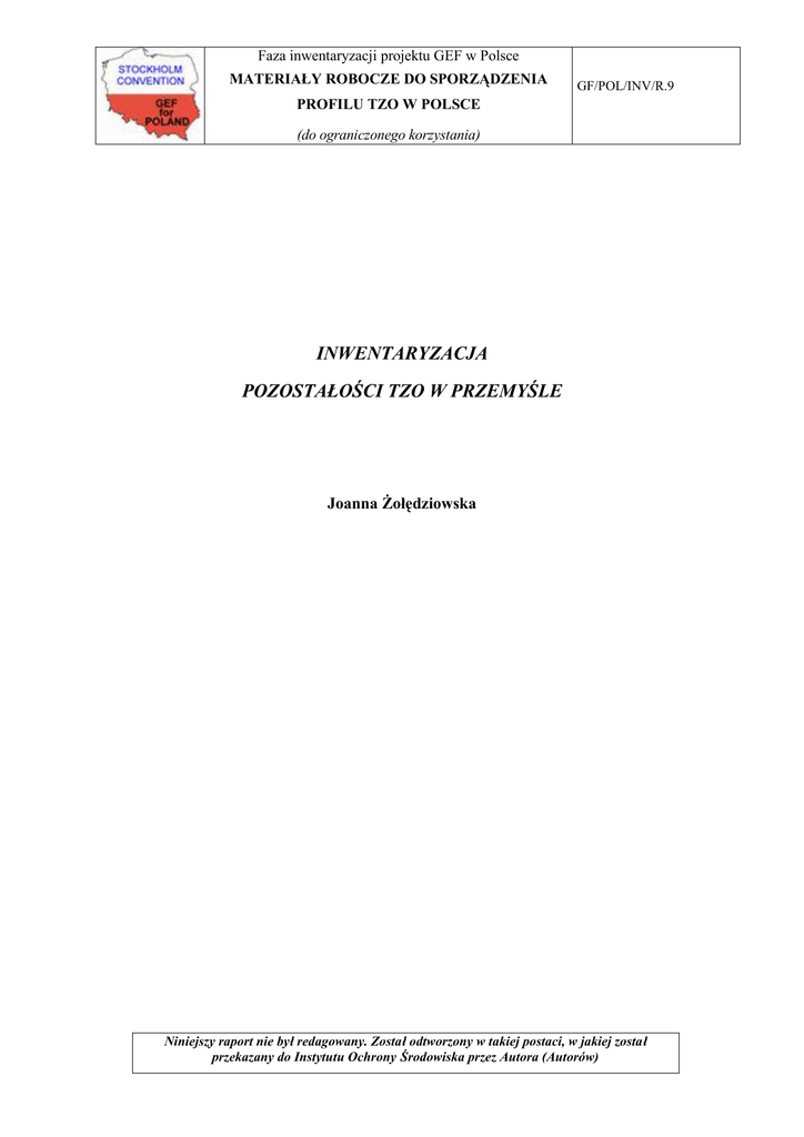 Faza inwentaryzacji projektu GEF w Polsce MATERIAŁY ROBOCZE DO SPORZĄDZENIA GF/POL/INV/R.9 PROFILU TZO W POLSCE (do ograniczonego korzystania) INWENTARYZACJA POZOSTAŁOŚCI TZO W PRZEMYŚLE Joanna Żołędziowska Niniejszy raport nie był redagowany. Został odtworzony w takiej postaci, w jakiej został przekazany do Instytutu Ochrony Środowiska przez Autora (Autorów) 1. WPROWADZENIE 10 grudnia 2000 r. w Johanesburgu przedstawiciele 122 państw uzgodnili tekst światowej konwencji w sprawie trwałych zanieczyszczeń organicznych, uchwalonej następnie podczas Konferencji Ministerialnej w Sztokholmie w dniu 23 maja 2001 r. Celem Konwencji, od miejsca uchwalenia nazywanej sztokholmską, jest ochrona życia i zdrowia ludzi oraz środowiska przed substancjami i produktami chemicznymi o udowodnionym negatywnym, nieodwracalnym wpływie na żywe organizmy. Związki te charakteryzują się znaczną trwałością w warunkach naturalnych, nie ulegają degradacji biologicznej, chemicznej ani fotochemicznej. Słabo rozpuszczając się w wodzie, a dobrze w tłuszczach, ulegają bioakumulacji w tkance tłuszczowej. Są średniolotne, a ich pary emitowane do powietrza mogą adsorbować się na zawieszonych tam cząstkach pyłów. Drogą powietrzną i przez wodę przenoszone są na duże odległości, co w konsekwencji doprowadziło w przeszłości do skażenia obszarów, w których nie wytwarzano ani nie stosowano takich związków. Konwencja Sztokholmska obejmuje 12 substancji i produktów chemicznych – indywidualnych związków chloroorganicznych lub ich mieszanin, wytypowanych przez United Nations Environment Programme, jako szczególnie niebezpieczne dla zdrowia ludzi i dla środowiska. Określa się je wspólnym mianem trwałych zanieczyszczeń organicznych (TZO). Związki takie, do których zalicza się wybrane pestycydy, produkty chemiczne o różnym zastosowaniu oraz niepożądane produkty uboczne procesów technologicznych, wyszczególniono w tabeli 1. Tabela 1. Wykaz substancji i produktów chemicznych (TZO) objętych Konwencją Sztokholmską. Pestycydy Produkty chemiczne Niepożądane produkty uboczne procesów technologicznych 1 2 3 Aldryna Heksachlorobenzen (HCB) Polichlororowane dibenzo-p-dioksyny (PCDD) Chlordan Polichlorowane bifenyle (PCB) Polichlororowane dibenzofurany (PCDF) DDT Polichlorowane bifenyle (PCB) Dieldryna Heksachlorobenzen (HCB) Endryna Heptachlor Heksachlorobenzen (HCB) Mireks Toksafen 2 Postanowienia Konwencji zobowiązują rządy państw – sygnatariuszy między innymi do wprowadzenia zakazu lub radykalnego ograniczenia produkcji, stosowania i importu pestycydów zaliczonych do TZO, równocześnie wymagając bezpiecznej likwidacji ich zmagazynowanych zapasów i odpadów pozostających na składowiskach. Ocena stanu pozostałości TZO, zaliczanych do pestycydów (kolumna 1 załączonej tabeli), w tym heksachlorobenzenu, klasyfikowanego również w pozostałych grupach omawianych związków stanowi przedmiot niniejszego opracowania. Krótką charakterystykę tych związków, z wyjątkiem dieldryny i mireksu, opracowaną na podstawie kart bezpieczeństwa, opublikowanych przez Międzynarodową Organizację Pracy, przedstawiono w załączniku. Dla dieldryny i mireksu karty takie nie były wydane. Obecnie żaden z pestycydów, których dotyczą postanowienia Konwencji Sztokholmskiej nie jest w Polsce wytwarzany ani stosowany. Nie stanowi również przedmiotu importu do naszego kraju. Kwestia dopuszczania do obrotu i stosowania pestycydów jest prawnie regulowana w Polsce od lat sześćdziesiątych ubiegłego wieku. Podstawę regulacji w tym zakresie stanowiła ustawa z dnia 16 lutego 1961 r. o ochronie roślin uprawnych przed chorobami, szkodnikami chwastami (Dz. U. Nr 10, poz.55 z późniejszymi zmianami) wraz z aktem wykonawczym – zarządzeniem Ministra Rolnictwa z dnia 22 kwietnia 1965 r. w sprawie warunków i trybu udzielania zezwoleń na dopuszczenie do obrotu chemicznych środków ochrony roślin (M.P. Nr 28, poz. 156). Z mocy tego rozporządzenia, począwszy od roku 1966, publikowane były w Dzienniku Urzędowym Ministerstwa Rolnictwa obwieszczenia w sprawie wykazu chemicznych środków ochrony roślin dopuszczonych do obrotu handlowego w danym roku. Wykaz zawierał informacje o formie użytkowej, składzie i producencie każdego preparatu. Obwieszczenia ukazywały się corocznie do początków lat dziewięćdziesiątych, z wyjątkiem lat 1981 – 1983. Obecnie obowiązuje ustawa z dnia 12 lipca 1995 r. o ochronie roślin uprawnych (Dz. U. Nr 90, poz. 446 z późniejszymi zmianami). Akt ten reguluje miedzy innymi kwestie związane z zapobieganiem zagrożeniom dla zdrowia ludzi i zwierząt oraz dla środowiska, które mogą powstać w wyniku obrotu i stosowania środków ochrony roślin, upoważniając Ministra Rolnictwa i Rozwoju Wsi do określenia szczegółowych wymagań w tym zakresie. Z mocy powyższej delegacji ustawowej opublikowane zostało rozporządzenie Ministra Rolnictwa i Rozwoju Wsi z dnia 5 marca 2002 r. w sprawie szczegółowych zasad wydawania zezwoleń na dopuszczanie środków ochrony roślin do obrotu i stosowania (Dz. U. Nr 24, poz. 250). W rozporządzeniu zamieszczona została lista substancji biologicznie czynnych wchodzących w skład środków ochrony roślin, których stosowanie w Polsce jest zabronione. W wykazie tym 3 znajdują się wszystkie pestycydy objęte postanowieniami Konwencji Sztokholmskiej. Rozporządzenie weszło w życie z dniem 2 kwietnia br. Należy ponadto zwrócić uwagę na fakt, że prawny zakaz stosowania omawianych TZO obowiązywał już wcześniej, a jego podstawę stanowiło rozporządzenie Ministra Rolnictwa i Gospodarki Żywnościowej z dnia 12 marca 1996 r. w sprawie szczegółowych zasad wydawania zezwoleń na dopuszczanie środków ochrony roślin do obrotu i stosowania (Dz. U. Nr 48, poz. 212), które zostało uchylone w wydanym w bieżącym roku akcie legislacyjnym w tej samej sprawie. 2. PRODUKCJA W P