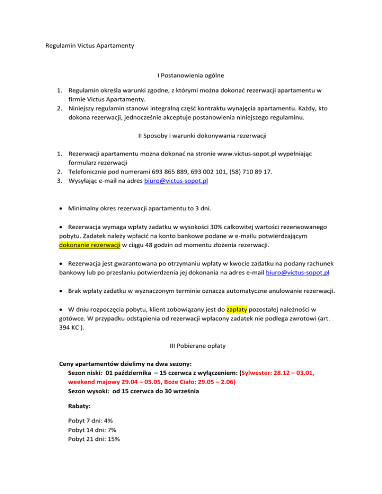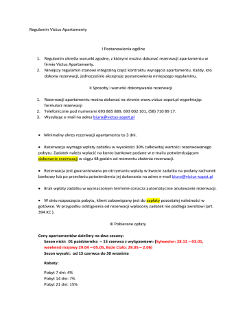 Regulamin Victus Apartamenty I Postanowienia ogólne 1. Regulamin określa warunki zgodne, z którymi można dokonać rezerwacji apartamentu w firmie Victus Apartamenty. 2. Niniejszy regulamin stanowi integralną część kontraktu wynajęcia apartamentu. Każdy, kto dokona rezerwacji, jednocześnie akceptuje postanowienia niniejszego regulaminu. II Sposoby i warunki dokonywania rezerwacji 1. Rezerwacji apartamentu można dokonać na stronie www.victus-sopot.pl wypełniając formularz rezerwacji 2. Telefonicznie pod numerami 693 865 889, 693 002 101, (58) 710 89 17. 3. Wysyłając e-mail na adres [email protected] Minimalny okres rezerwacji apartamentu to 3 dni. Rezerwacja wymaga wpłaty zadatku w wysokości 30% całkowitej wartości rezerwowanego pobytu. Zadatek należy wpłacić na konto bankowe podane w e-mailu potwierdzającym dokonanie rezerwacji w ciągu 48 godzin od momentu złożenia rezerwacji. Rezerwacja jest gwarantowana po otrzymaniu wpłaty w kwocie zadatku na podany rachunek bankowy lub po przesłaniu potwierdzenia jej dokonania na adres e-mail [email protected] Brak wpłaty zadatku w wyznaczonym terminie oznacza automatyczne anulowanie rezerwacji. W dniu rozpoczęcia pobytu, klient zobowiązany jest do zapłaty pozostałej należności w gotówce. W przypadku odstąpienia od rezerwacji wpłacony zadatek nie podlega zwrotowi (art. 394 KC ). III Pobierane opłaty Ceny apartamentów dzielimy na dwa sezony: Sezon niski: 01 października – 15 czerwca z wyłączeniem: (Sylwester: 28.12 – 03.01, weekend majowy 29.04 – 05.05, Boże Ciało: 29.05 – 2.06) Sezon wysoki: od 15 czerwca do 30 września Rabaty: Pobyt 7 dni: 4% Pobyt 14 dni: 7% Pobyt 21 dni: 15% Od 19.08.2013 – 30.09.2013: ceny apartamentów zostają zmniejszone o 30% 1. Sprzątanie końcowe opłata 60 PLN 2. Opłata z tytułu użyczenia pościeli i ręczników 8 PLN/os 3. Zakwaterowanie w godzinach: 20:00 – 22:00 opłata 50 PLN 22:00 – 24:00 opłata 80 PLN 24:00 – 2:00 opłata 100 PLN 4. Wykwaterowanie w godzinach: 5:00 – 8:00/9:00 opłata 80 PLN IV Przyjazdy / Odbiór kluczy 1. Doba hotelowa od godziny 15:00 do 11:00. 2. Przyjazd powinien nastąpić w godzinach 15:00-20:00, jeżeli następuje później istnieje konieczność dopłacenia wymienionych w punkcie III opłat. 3. Na dzień przed przyjazdem skontaktuje się Państwem nasz pracownik w celu ustalenia godziny przekazania kluczy do Apartamentu. 4. Przekazanie kluczy do apartamentu może nastąpić od godziny 15:00 (jeżeli istnieje taka możliwość, po wcześniejszym uzgodnieniu z osobą odpowiedzialną za przekazanie kluczy, można je odebrać wcześniej). 5. Przekazanie kluczy do apartamentu nastąpi bezpośrednio w biurze firmy Victus Apartamenty, ul. Dworcowa ½ w Sopocie. V Wyjazdy 1. Opuszczenie apartamentu powinno nastąpić w godzinach 9:00 - 11:00. 2. Goście zobowiązani są do poinformowania pracownika firmy Victus, dzień przed wyjazdem, o chęci opuszczenia apartamentu przed godziną 9:00. 3. Przekazanie kluczy pracownikom firmy Victus Apartamenty po godzinie 11:00 traktowane będzie jako koszty najmu kolejnej doby i liczone według obowiązującego cennika. VI Zmiany w rezerwacji / Anulowanie rezerwacji 1. 2. Możliwość zmiany terminu rezerwacji istnieje wyłącznie za zgodą firmy Victus. Przedłużenie pobytu należy zgłosić pracownikowi firmy Victus najpóźniej do godziny 17:00 w dniu poprzedzającym ostatni dzień dokonanej rezerwacji. Przedłużenie pobytu możliwe będzie, w przypadku gdy Victus Apartamenty dysponować będzie wolnymi apartamentami. 3. 4. 5. 6. 7. W przypadku wcześniejszego opuszczenia apartamentu przez rezerwującego (lub późniejszego przybycia), bez względu na powód, firma Victus Apartamenty nie zwraca pieniędzy za niewykorzystany pobyt. W przypadku skrócenia pobytu na krócej niż 48 godzin przed planowanym przyjazdem, Klient zobowiązany jest do pokrycia 50% kosztów noclegów, z których zrezygnował. W przypadku rezygnacji z rezerwacji po wpłacie przedpłaty, zaksięgowana kwota nie podlega zwrotowi. Firma Victus zastrzega sobie prawo do zmiany zarezerwowanego apartamentu na inny o podobnym standardzie z zachowaniem pierwotnej kwoty rezerwacji, w przypadku niemożliwych do przewidzenia okoliczności, których skutków nie można natychmiast zlikwidować. Victus Apartamenty ma prawo, w przypadku wystąpienia zjawisk mających charakter siły wyższej anulować umowę. Dotyczy to również przypadków, w których bezpieczeństwo osobiste klienta lub jego majątku, z powodów niezależnych od firmy Victus Apartamenty, nie będzie mogło być zagwarantowane. Kwoty wpłacone przez klienta podlegają natychmiastowemu zwrotowi, z potrąceniem kwot należnych za usługi już wyświadczone. VII Obowiązki klienta 1. 2. 3. 4. 5. 6. Klient zobowiązany jest do natychmiastowego poinformowania pracowników firmy Victus o ewentualnych uszkodzeniach i brakach zastanych w apartamencie oraz do zgłoszenia szkód wyrządzonych przez siebie podczas pobytu. W przypadku przekroczenia deklarowanej w karcie zgłoszeniowej liczby osób korzystających z apartamentu, Victus Apartamenty zastrzega sobie prawo do natychmiastowego zerwania umowy bez obowiązku zwrotu kwoty należności z tytułu pozostałego okresu rezerwacji. W apartamentach obowiązuje bezwzględny zakaz palenia papierosów i świeczek. W przypadku naruszenia tego zakazu Victus Apartamenty zastrzega sobie prawo do natychmiastowego zerwania umowy bez obowiązku zwrotu kwoty należności z tytułu pozostałego okresu rezerwacji. Klient zobowiązany jest do pozostawienia obiektu w stanie nie pogorszonym w stosunku do stanu zastanego. Klient w przypadku zniszczenia, trwałego zabrudzenia lub uszkodzenia mienia, wynikłego z niewłaściwego użytkowania, będzie zobowiązany do przywrócenia stanu poprzedniego lub wypłaty odszkodowania zgodnie z wyceną firmy Victus. We wszystkich apartamentach obowiązuje cisza nocna między godziną 22:00 a 7:00 VIII P
