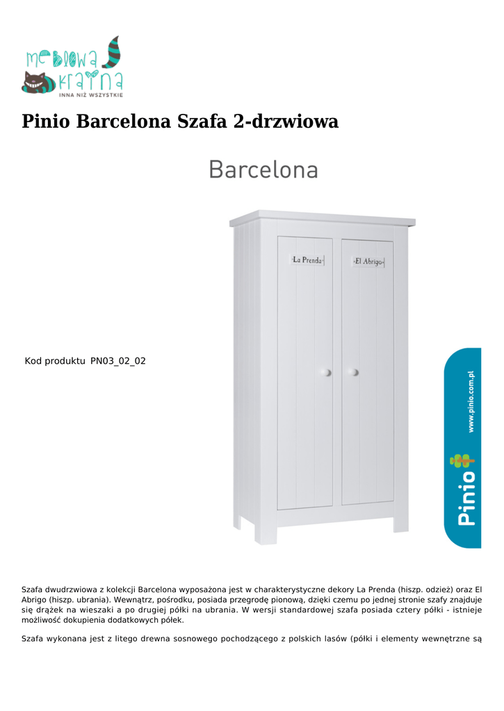 Pinio Barcelona Szafa 2-drzwiowa Kod produktu PN03_02_02 Szafa dwudrzwiowa z kolekcji Barcelona wyposażona jest w charakterystyczne dekory La Prenda (hiszp. odzież) oraz El Abrigo (hiszp. ubrania). Wewnątrz, pośrodku, posiada przegrodę pionową, dzięki czemu po jednej stronie szafy znajduje się drążek na wieszaki a po drugiej półki na ubrania. W wersji standardowej szafa posiada cztery półki - istnieje możliwość dokupienia dodatkowych półek. Szafa wykonana jest z litego drewna sosnowego pochodzącego z polskich lasów (półki i elementy wewnętrzne są wykonane z płyty laminowanej) . Została pomalowana ekologicznymi farbami wodnymi, dzięki czemu zapewniono mu prawidłowy proces oddychania oraz wyeliminowano czynnik mogący powodować u dzieci alergie. Pasuje zarówno do pokoiku chłopca, jak i dziewczynki. Czas oczekiwania: 4-6 tygodni. Wymiary: 96 cm x 56 cm x 185 cm (długość x szerokość x wysokość) Konstrukcja: drewno sosnowe, półki, przegroda, wieniec dolny - płyta laminowana. Kolorystyka: biały, perłowy. Gwarancja: 24 miesiące. Mebel do samodzielnego montażu.